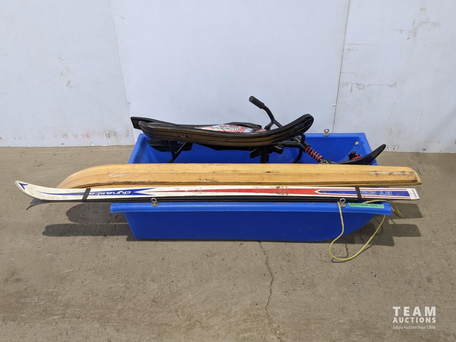 Dynasta BT220 fiberglass skis, water skis, Polaris SnowMoto GT, poly sled 24 inch w x 48 inch l x 10 inch d