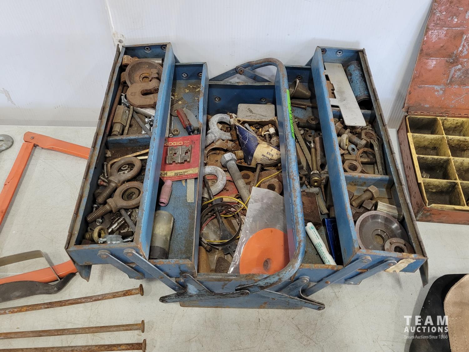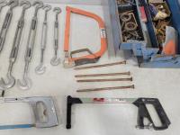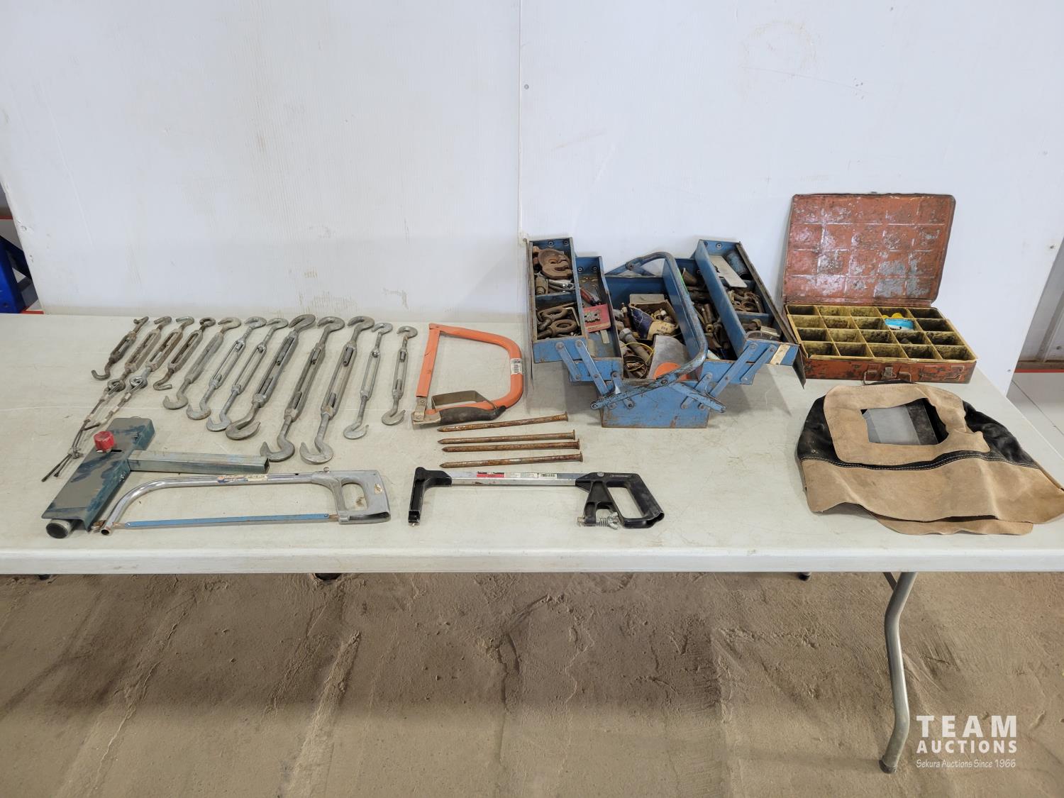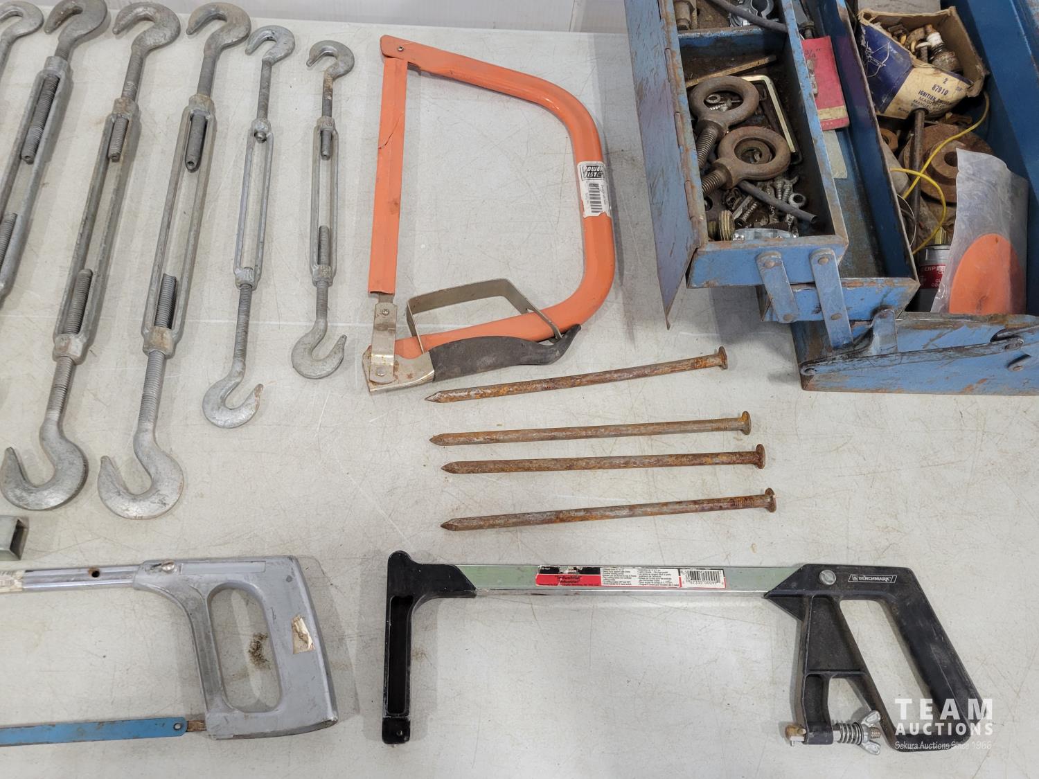 (12) hook turnbuckles, (3) hack saws, (1) toolbox with contents, parts organizer, sandblasting helmet