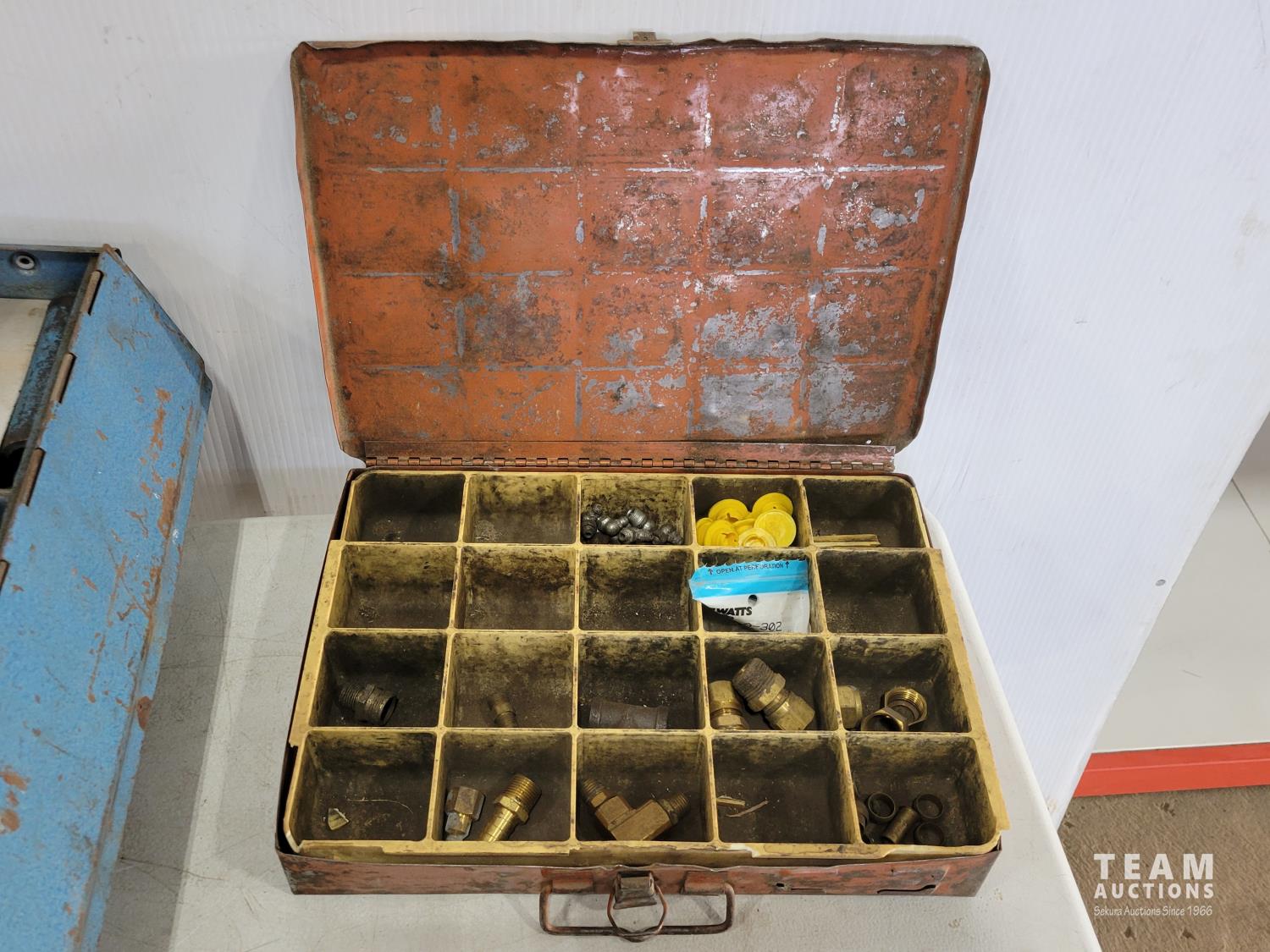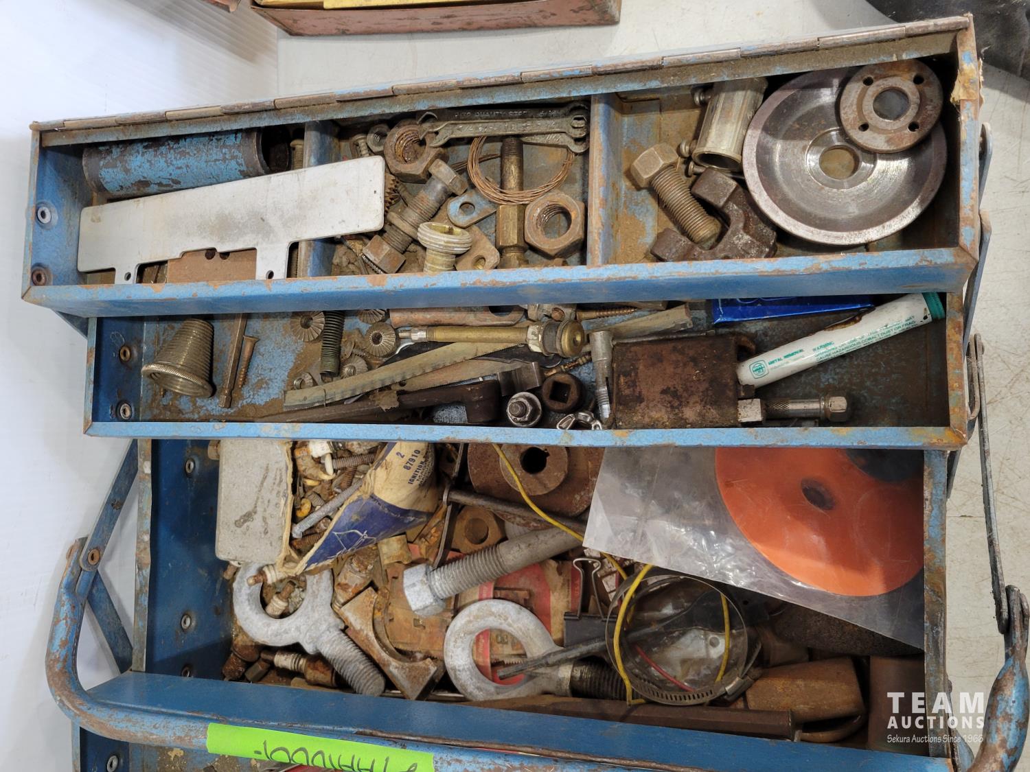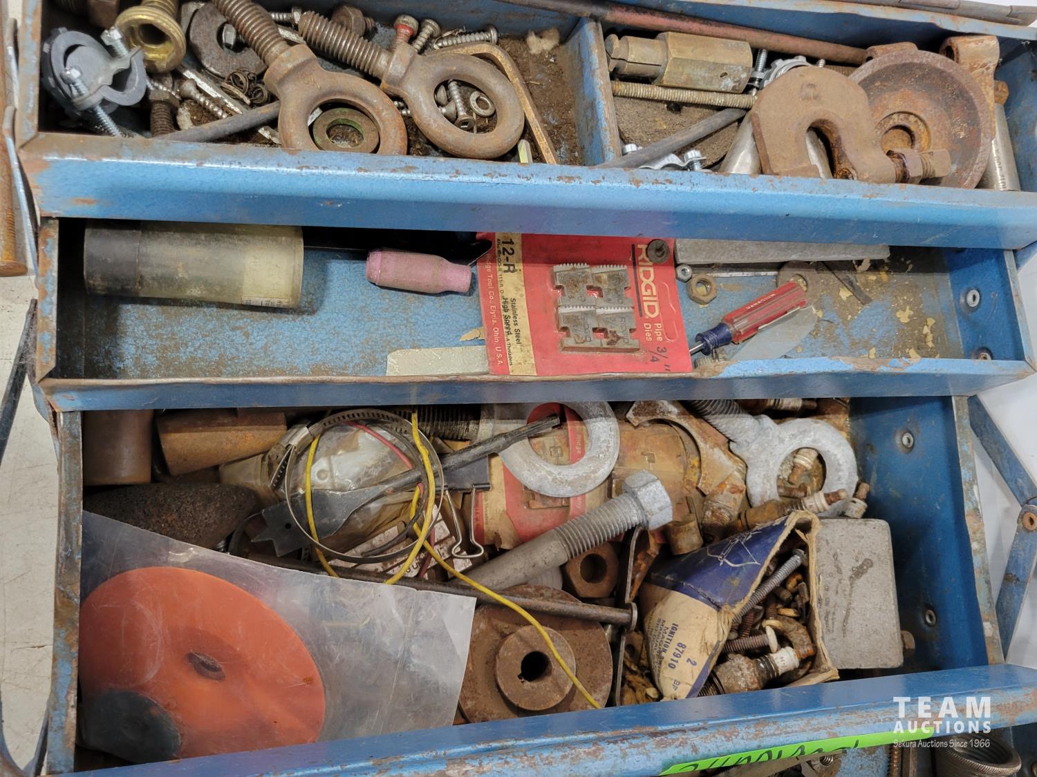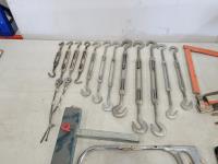 (12) hook turnbuckles, (3) hack saws, (1) toolbox with contents, parts organizer, sandblasting helmet