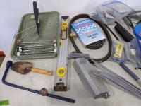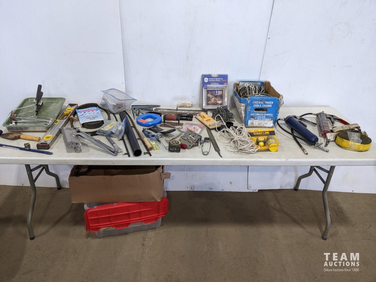 brackets, (2) grease guns, heavy door hinges, trowels, cable chains