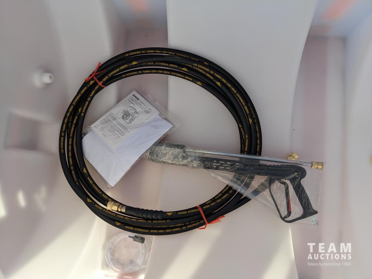 14 HP Kohler engine, electric start, oil fired, triplex plunger pump, 33 ft high-pressure hose, (2) work lights