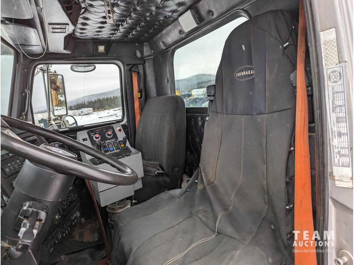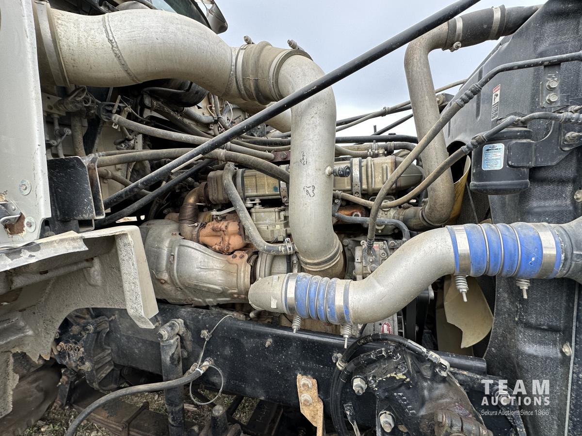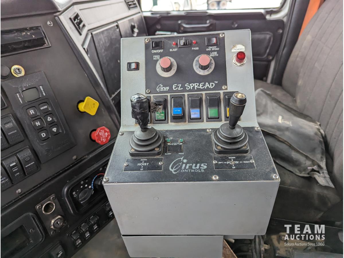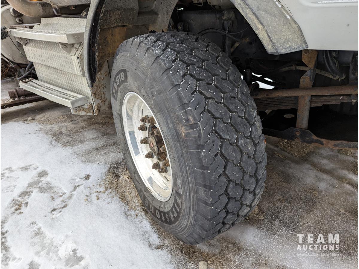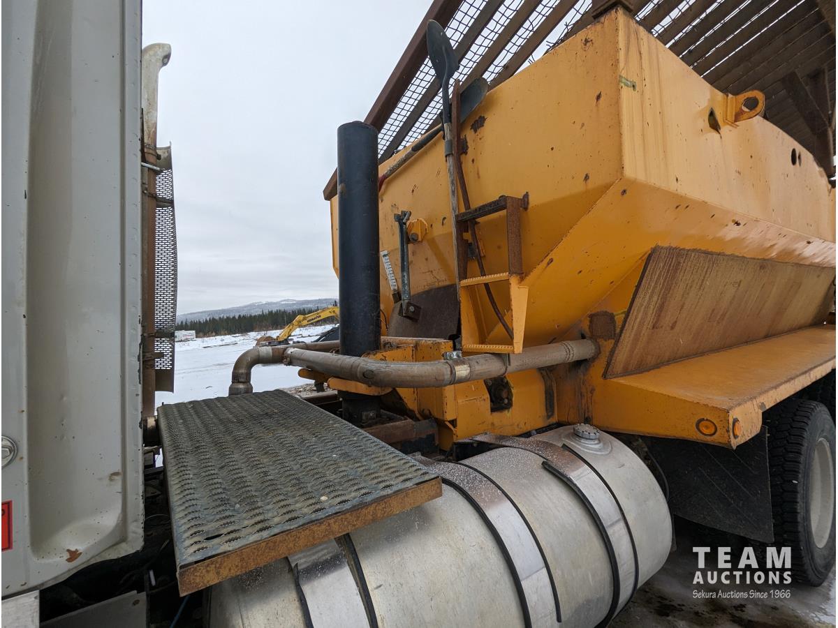 Detroit 15.6 L 6 cylinder diesel engine, engine brake, engine block heater, automatic transmission, A/C, cruise control, radio, heated sander box, mid plow, air ride suspension, 20,000 lb front axle, 66,000 lb rear axles, 3 way diff locks, 318 inch WB, all aluminum wheels, 425/65R22.5 front tires, 11R24.5 rear tires