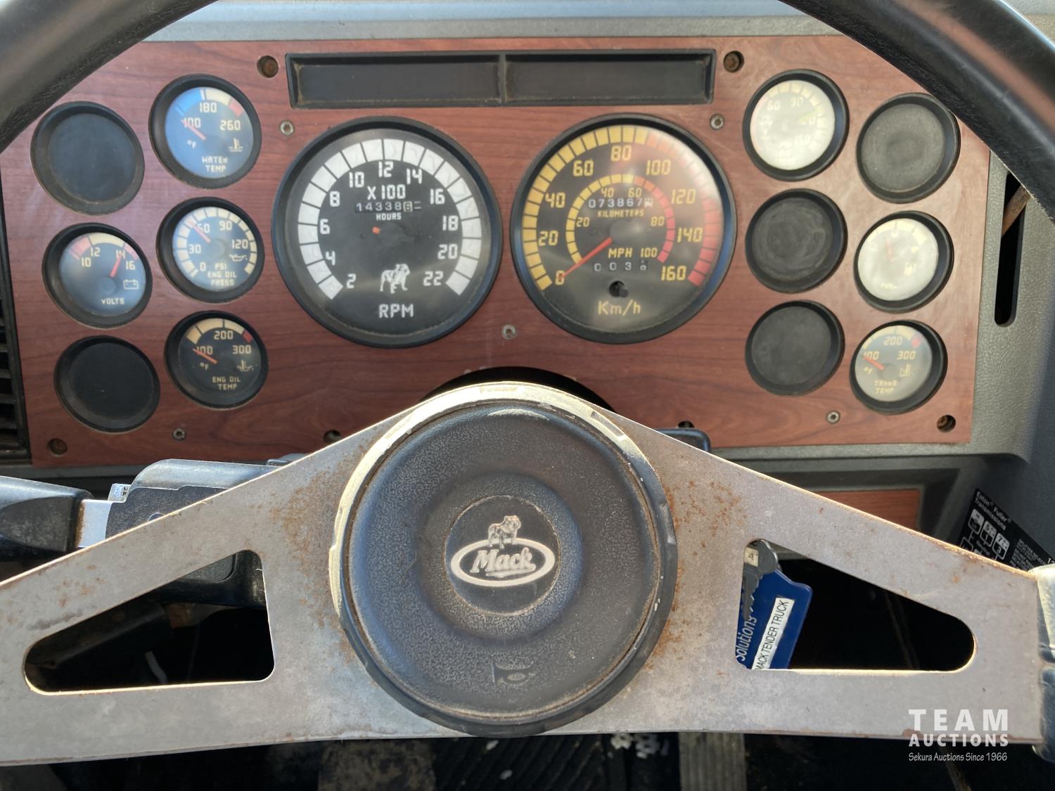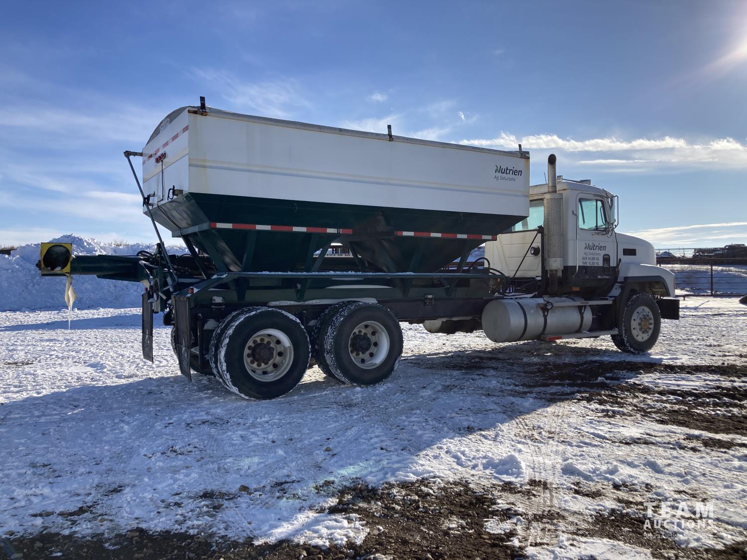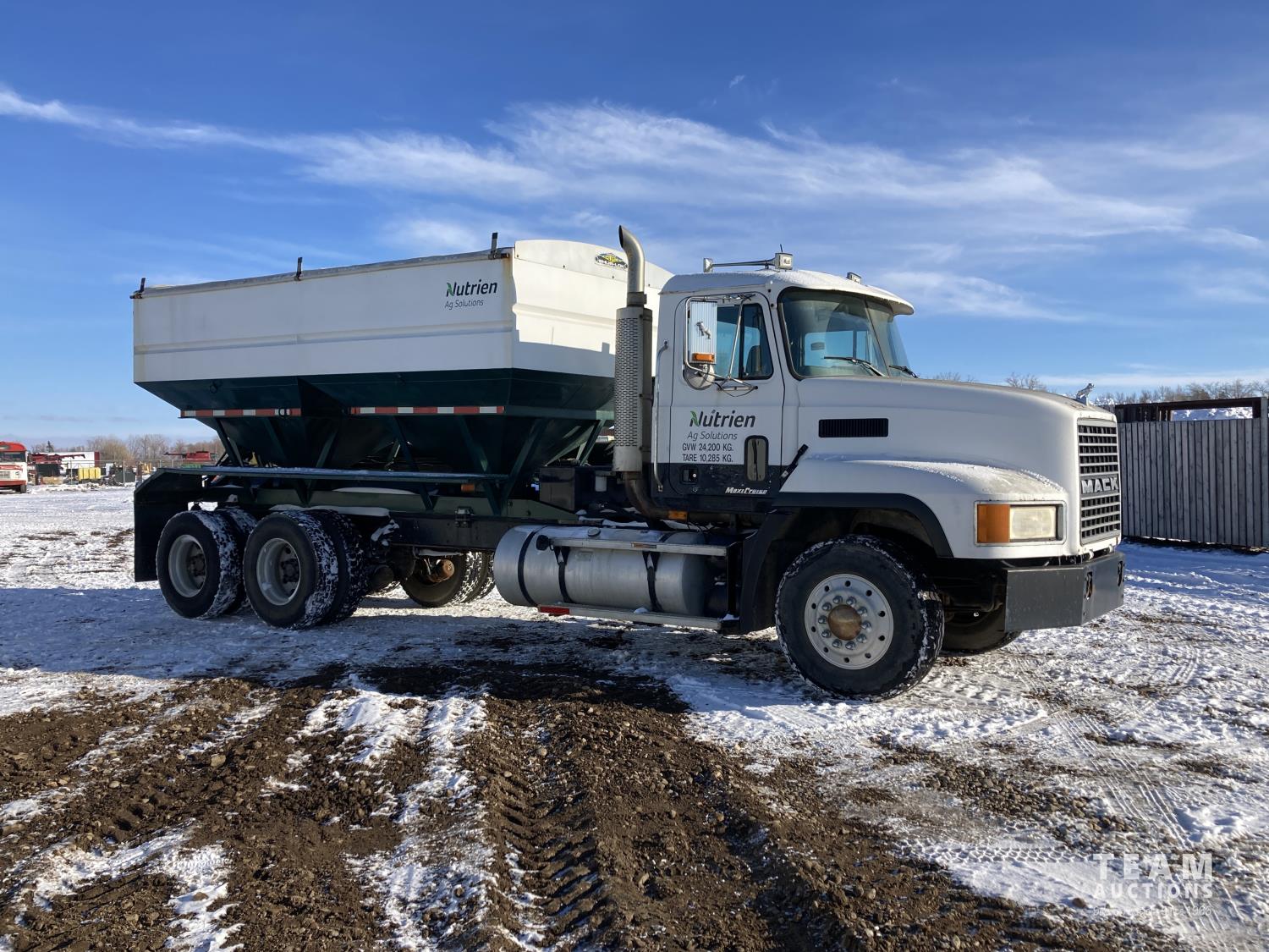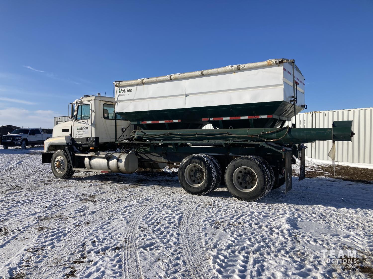 Mack 12 L 6 cylinder 355 HP diesel engine, Eaton Fuller 13 speed manual transmission, A/C, cruise control, air ride driver seat, stereo, hydraulic wet kit, 16 ft x 8 ft box, manual roll tarp, 9.5 inch auger, air ride suspension, 240 inch WB, all aluminum wheels, 315/80R22.5 front tires, 11R22.5 rear tires