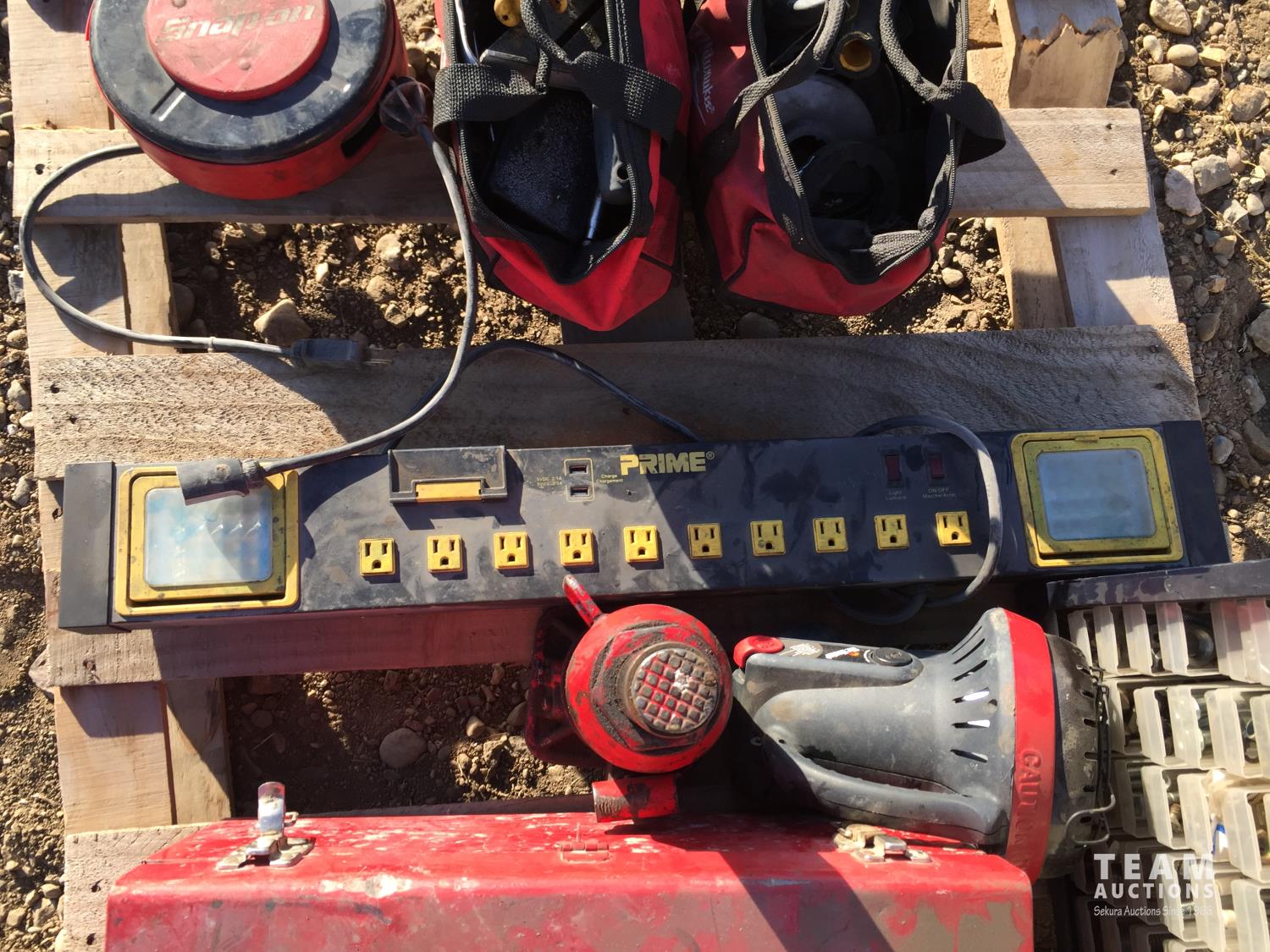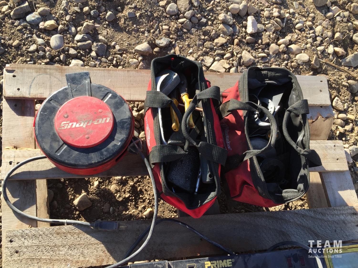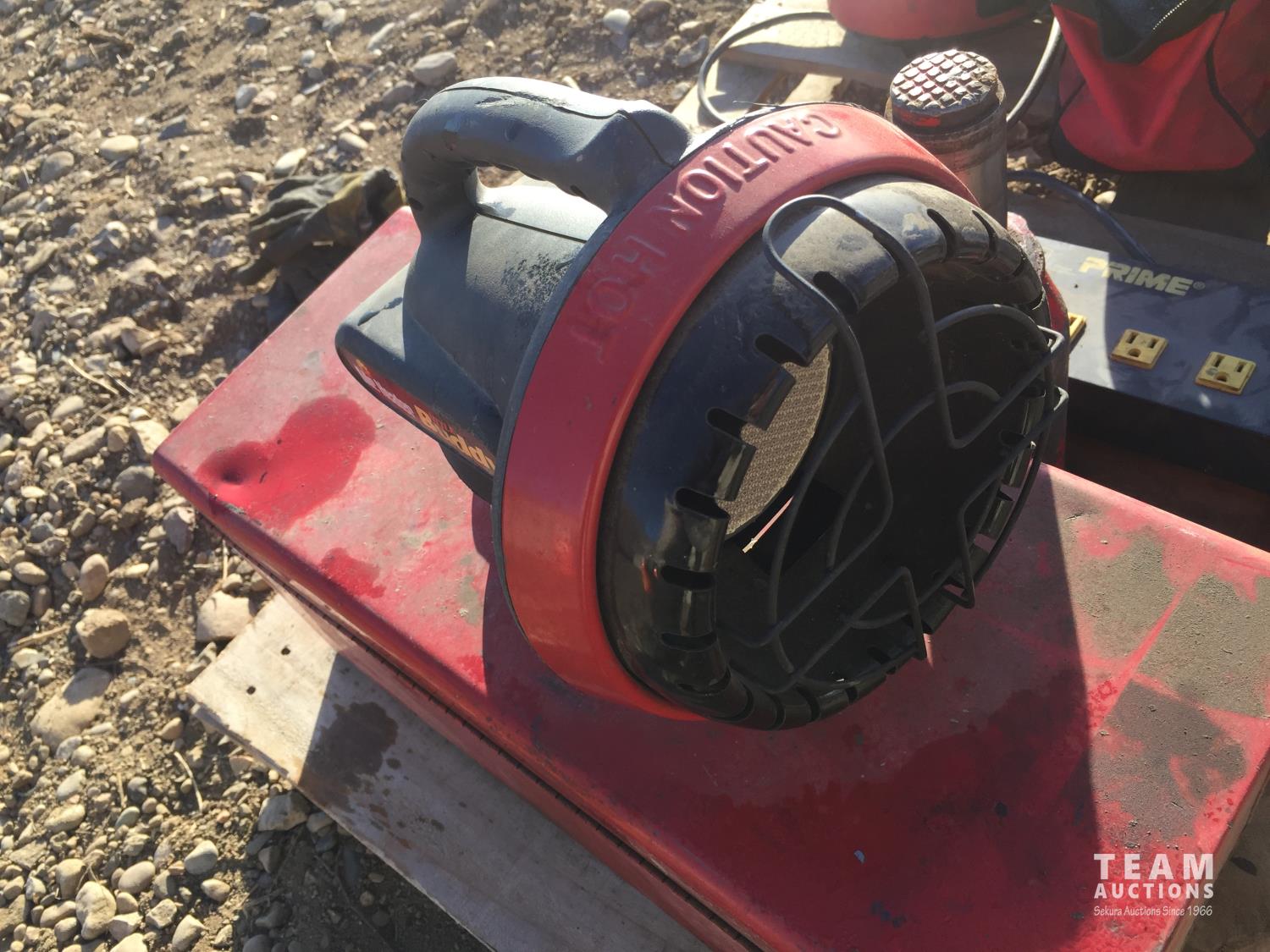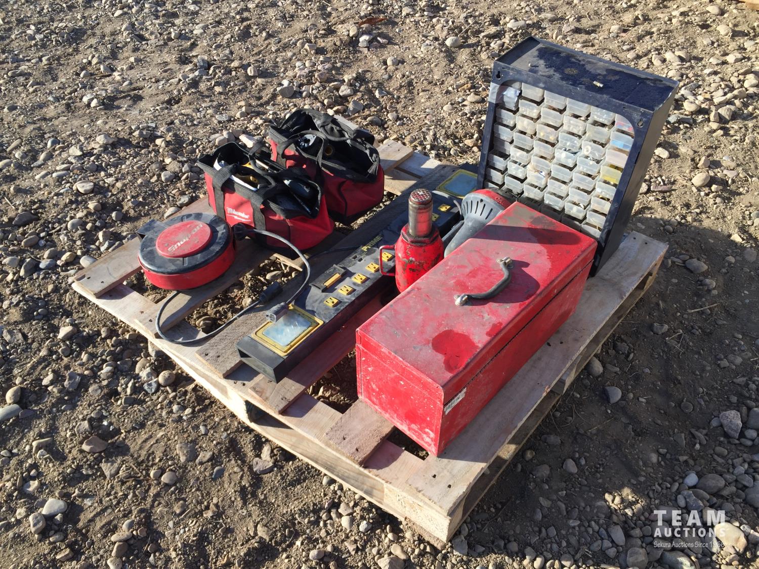Propane space heater, power bar, hydraulic jack, small parts organizer & Snap-on retractable extension cord