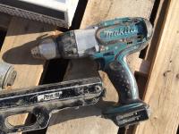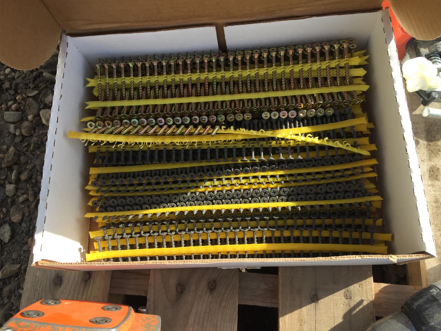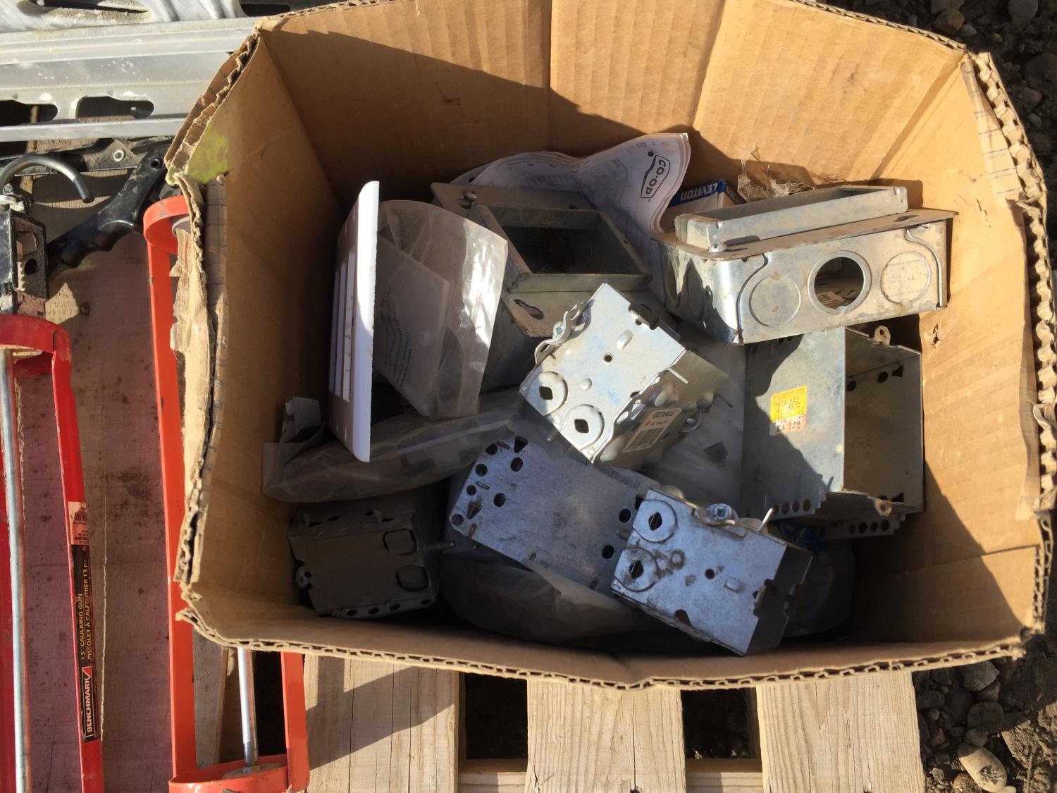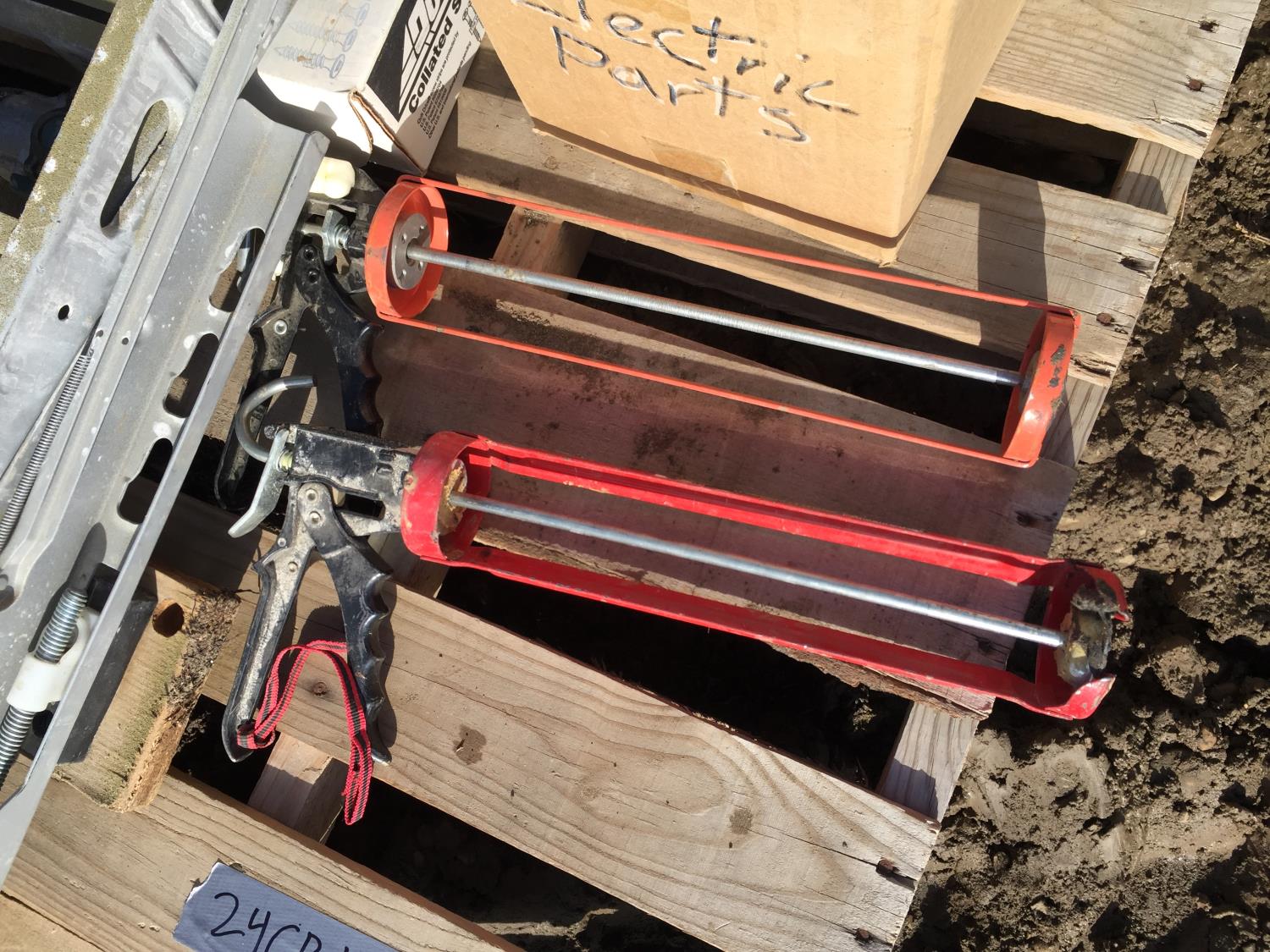 saw table, air nailer, caulking guns, conduit boxes, flooring screws
