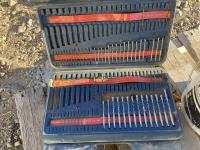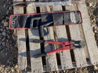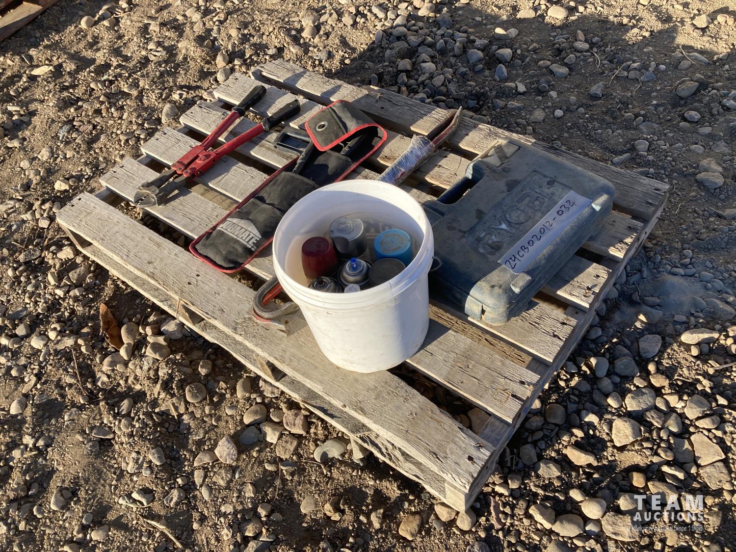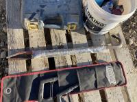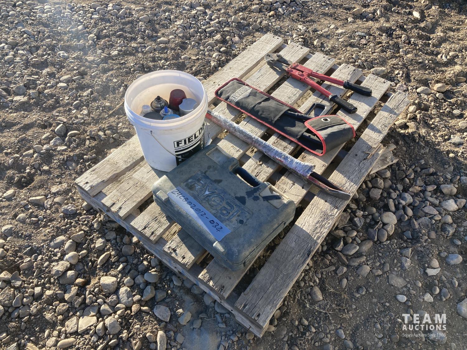 Partial set of Ryobi drill bits, bolt cutters, (2) pry bars, hand saw & aerosol paint