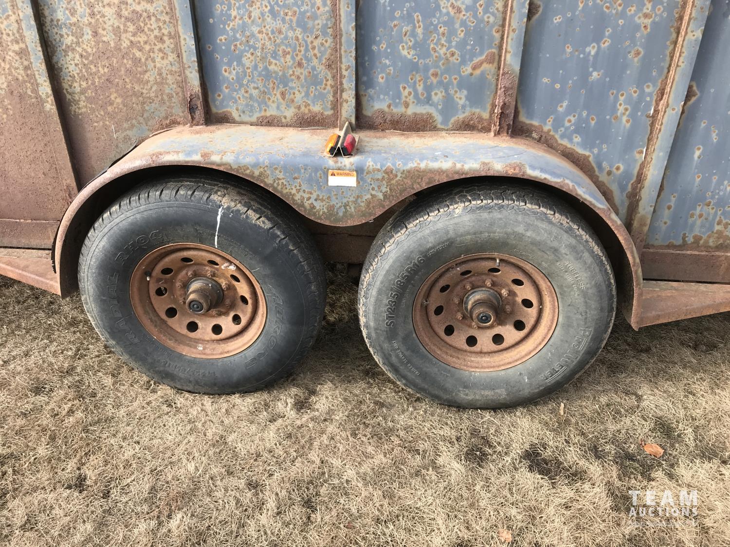 inside measurements 80 inch wide, 78 inch high, righthand man door, center divider with sliding door, front storage over 5TH wheel, rubber floor mats, rear full swing door with sliding gate, torsion axles, 235/85R16 tires