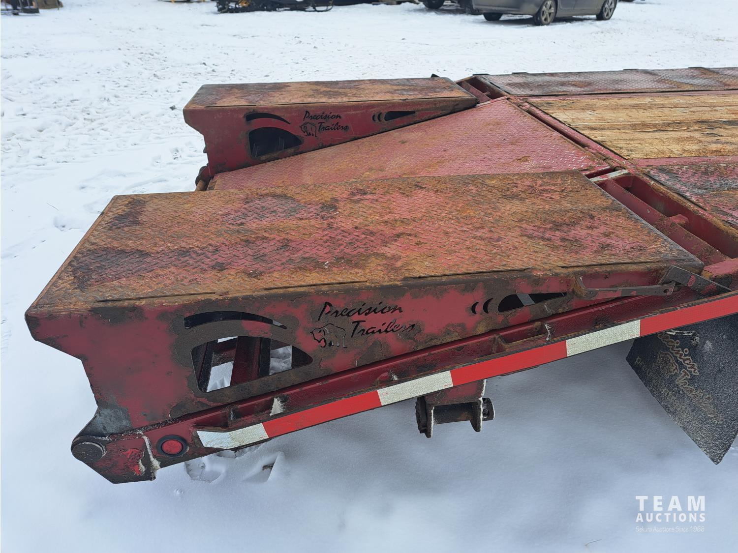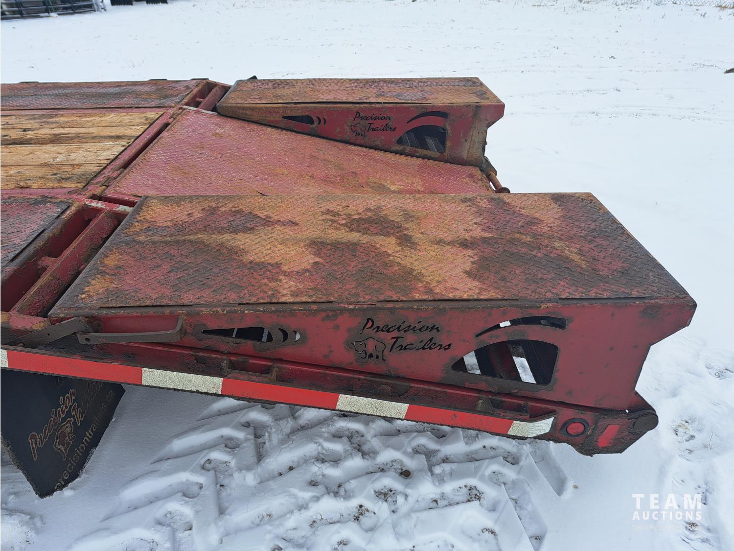 96 inch wide deck, 60 inch beaver tails, wood deck, flip over with spring assist ramps, electric brakes, spring suspension, tool / storage box, rub rails, stake pockets, spare tire, document tube, adjustable king pin, side step, cargo winches, 10000 lb axles, 235/80R16 tires