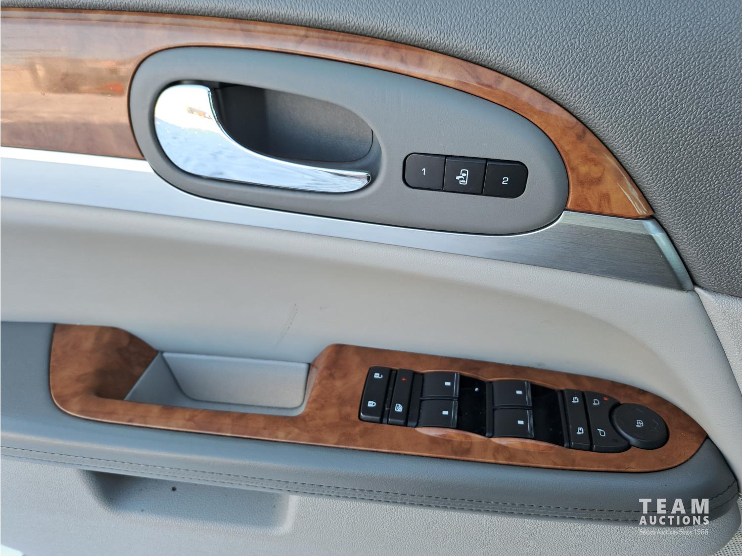 3.6 L, V6, gas, 6 speed automatic transmission, leather, P/W, P/L, A/C, navigation system, heated mirrors, 3rd row seating, DVD player, 275 HP, heated and cooled seats, cruise control, Bluetooth and On Star capabilities, sliding console armrest, voice activated command, dash clock, rear folding and removable seats, power mirrors, 2 glass sunroofs, tilt and telescopic steering wheel, Bose speakers, 2 key fobs, wheel lock socket, Weather Tech floor matts, rear climate control, 4 factory original 19 inch chrome rims, 255/55R20 tires