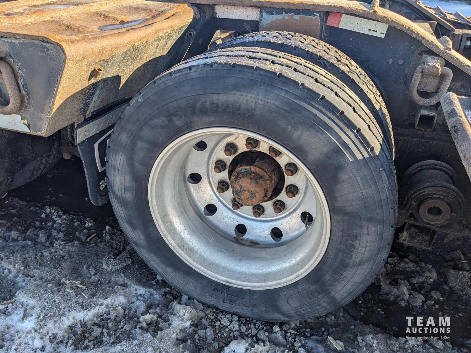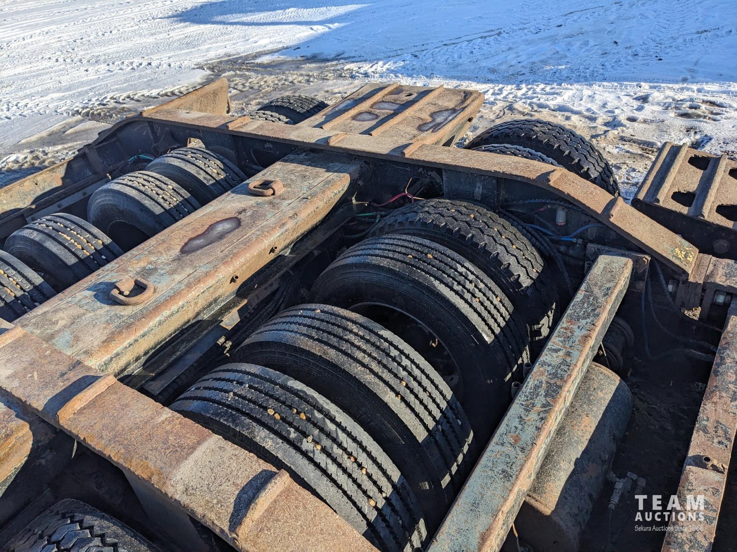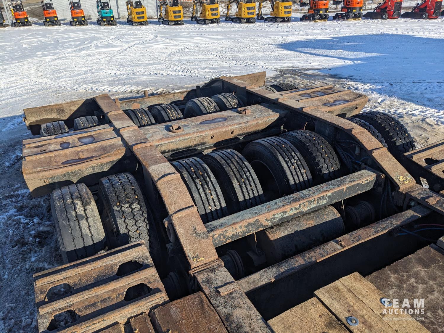 31 ft long x 11 Ft 6 inch wide center deck, 48 inch hydraulic neck extension, swing out deck extenders, swing out marker lights beavertail, air ride suspension, plumbed for booster, 275/70R22.5 tires, air brakes, hydraulic power pack with electric start gas engine,