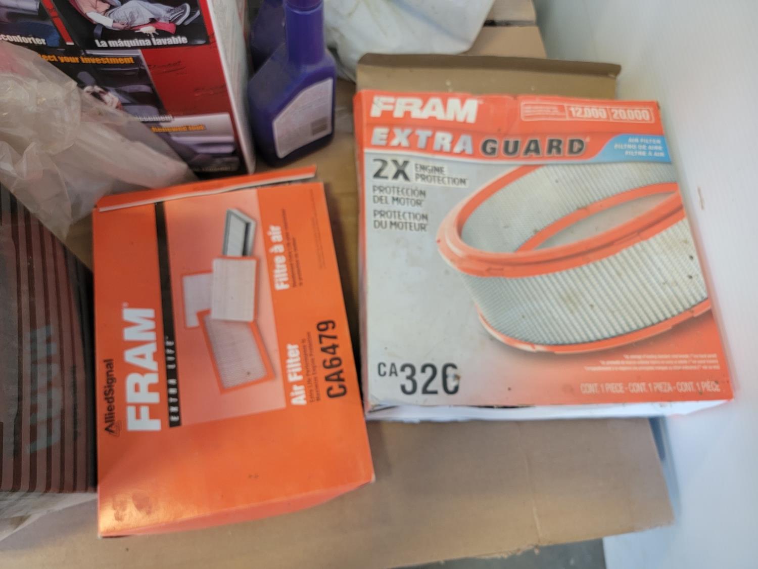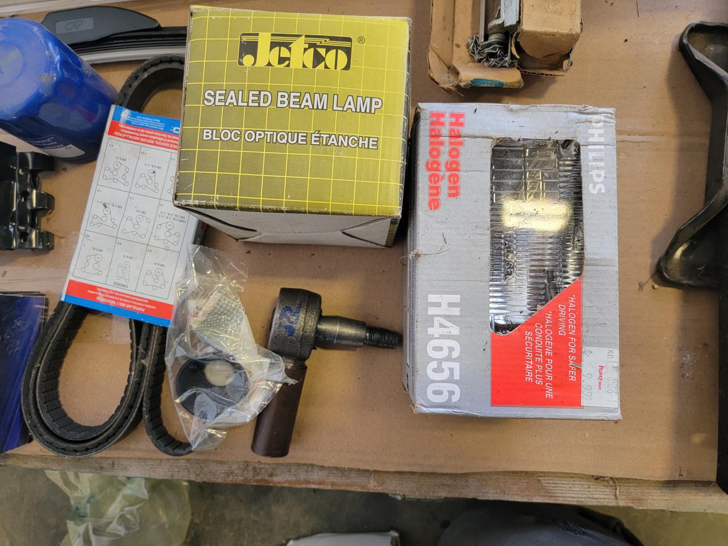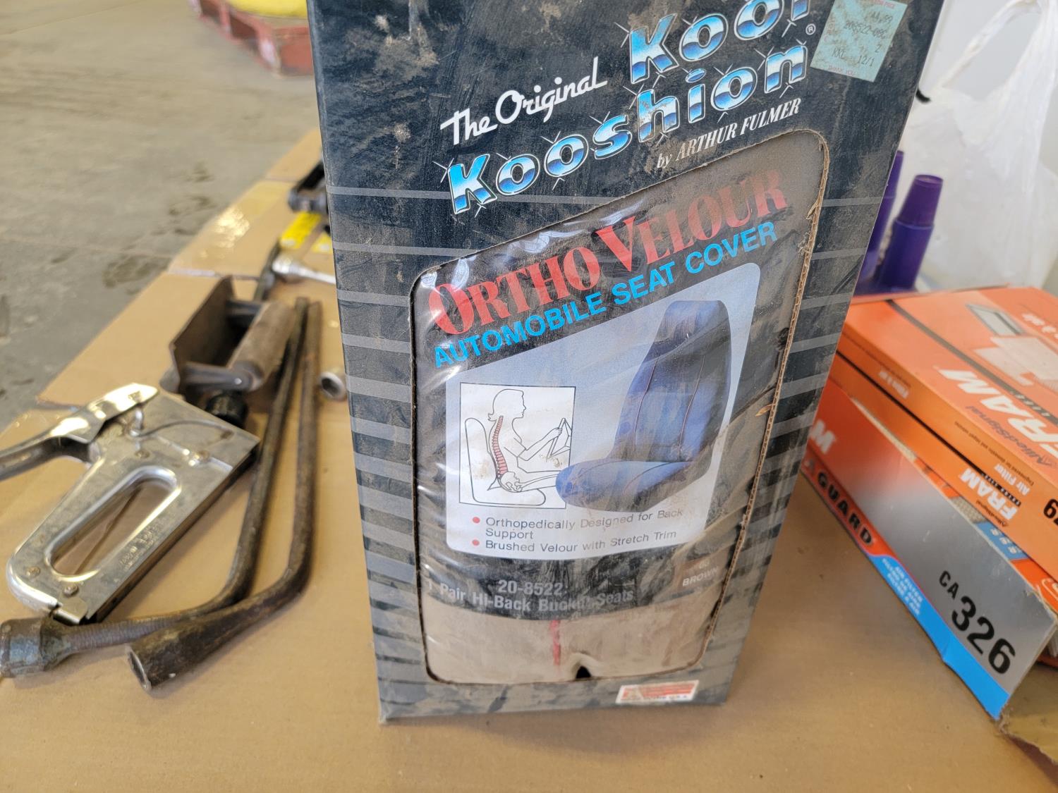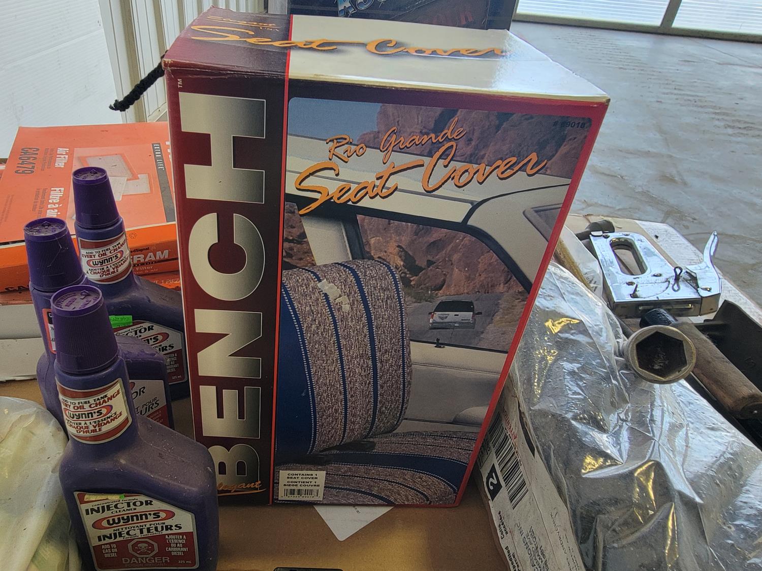 (2) seat covers, lamps, filters, (2) scissor jacks, broom head