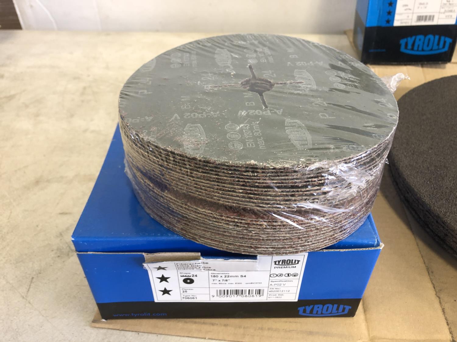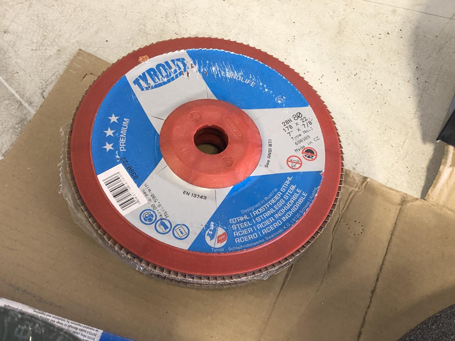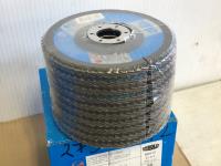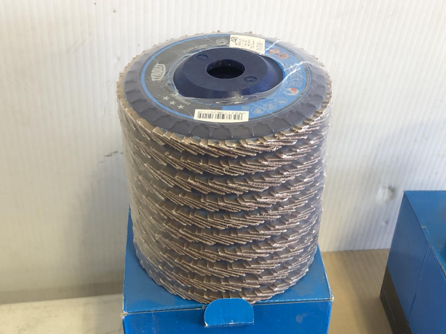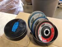 (8) 16 inch chop saw blades, (20) 5 inch flap discs, (3) 7 inch flap discs, (25) 7 inch fibre discs,
