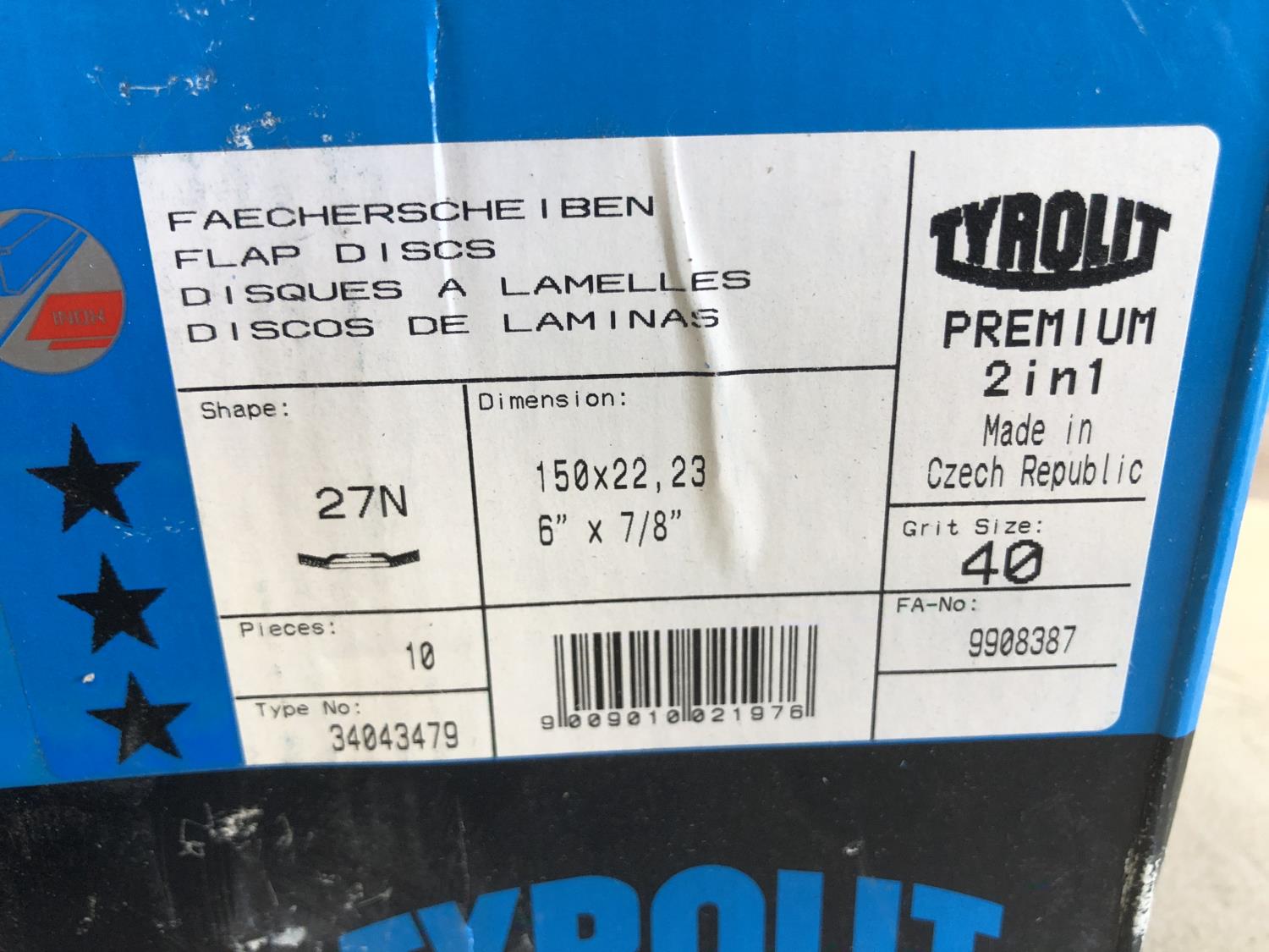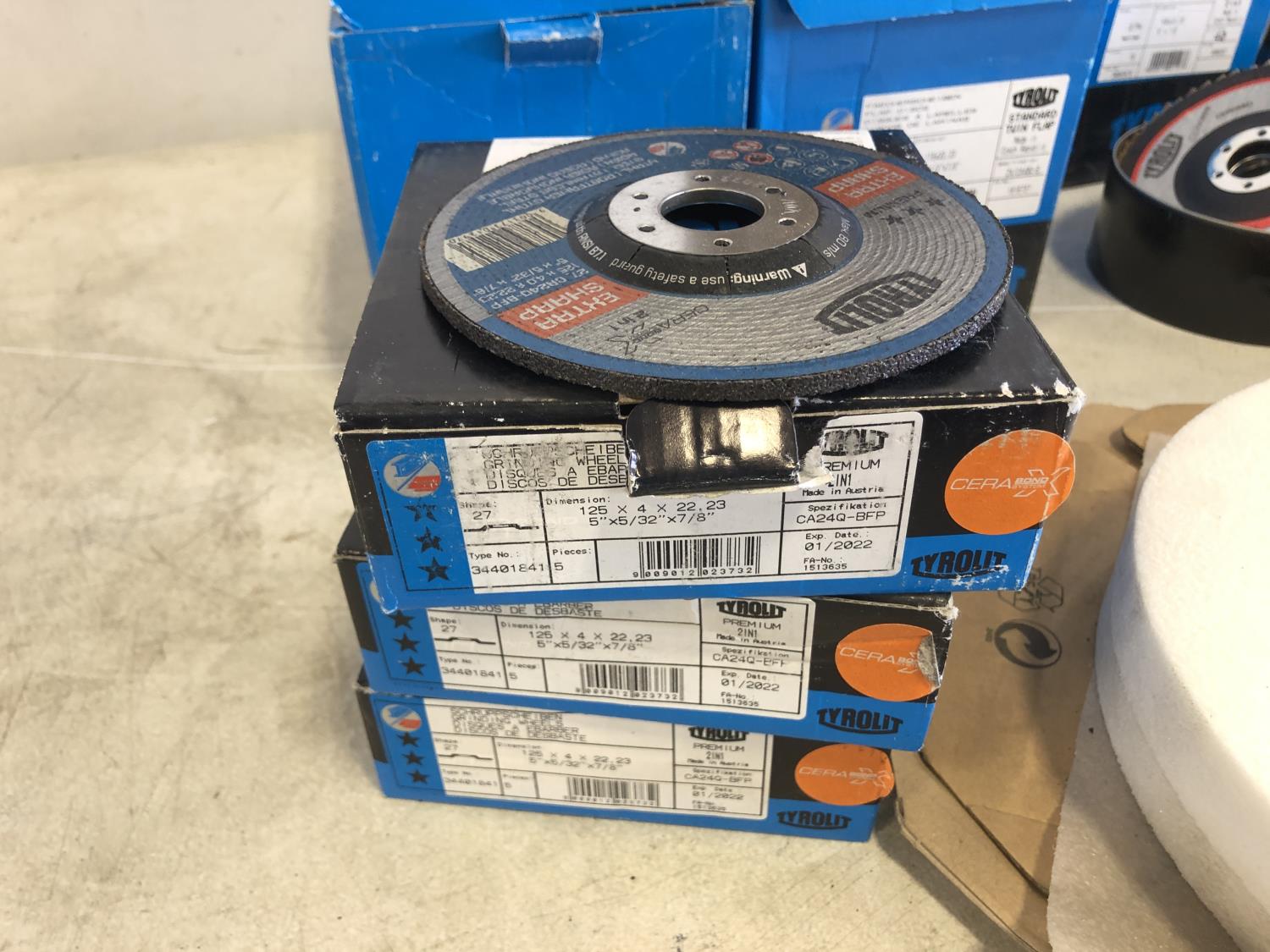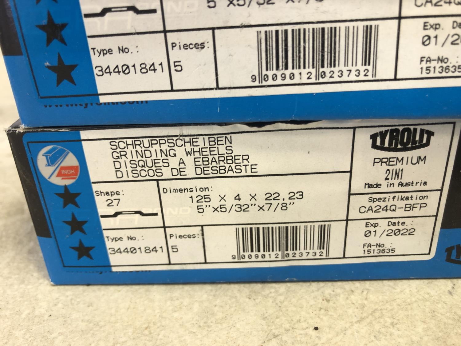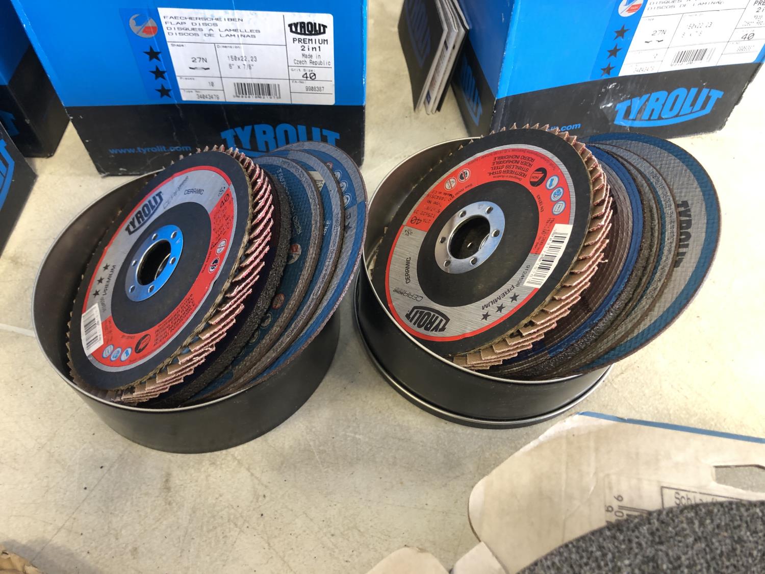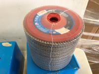 (3) 10 inch x 1-1/4 inch grind stones, (2) 10 inch x 1 inch grind stone, (15) 5 inch grind stones, (40) 5 inch flap discs, (20) 6 inch flap discs, (2) variety packs