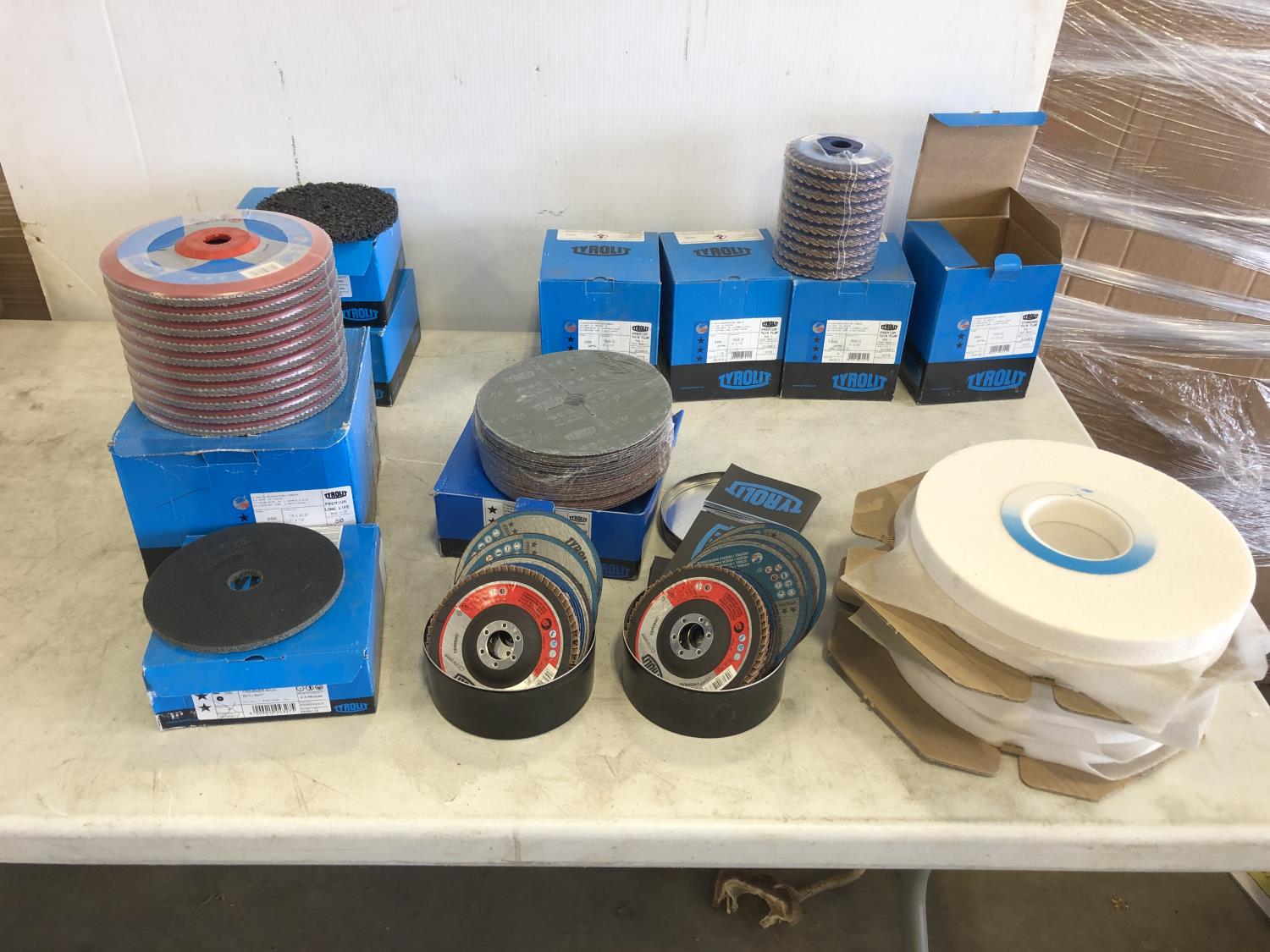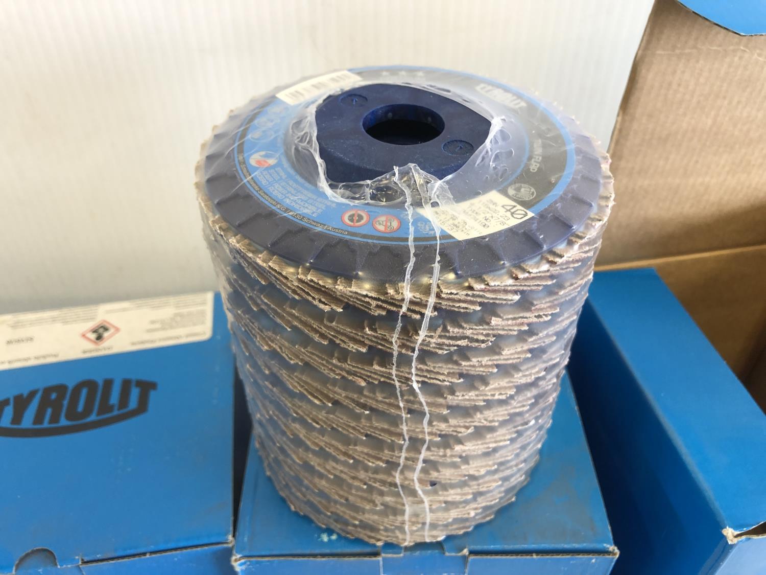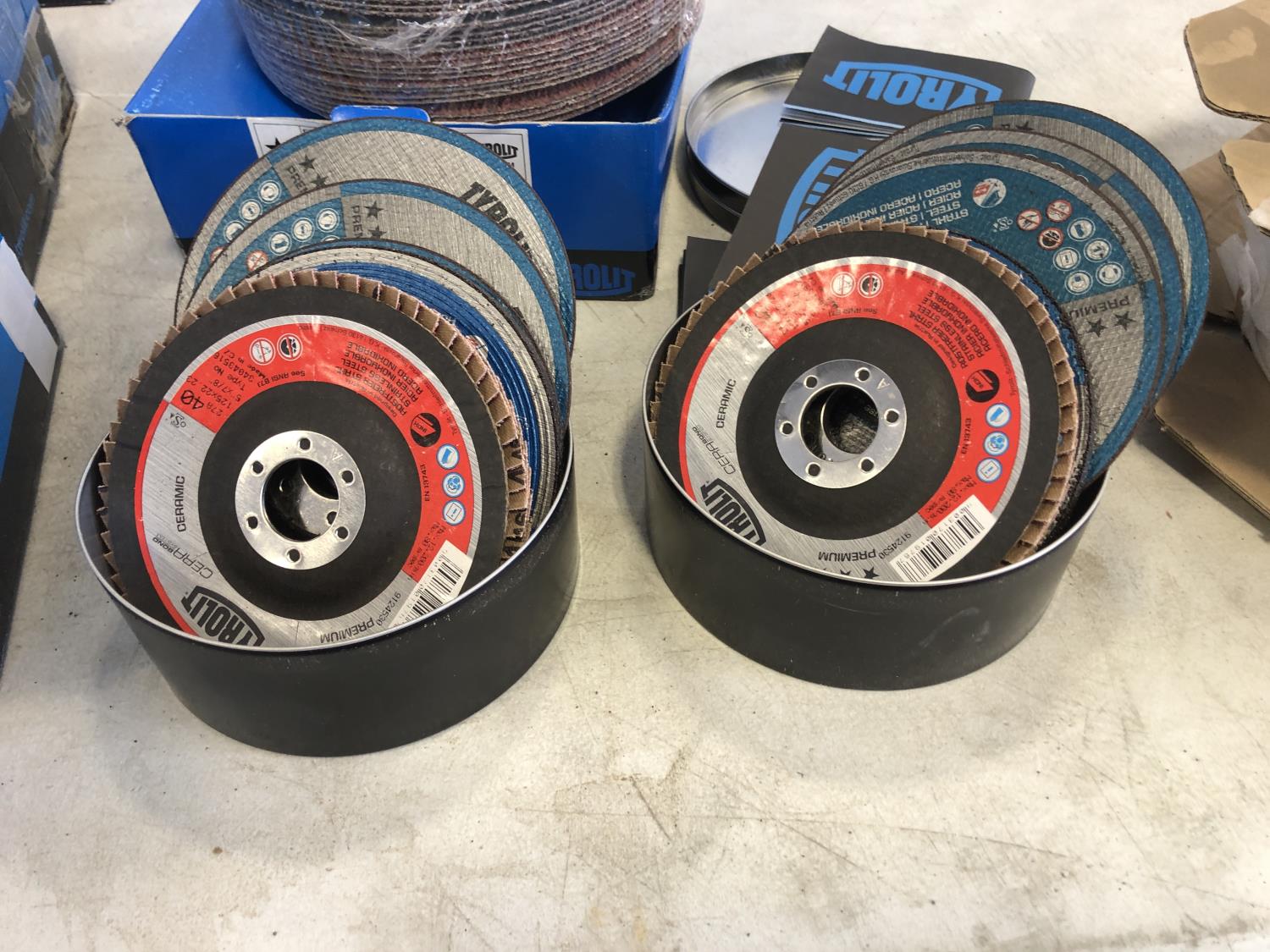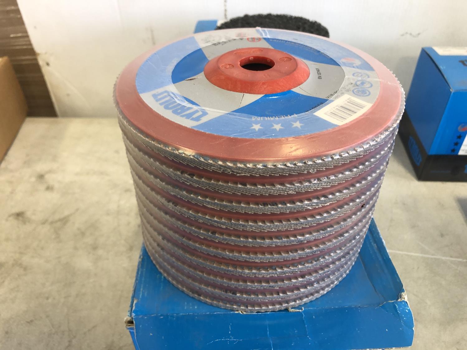(4)10 inch x 1 inch grind stones, (25) 7 inch fibre discs, (10) 7 inch flap discs, (5) unitized wheels, (10) 6 inch cleaning discs, (40) 5 inch flap discs, (2) variety packs