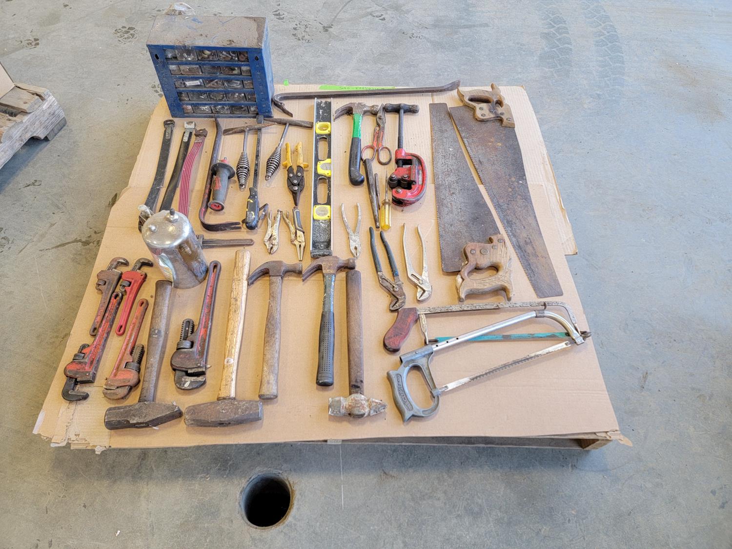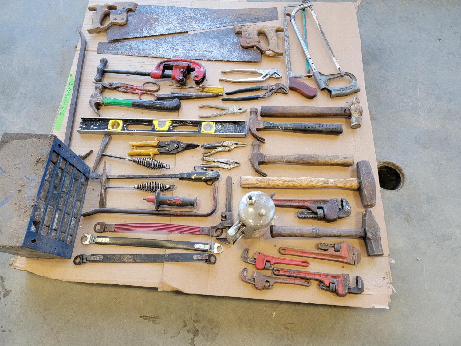 Hammers, pipe wrenches, saws, pipe cutter, vise grips, pliers
