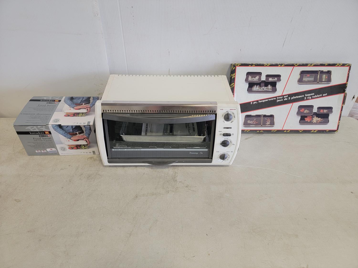 Black & Decker toaster oven, 3 piece vac'n store food saver, 3 piece food trays