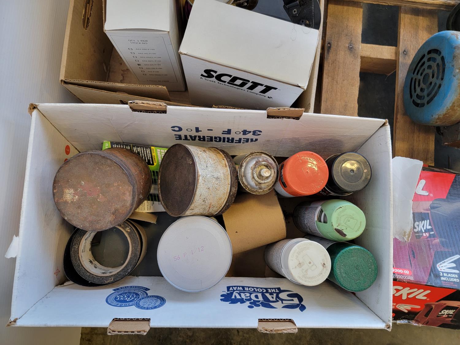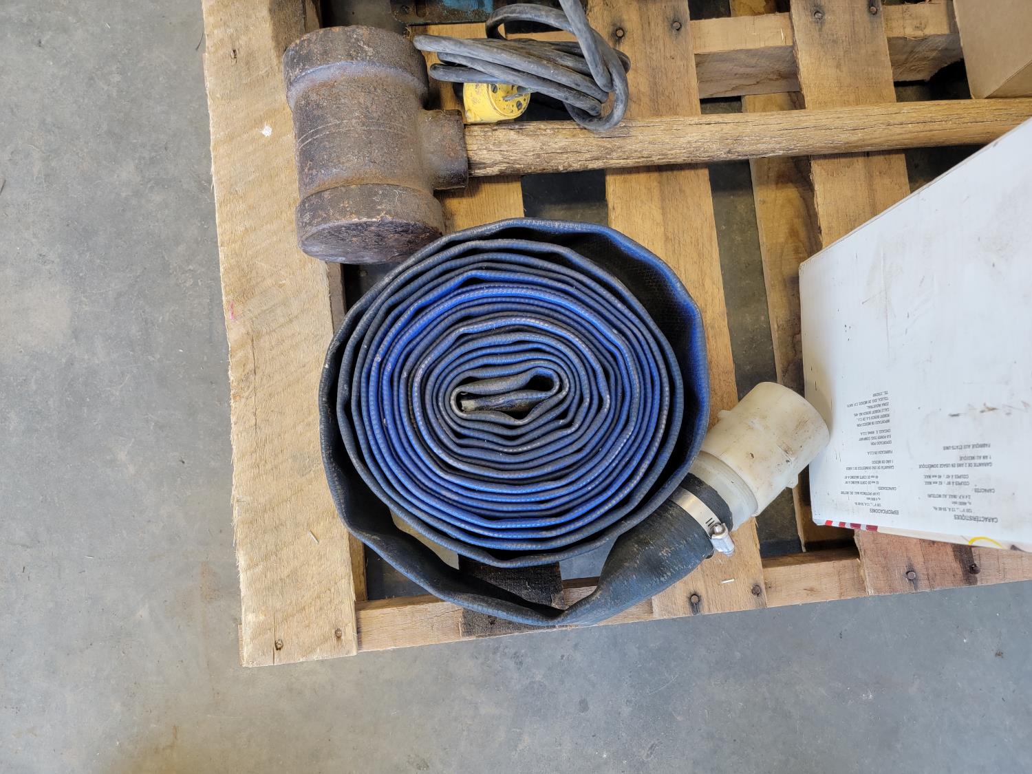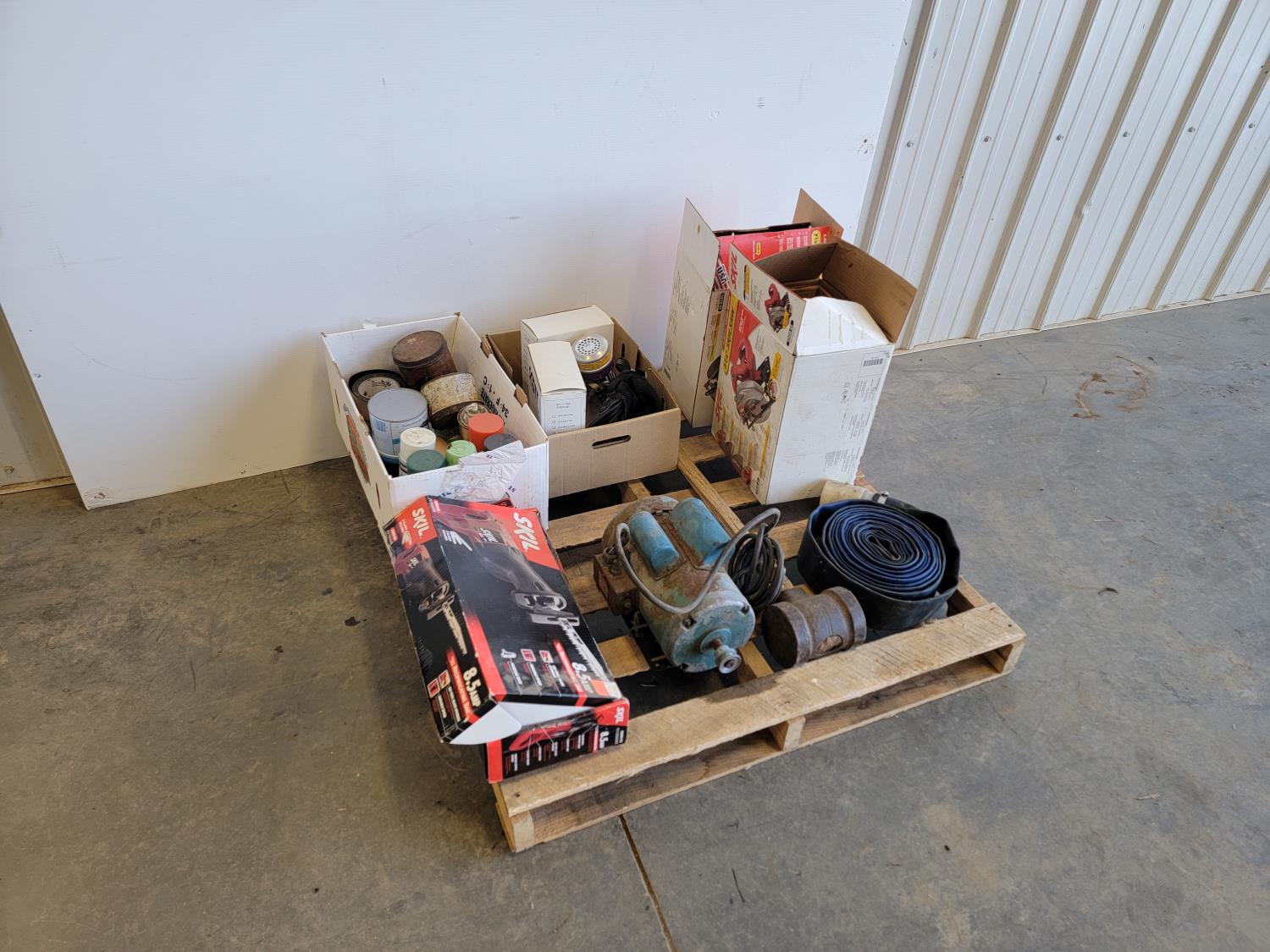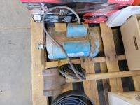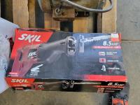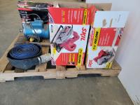 (2) Skil 7-1/4 inch circular saws (unused), Skil reciprocating saw (unused), lay flat hose, post maul, electric motor, (3) Scott respirator masks,
