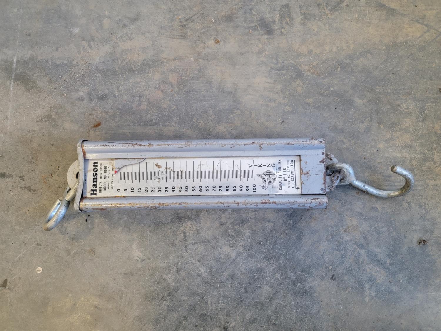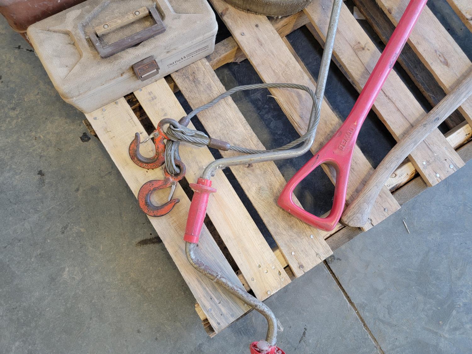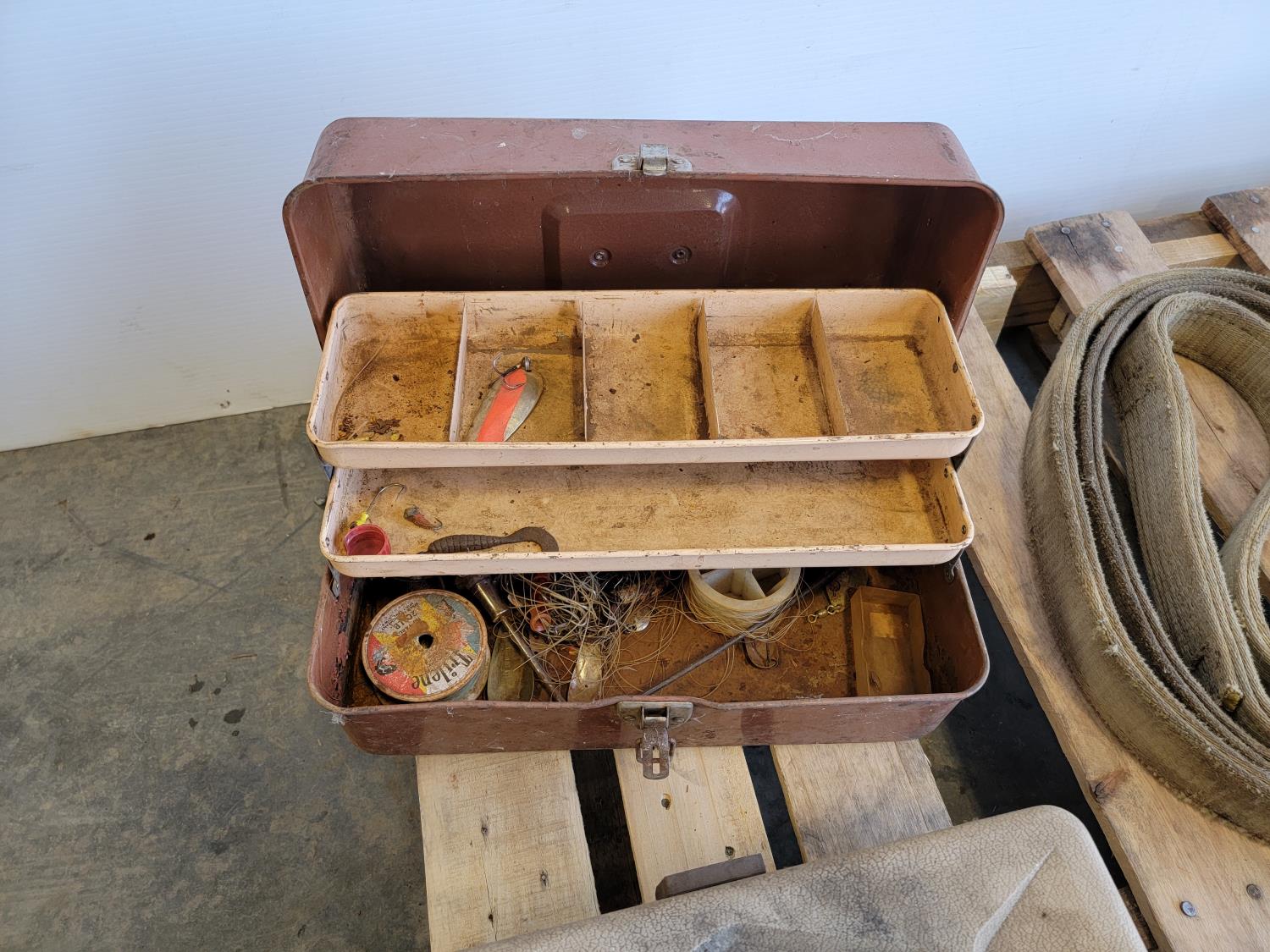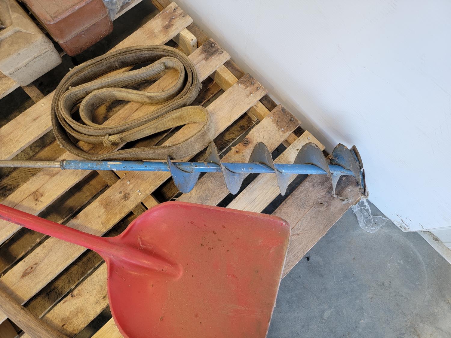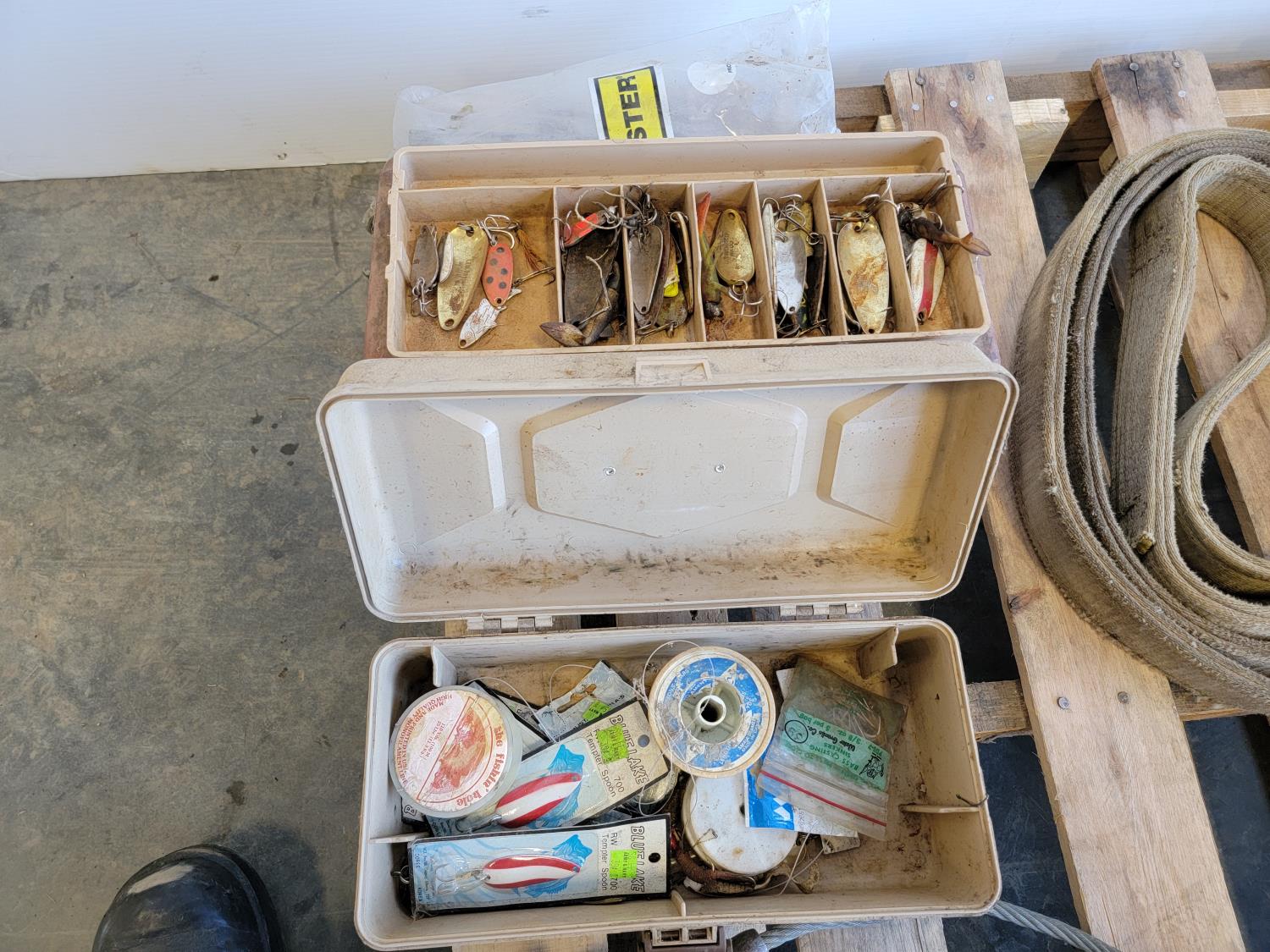 (2) fishing tackle boxes with contents, manual ice auger, axe, Hanson 100 lb scale, shovel, canvas sling
