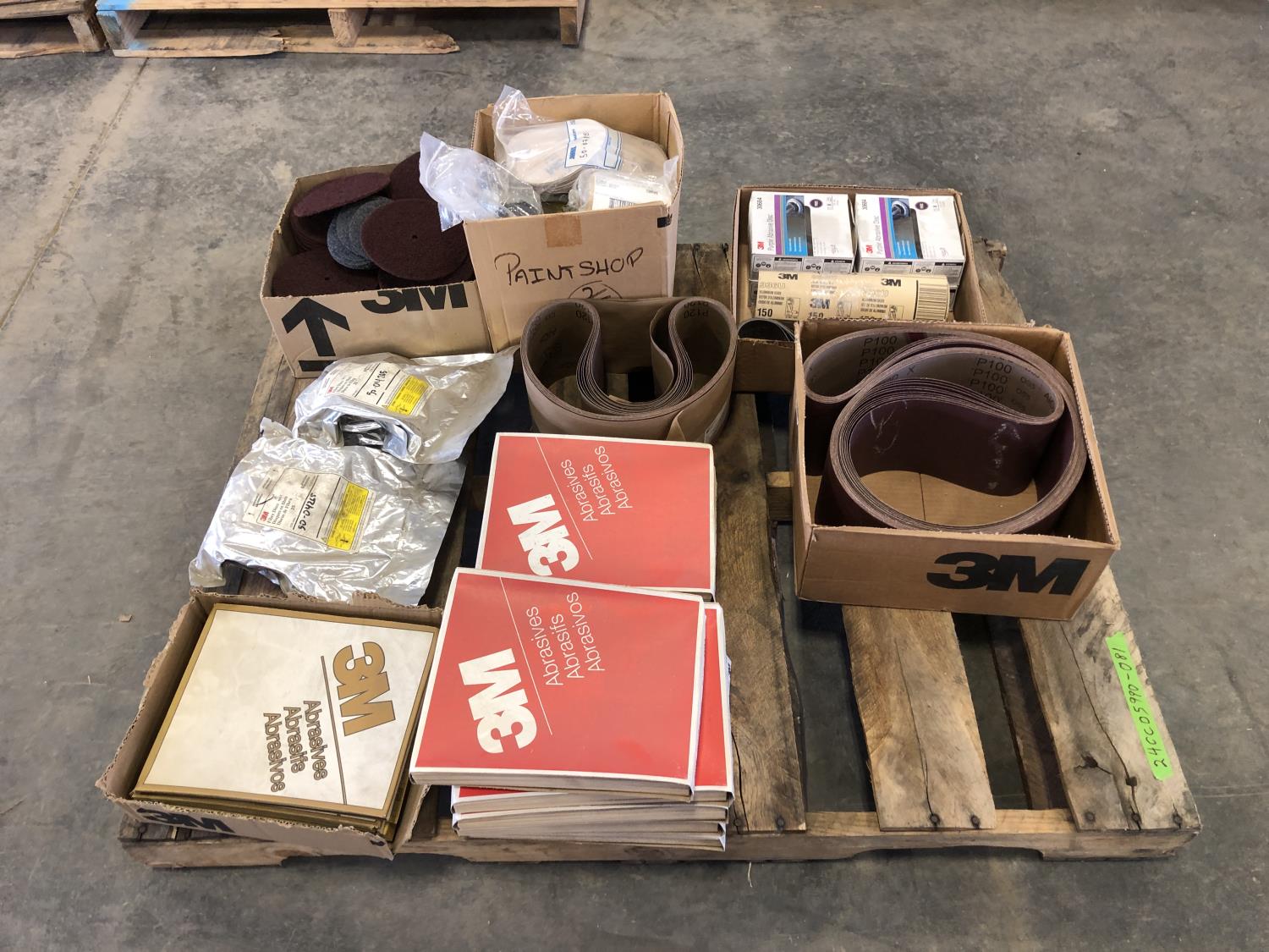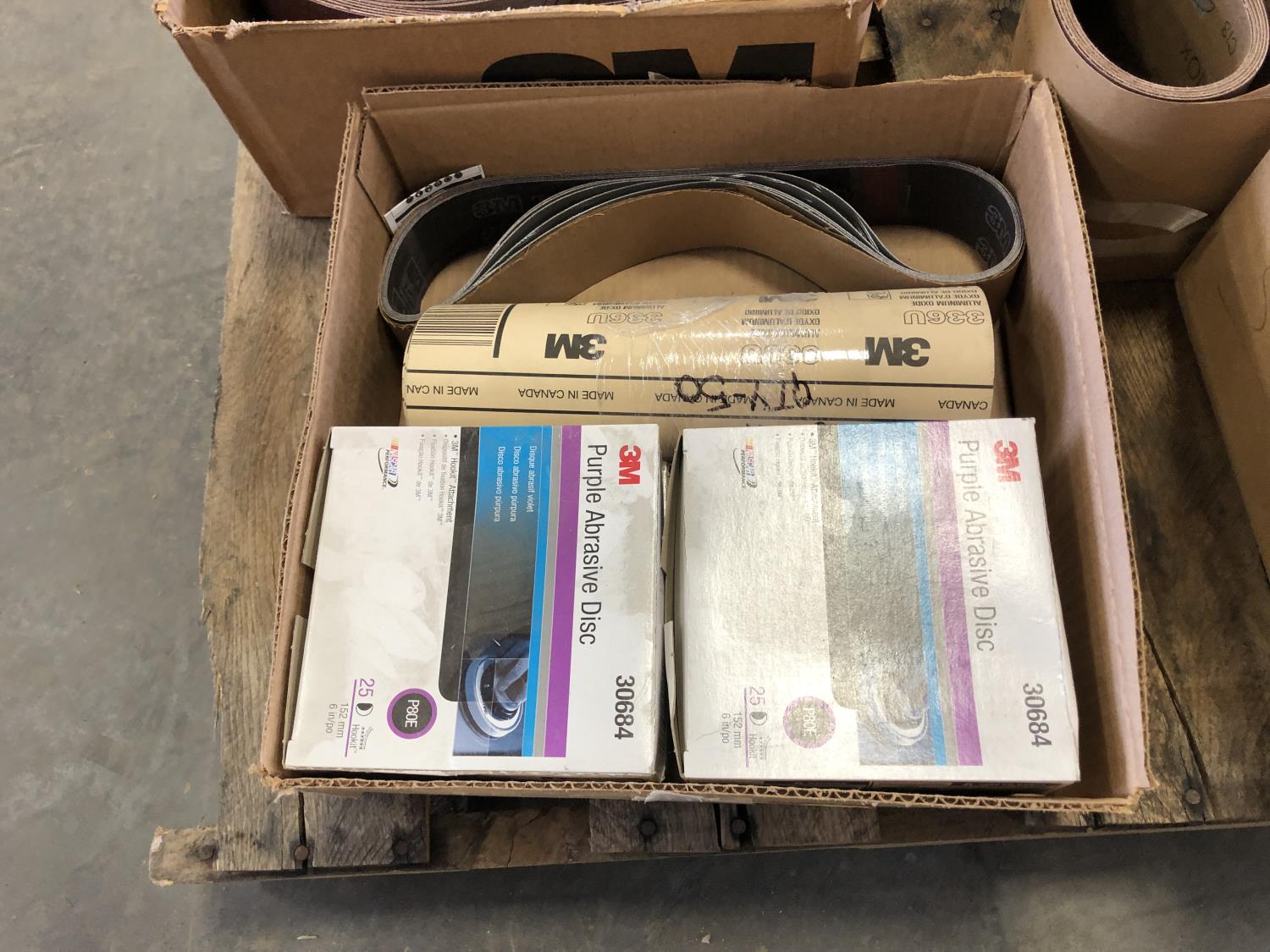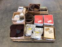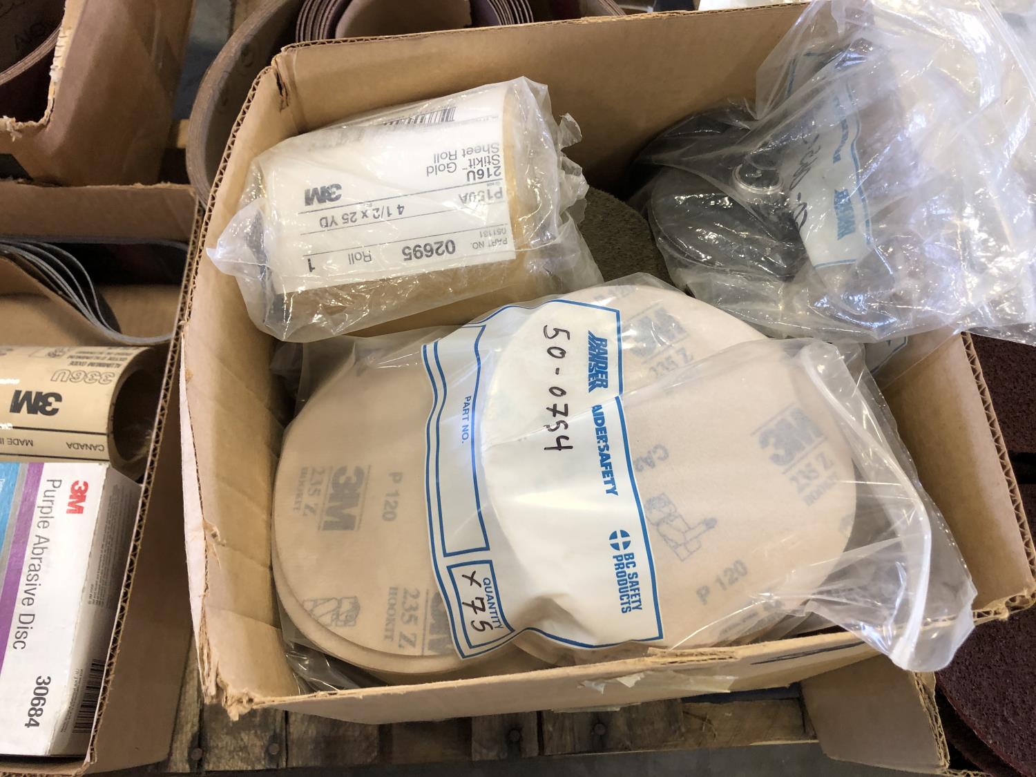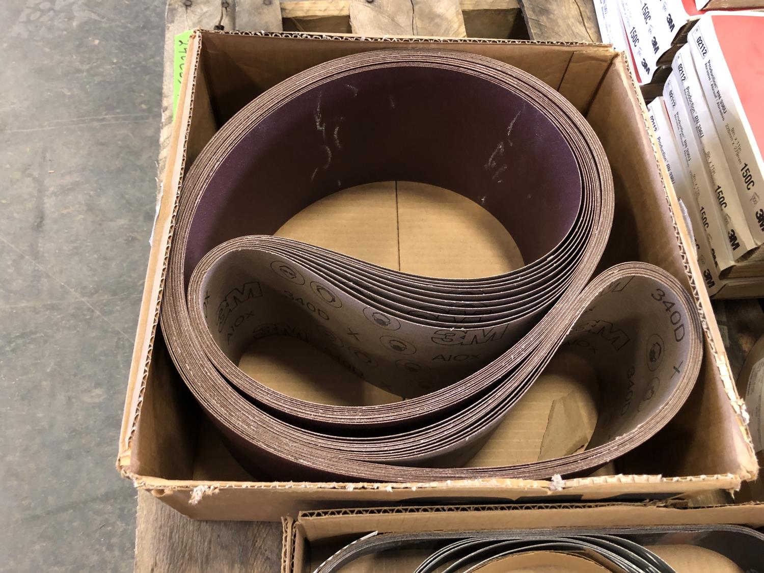 Assorted 9 inch x 11 inch sheets of sand paper, (10) 6 inch x 108 inch P100 sanding belts, assorted fibre discs, assorted sanding belts