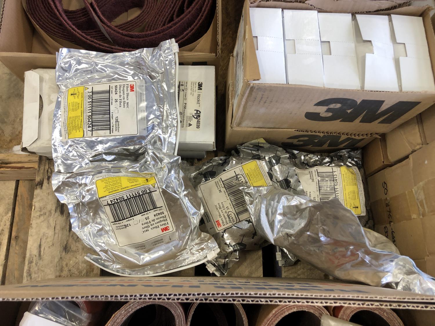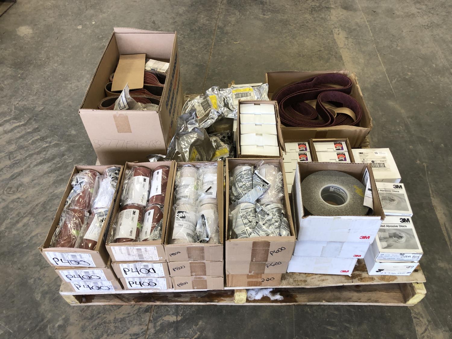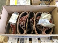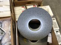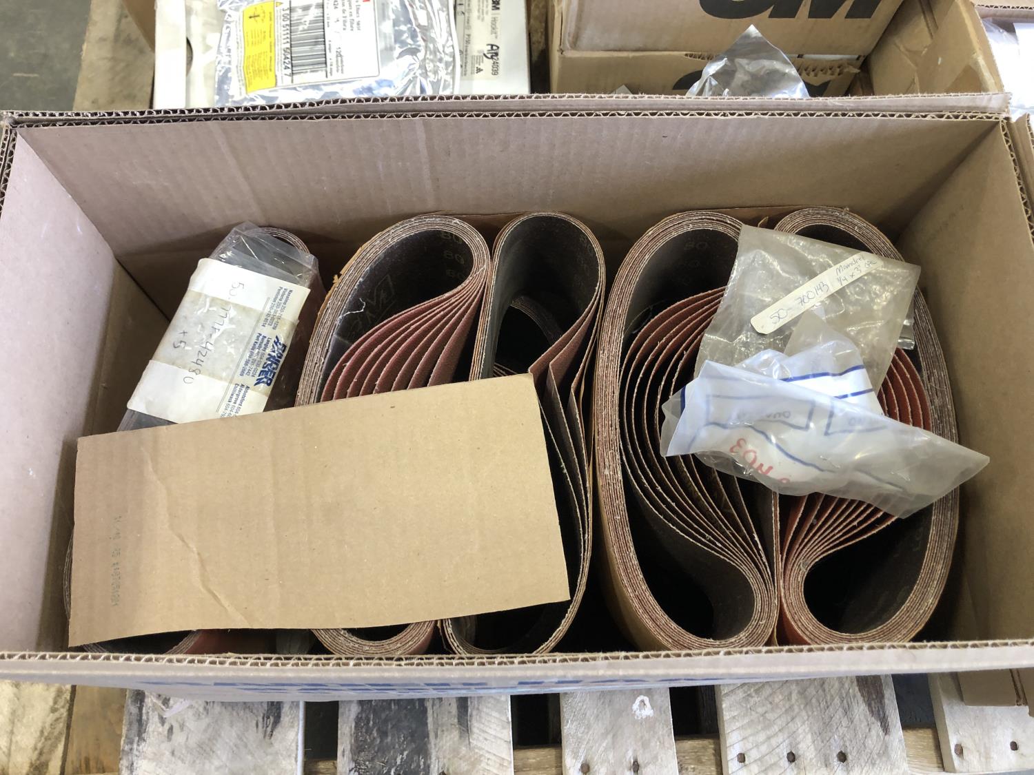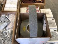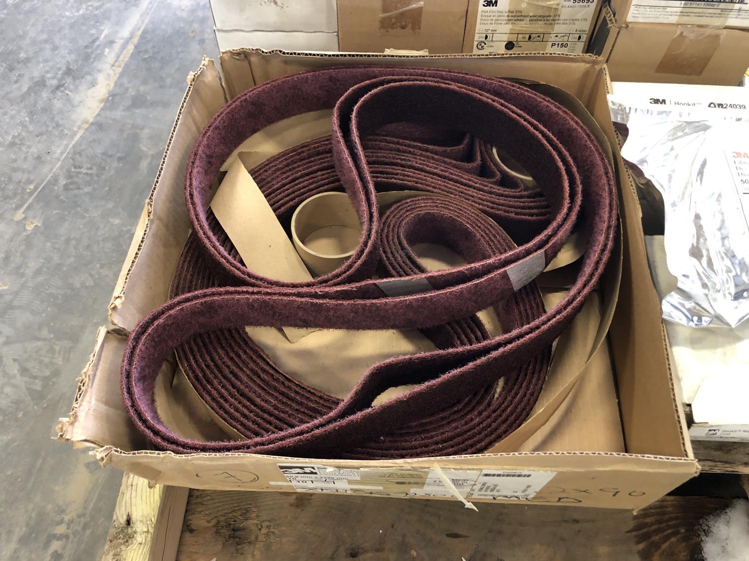 (48) 6 inch fiber disc rolls P100 and P800, (7) 2 inch x 90 inch surface conditioning belts, (20) 5 inch fiber discs of various grits, (4) 6 inch fiber discs of various grits, (5) fiber disc bags, assorted sanding belts, (6) 8 inch x 1-1/2 inch deburring wheels