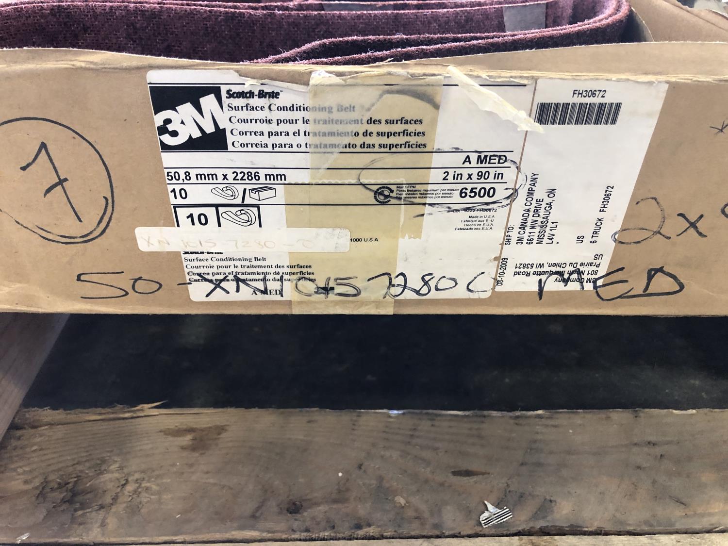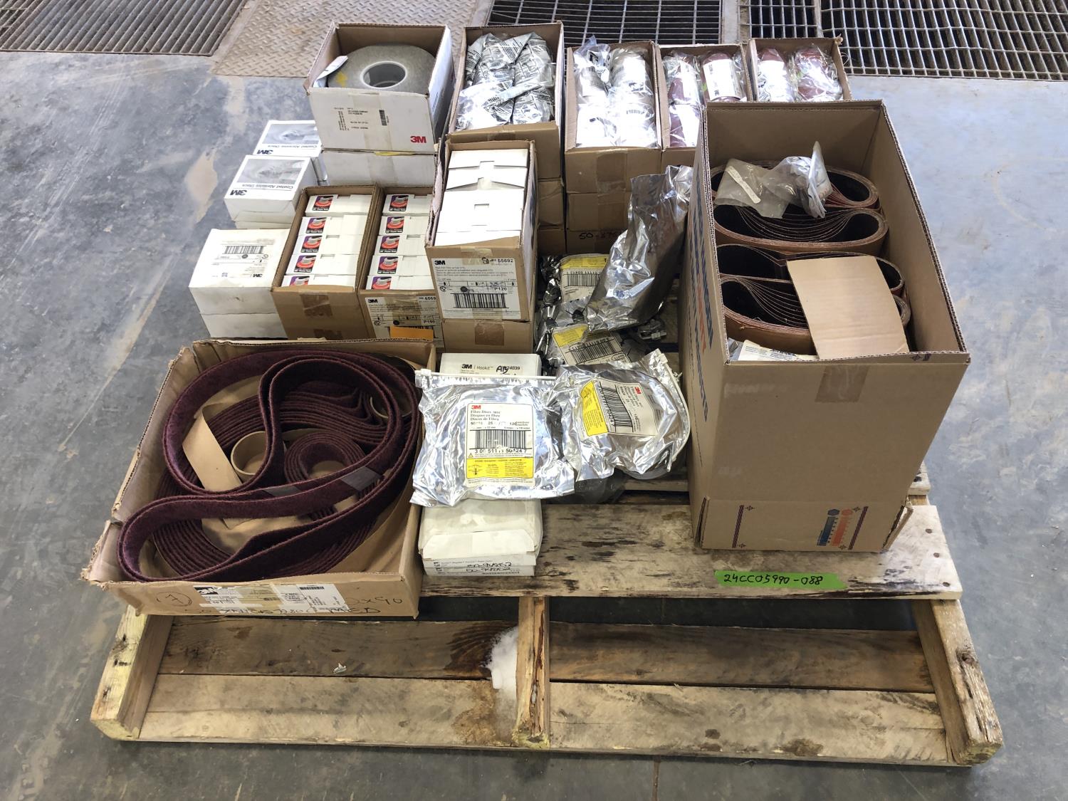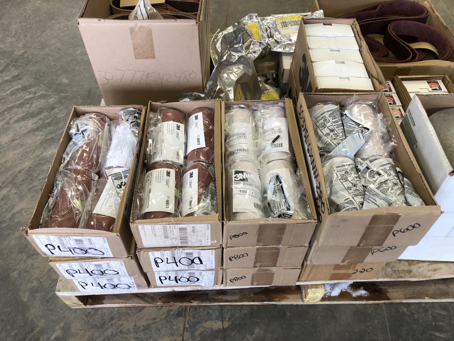 (48) 6 inch fiber disc rolls P100 and P800, (7) 2 inch x 90 inch surface conditioning belts, (20) 5 inch fiber discs of various grits, (4) 6 inch fiber discs of various grits, (5) fiber disc bags, assorted sanding belts, (6) 8 inch x 1-1/2 inch deburring wheels