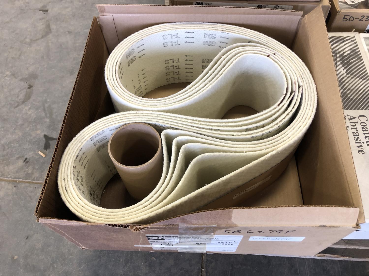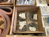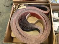 6 inch x 79 inch surface conditioning belts, assorted sanding belts, (49) 4 inch fiber discs, (2) flash light attachments, 6 inch sanding discs, film discs, 4 inch x 36 inch coated abrasive belt, coated abrasive discs