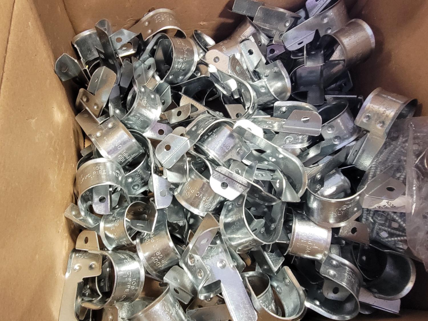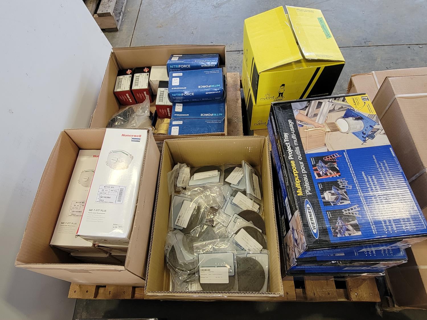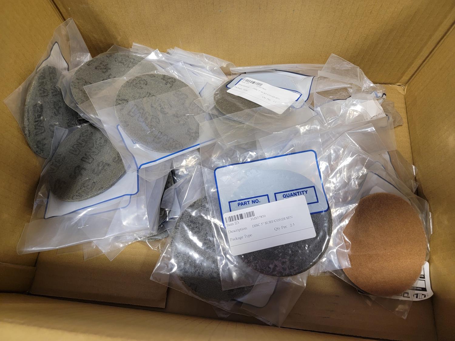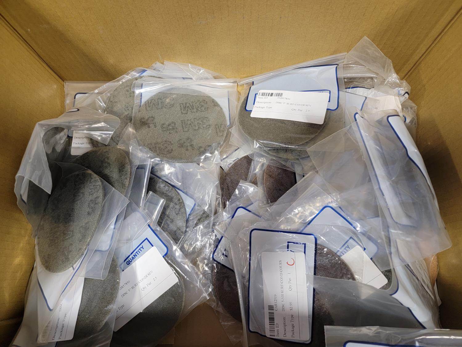 1 inch galvanized pipe straps, (8) boxes of blue nitrile gloves, (3) multipurpose project trays, concrete anchors, 2 inch shut off valves, (2) facemask visor brackets, 5 inch polishing discs, 2 inch Scotch Brite polish discs, Honeywell face masks