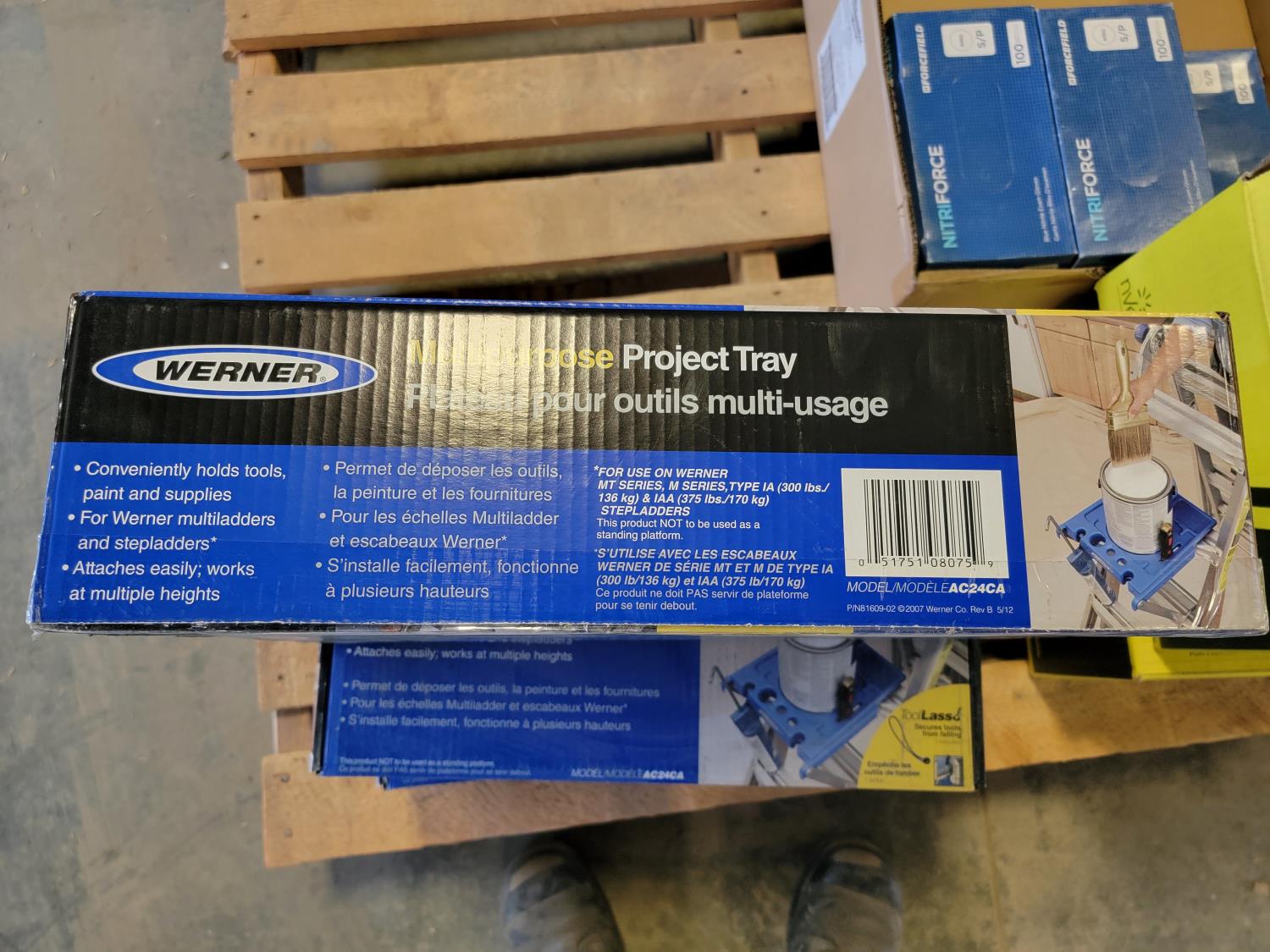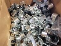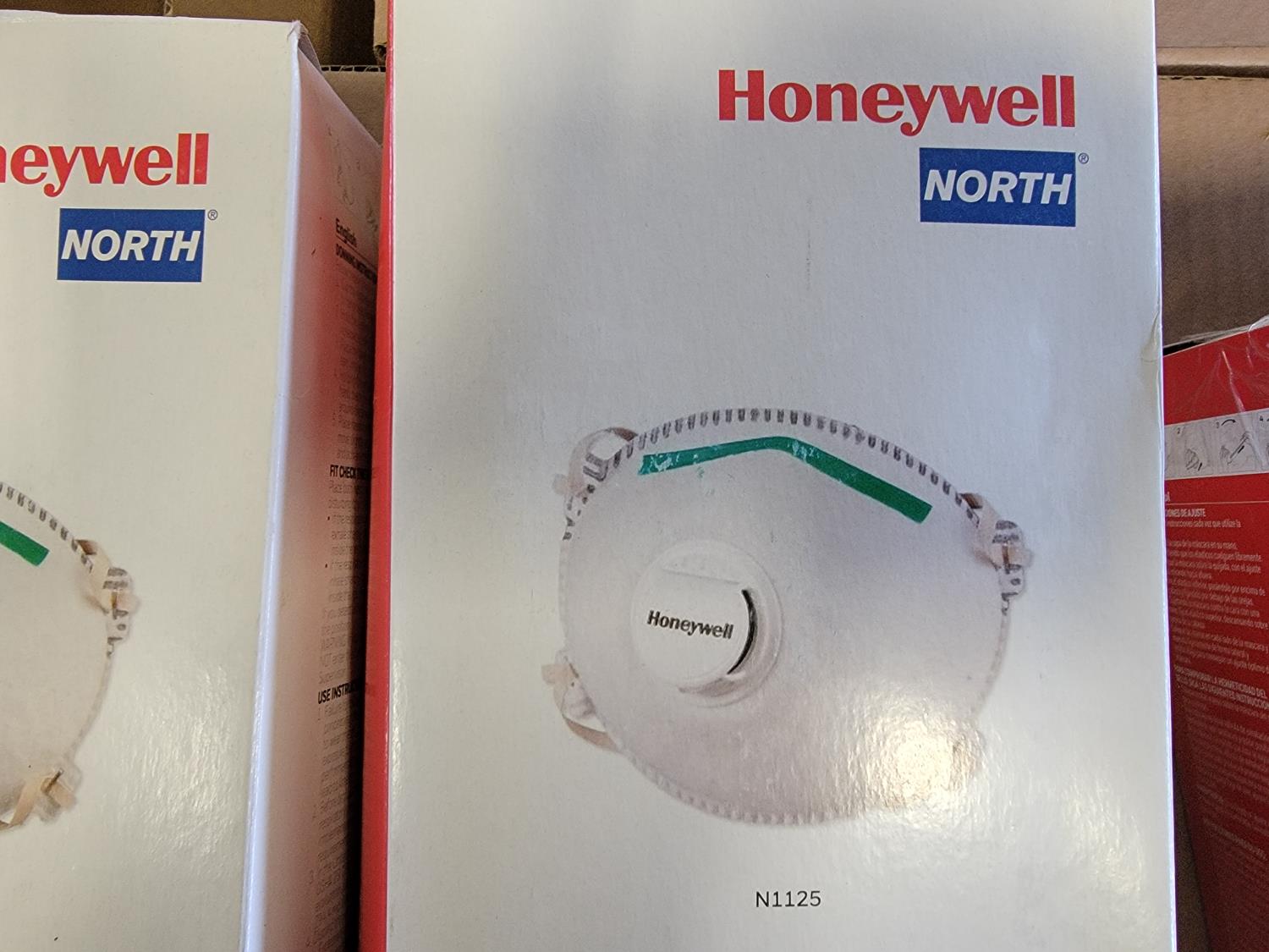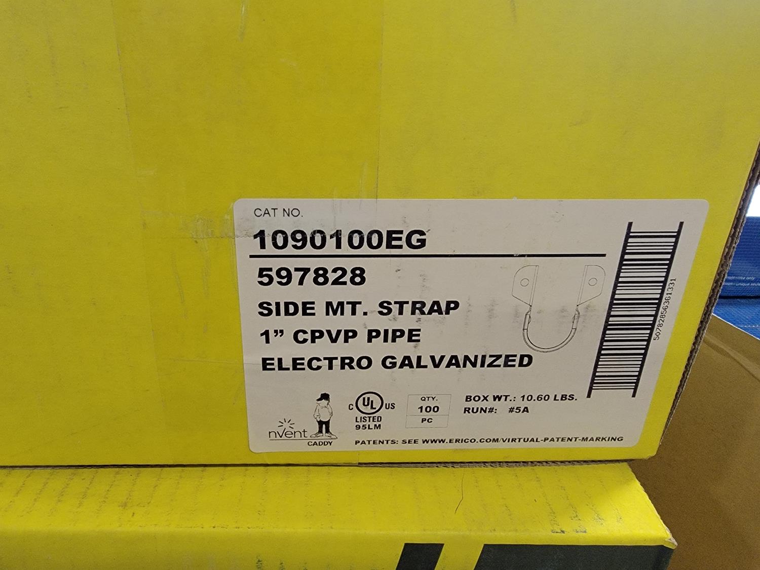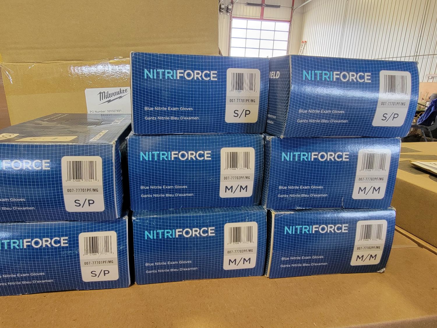 1 inch galvanized pipe straps, (8) boxes of blue nitrile gloves, (3) multipurpose project trays, concrete anchors, 2 inch shut off valves, (2) facemask visor brackets, 5 inch polishing discs, 2 inch Scotch Brite polish discs, Honeywell face masks