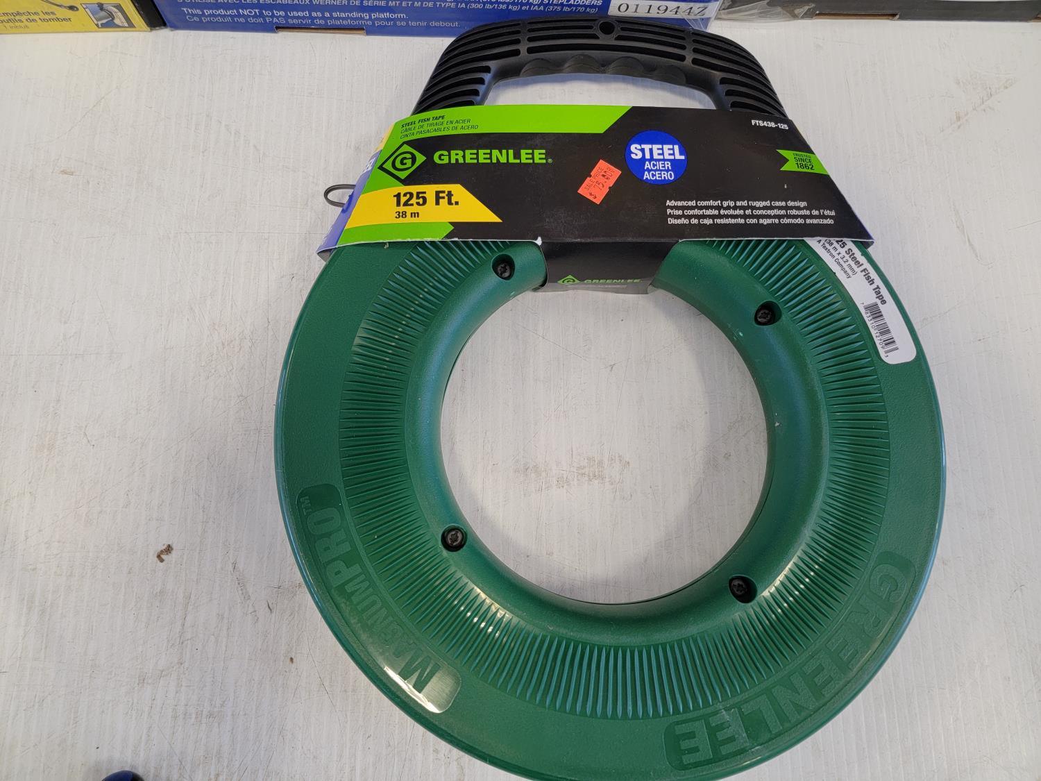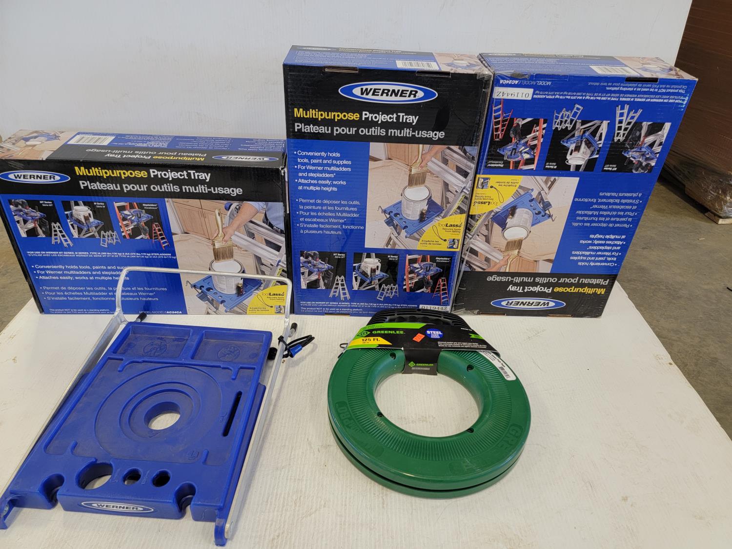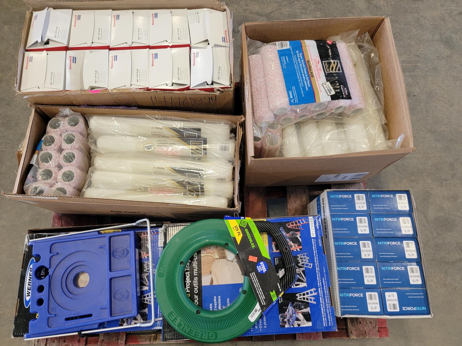 Paint rollers, latex gloves, filter masks, ladder paint trays, 125 ft fish tape
