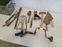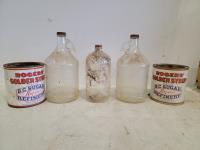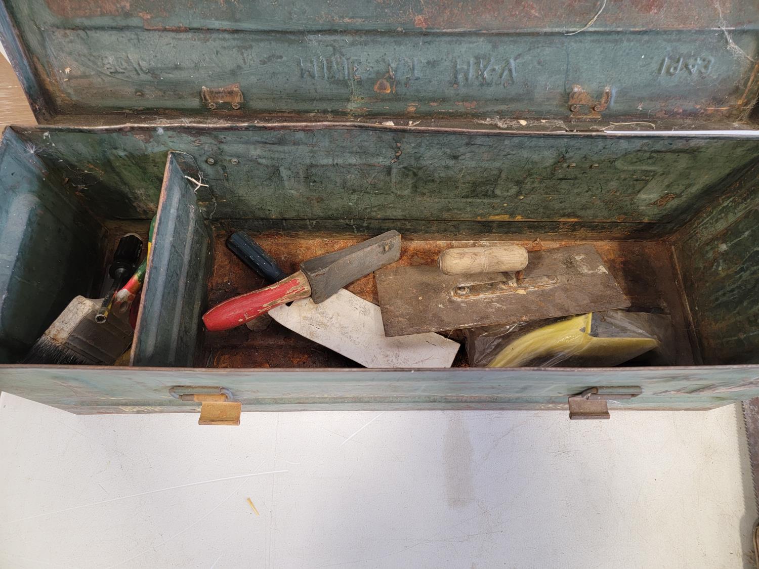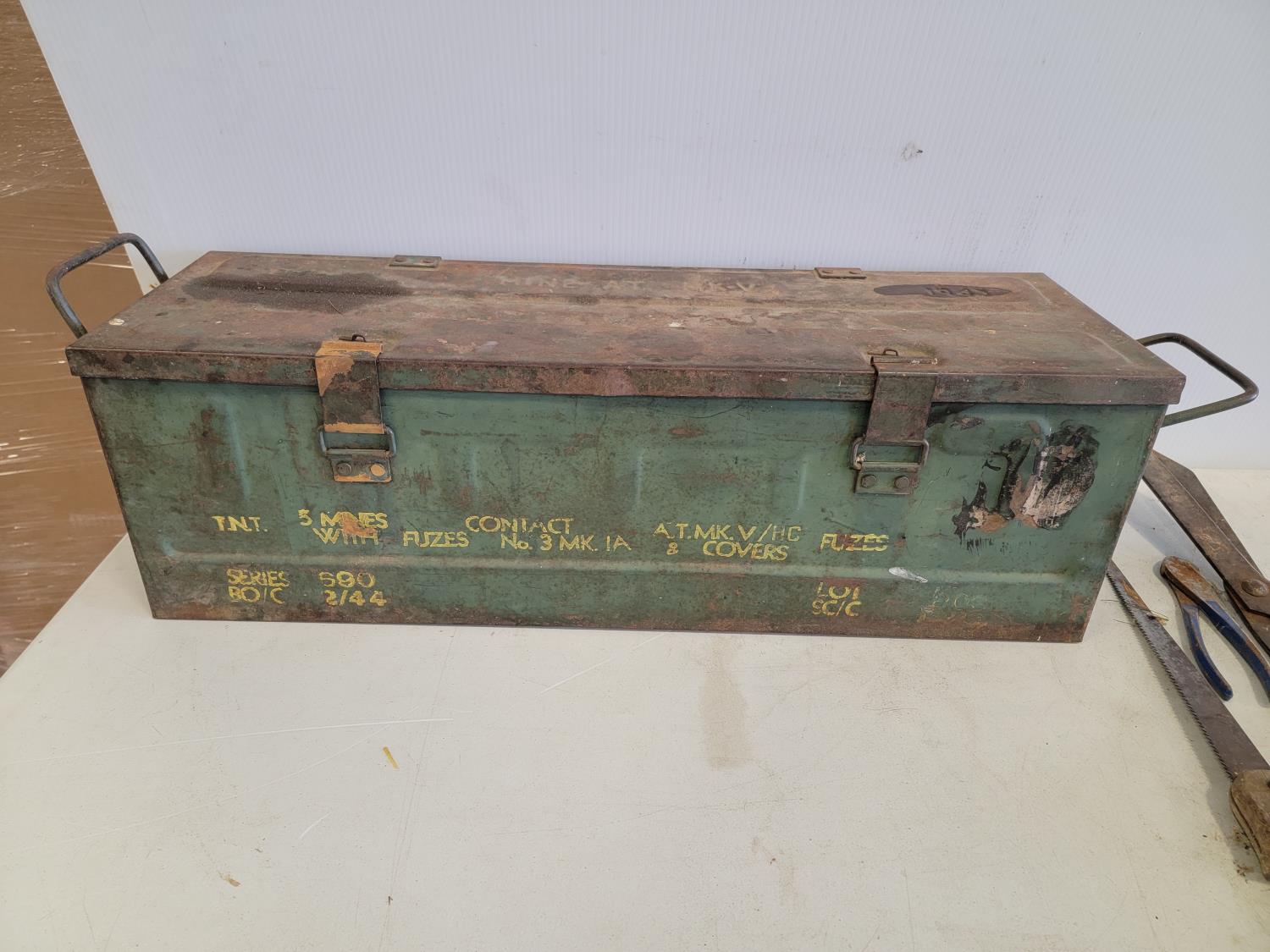 1943 explosives box, vintage tools, bottles, tins, boxes, 30 inch level
