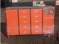 (2) side cabinets, (10) drawers, comes with assortment of new tools, castor wheels, 76-3/4 inch w x 19-3/4 inch d x 44-3/4 inch