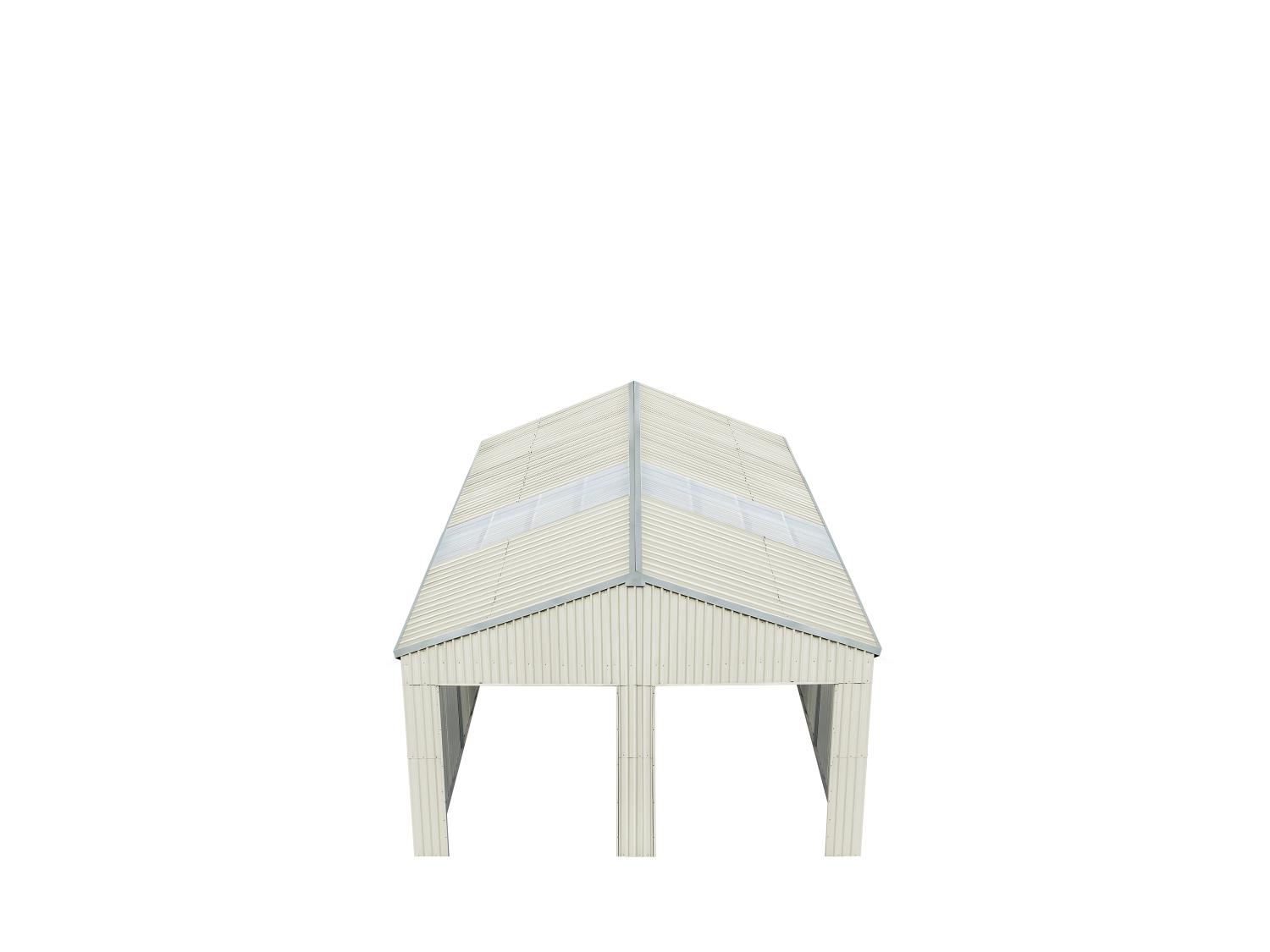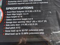 625 sq ft floor space, 9 ft 8 inch eave height, 27 GA metal, skylights, 4/12 roof pitch, side entry door