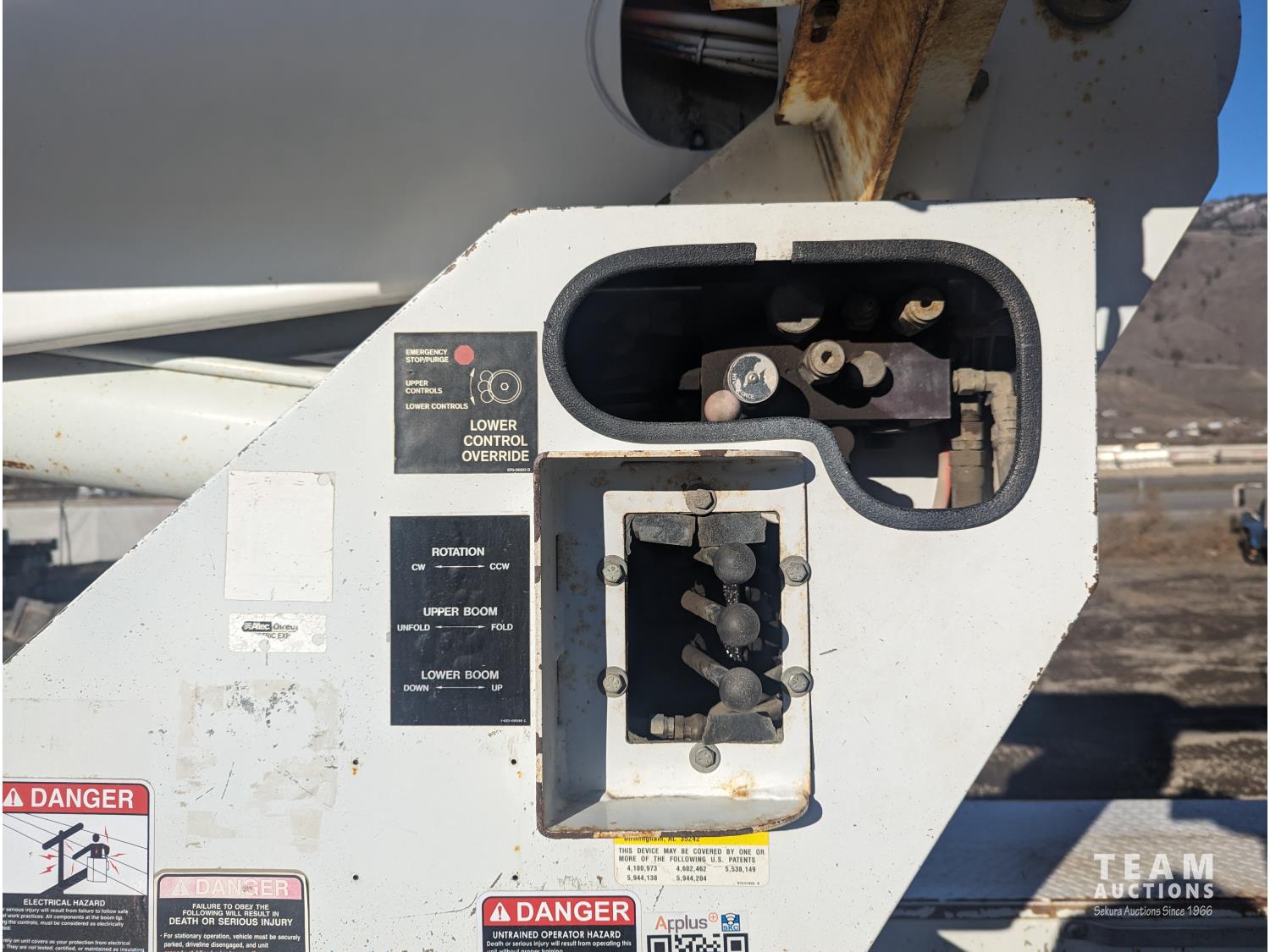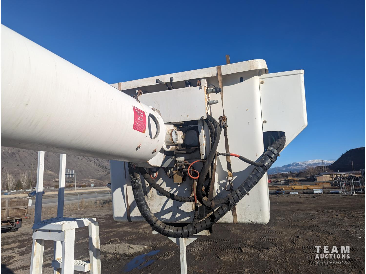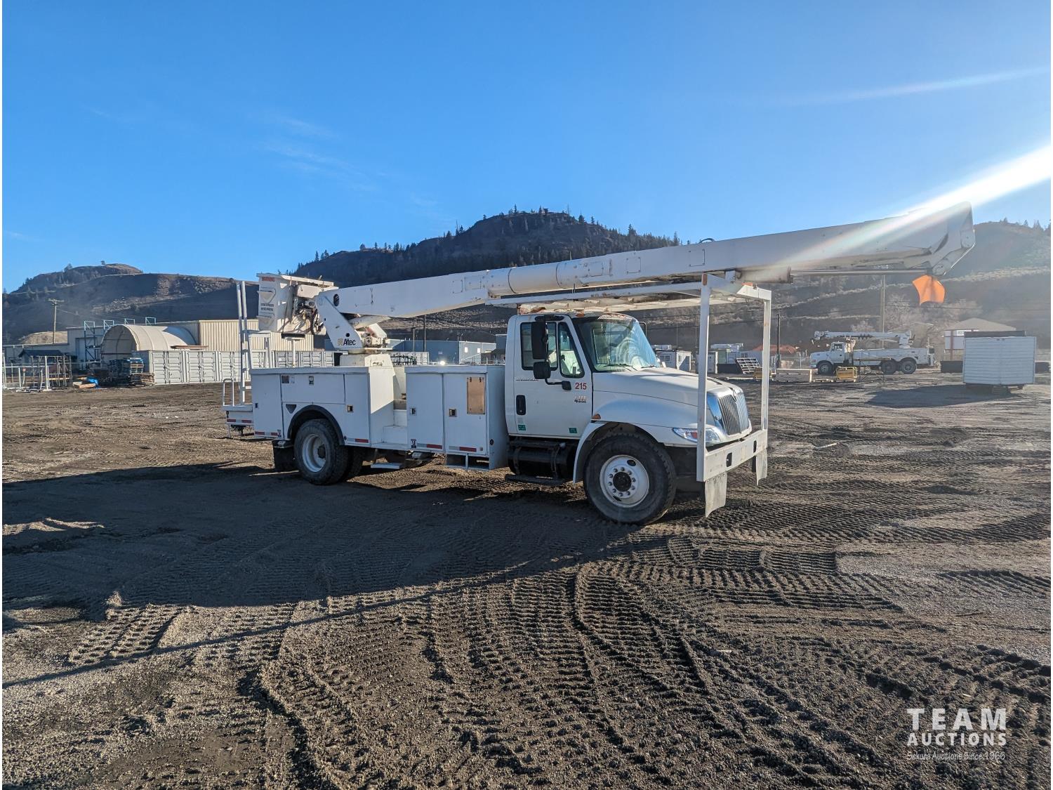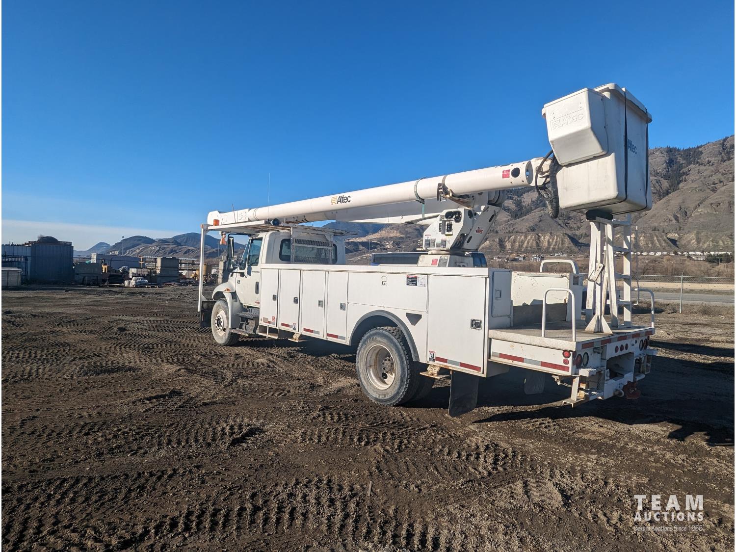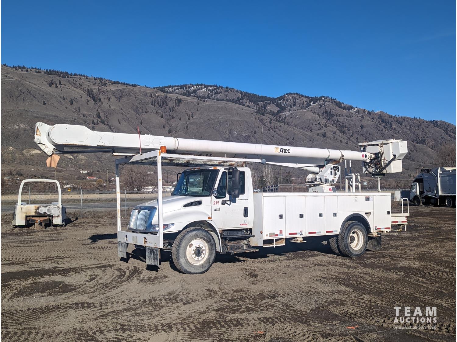 International DT460 7.6 L 6 cylinder diesel engine, engine block heater, 6 speed manual transmission, A/C, stereo, Altec rig up, Altec AM900 67 ft rear mount crane, outriggers, spring suspension, 15,350 lb front axle, 19,433 lb rear axles, 207 inch WB, 12R22.5 front tires, 11R22.5 rear tires