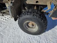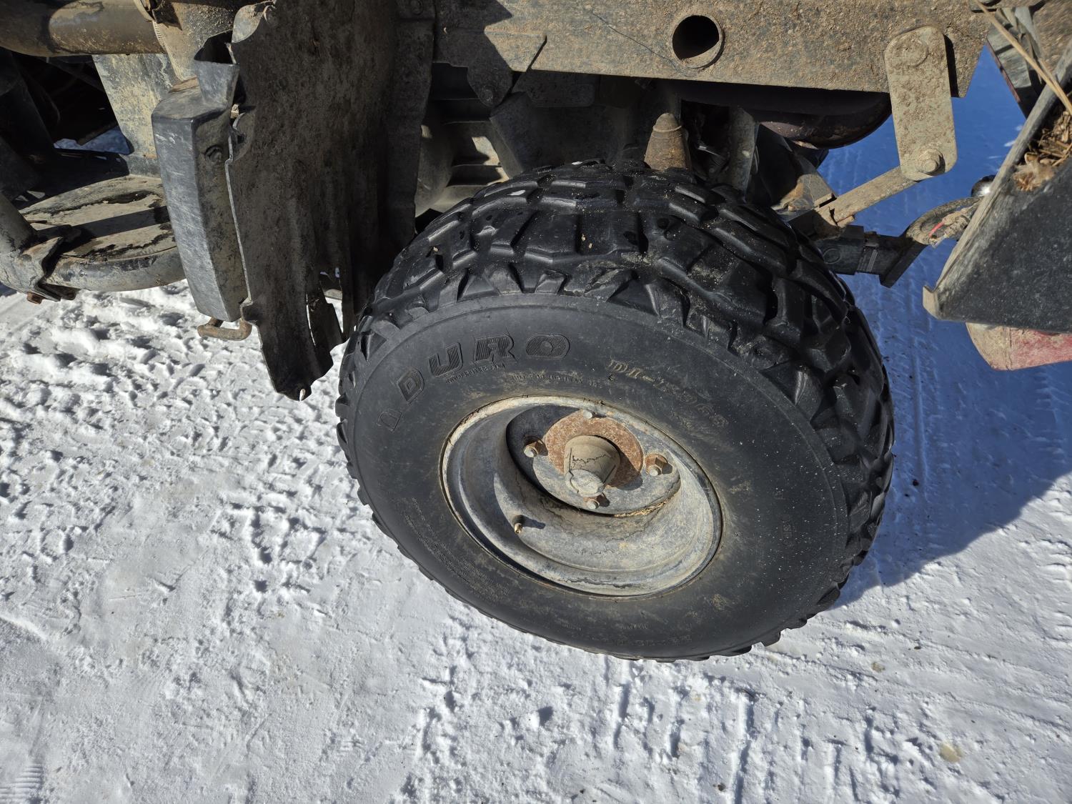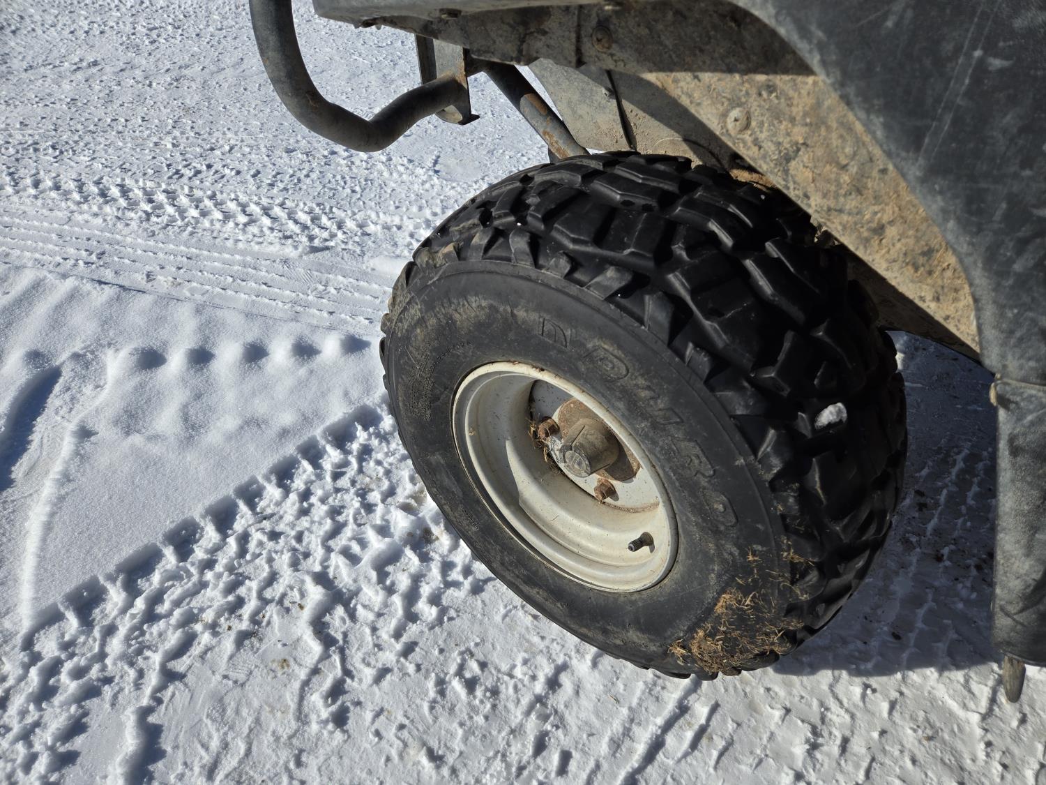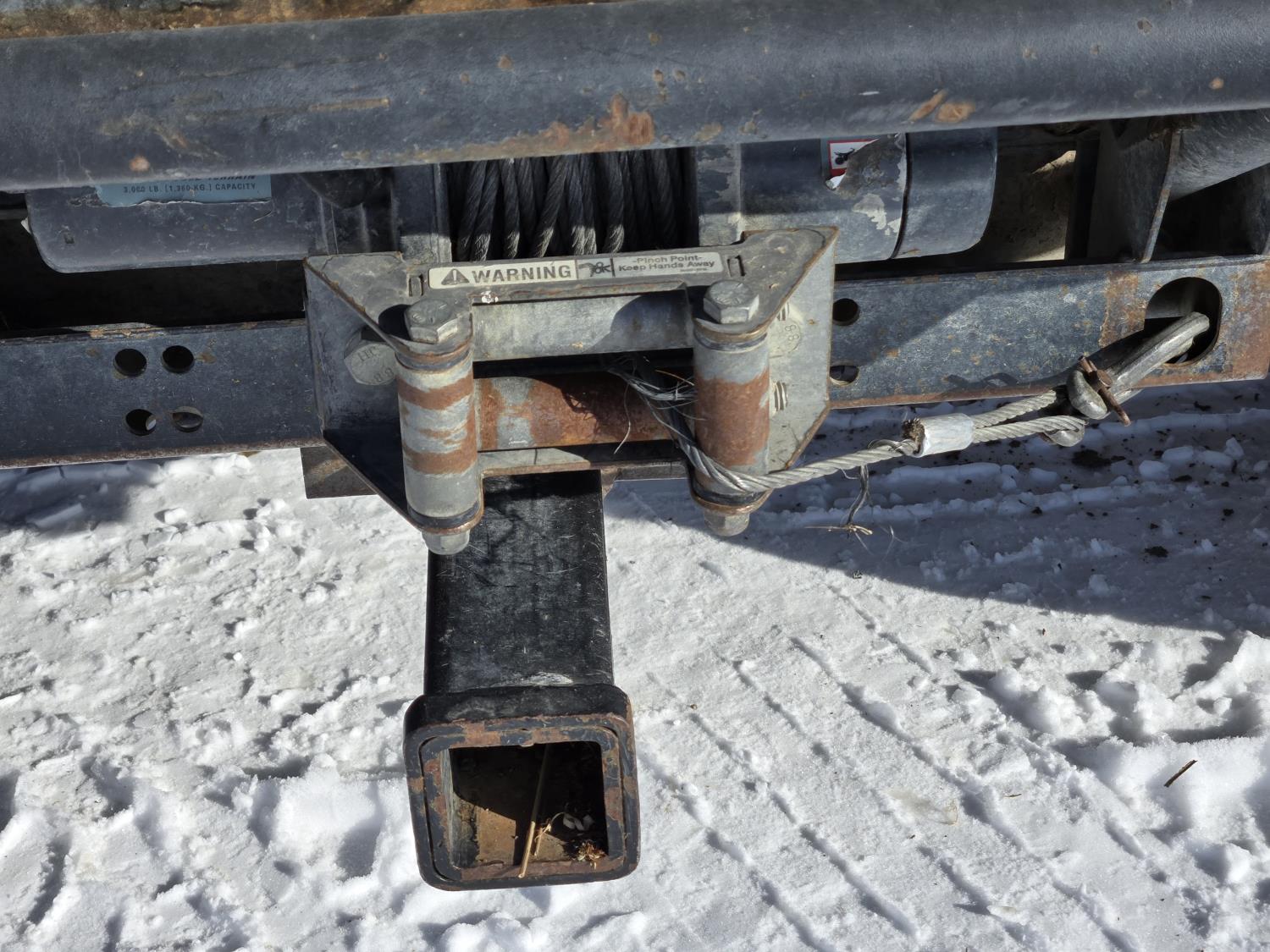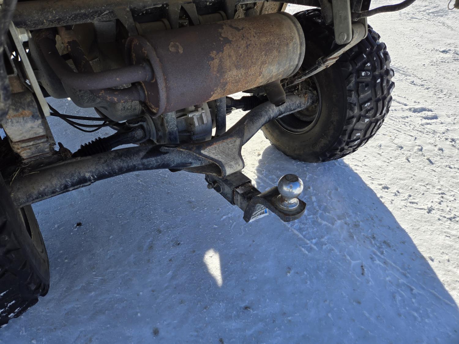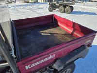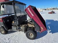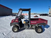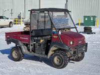 Kawasaki twin cylinder liquid cooled gas engine, CVT transmission with high/low range, reverse, manual tilt box, power steering, front winch, two inch receivers on both ends, 23X11.00-10 tires