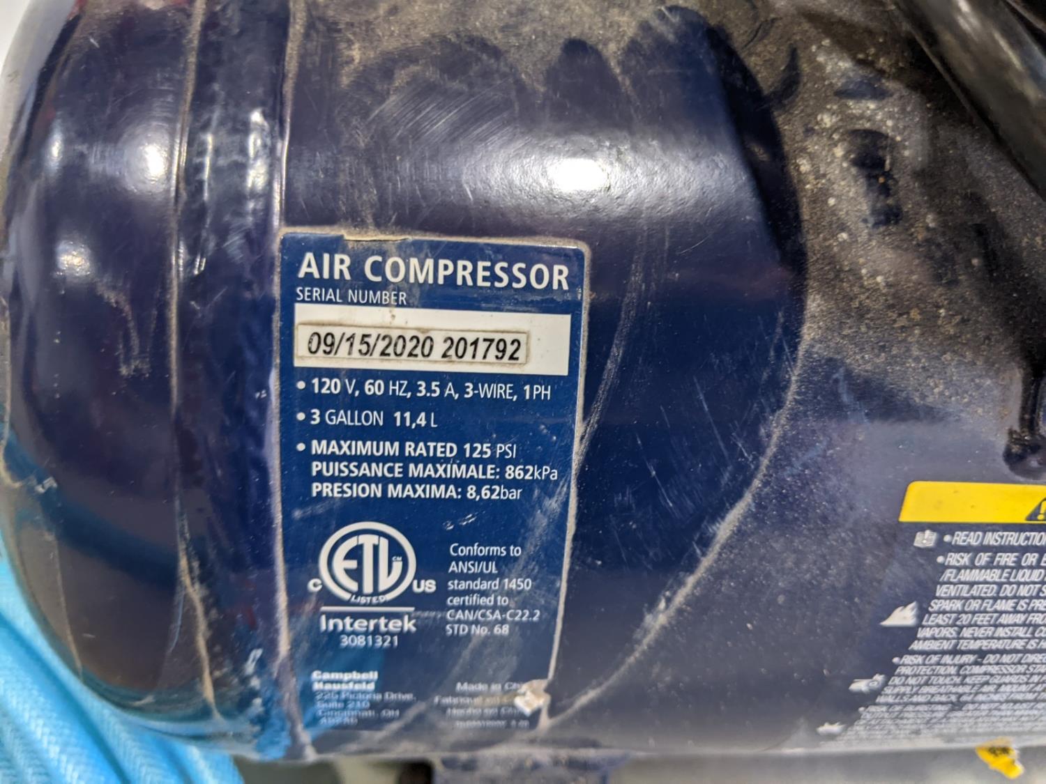 1039 2020 Campbell Hausfeld 3 Gallon Electric Air Compressor