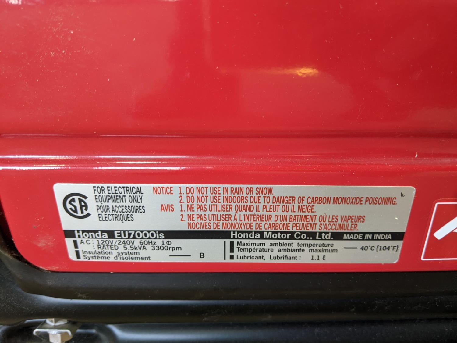 1244 Honda EU7000is 7000 Watt Gasoline Inverter Generator (Unused)