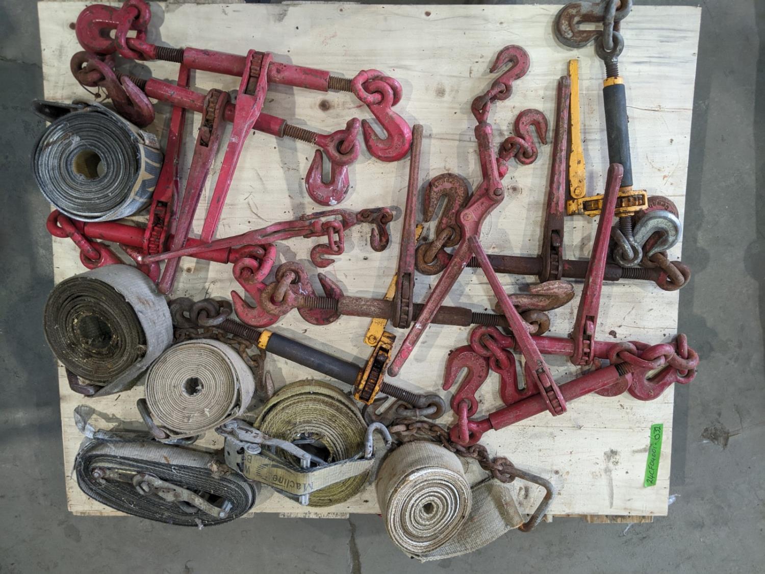 (9) ratchet boomers 1/2 inch - 5/8 inch, (7) snap boomers 5/16 inch - 3/8 inch, (4) 4 inch straps, (2) 2 inch ratchet straps