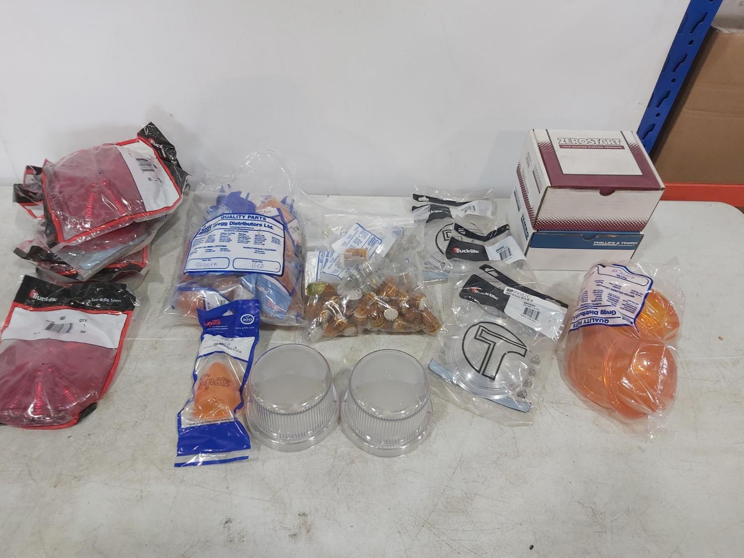 (12) dome light lenses 6-1/2 inch long, (10) replacement lens 17-1/2 inch x 5-1/2 inch, qty of various lenses, qty of LED bulbs, (2) Zerostart starting system parts (no wiring)