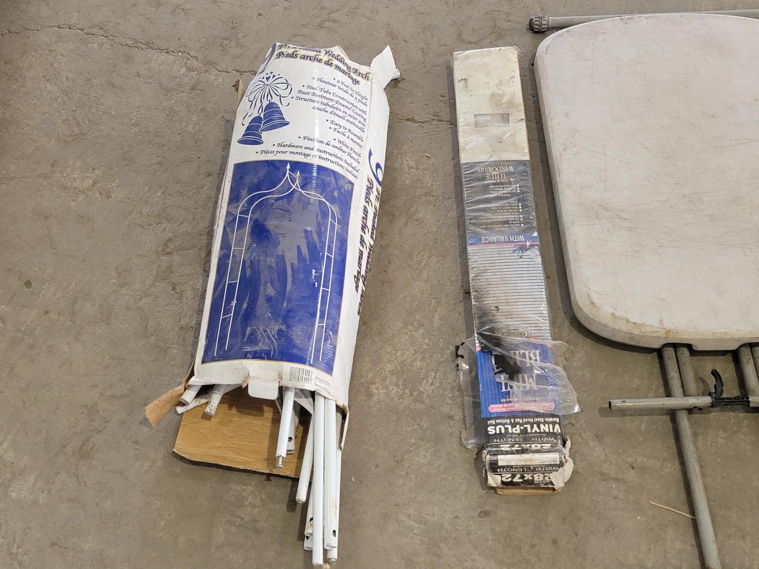 (3) flower boxes, baby gate, wedding arch, rain gutter guard, hip waders, mini blinds