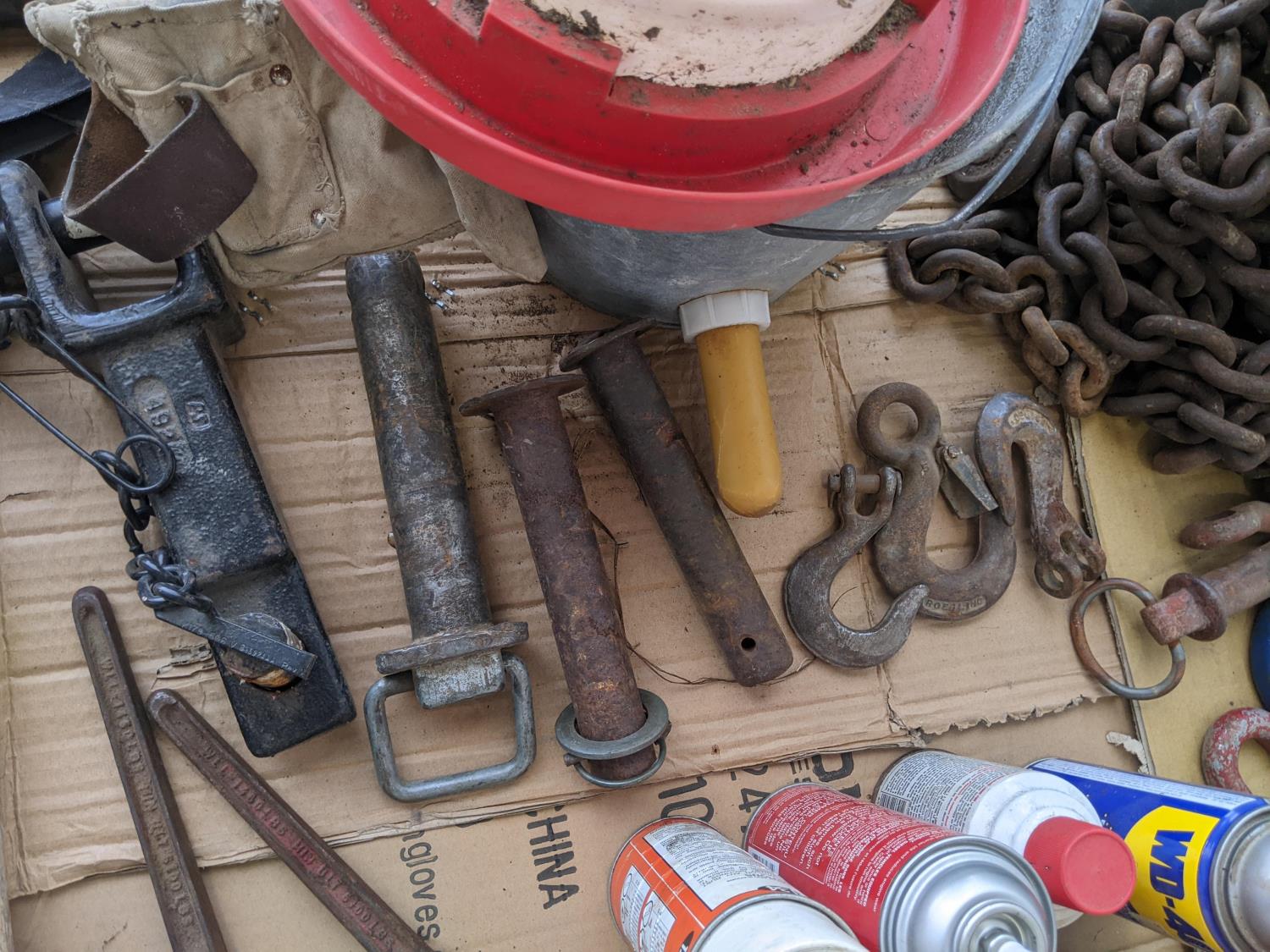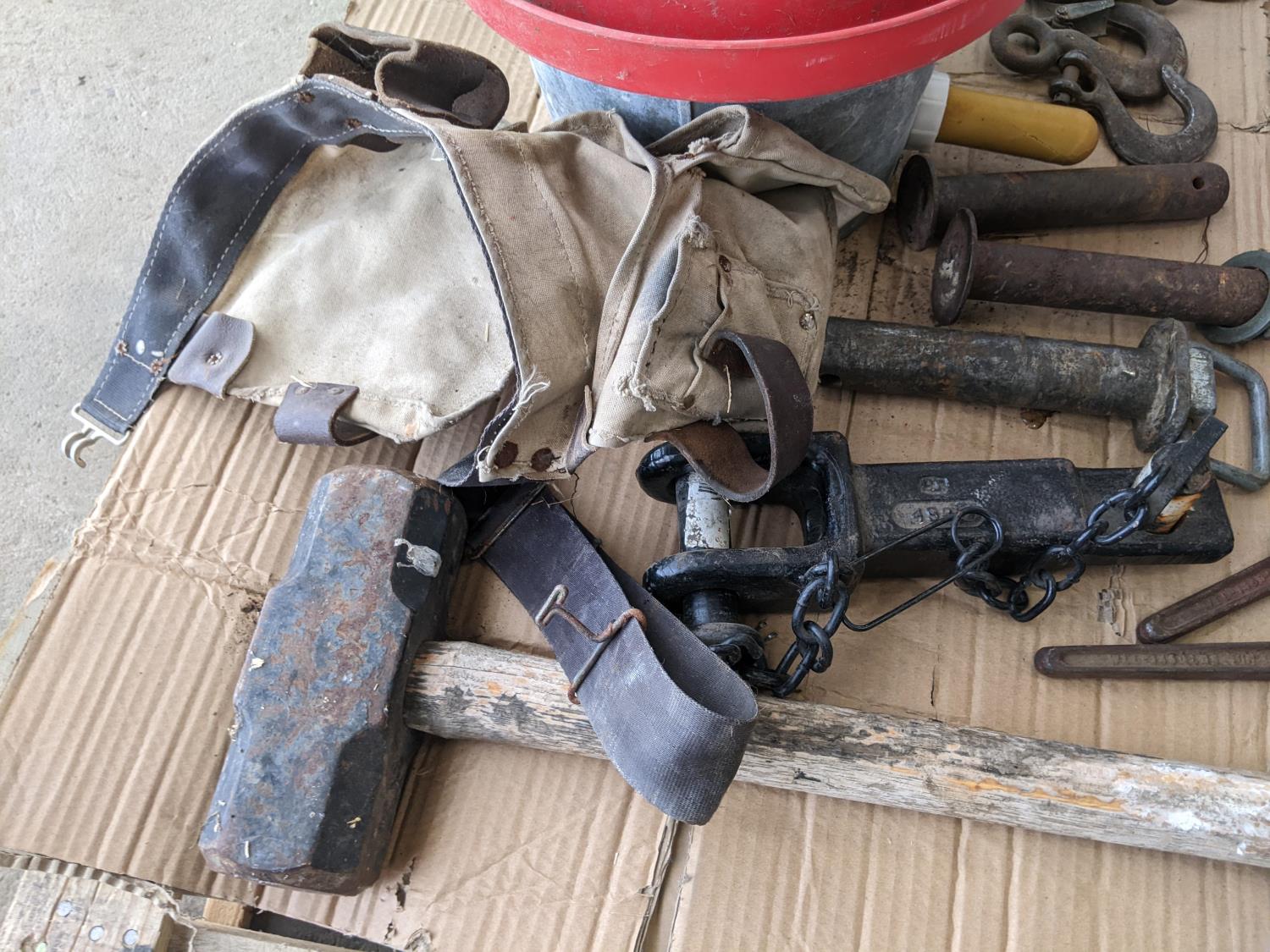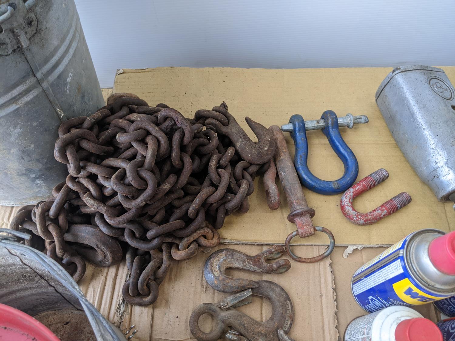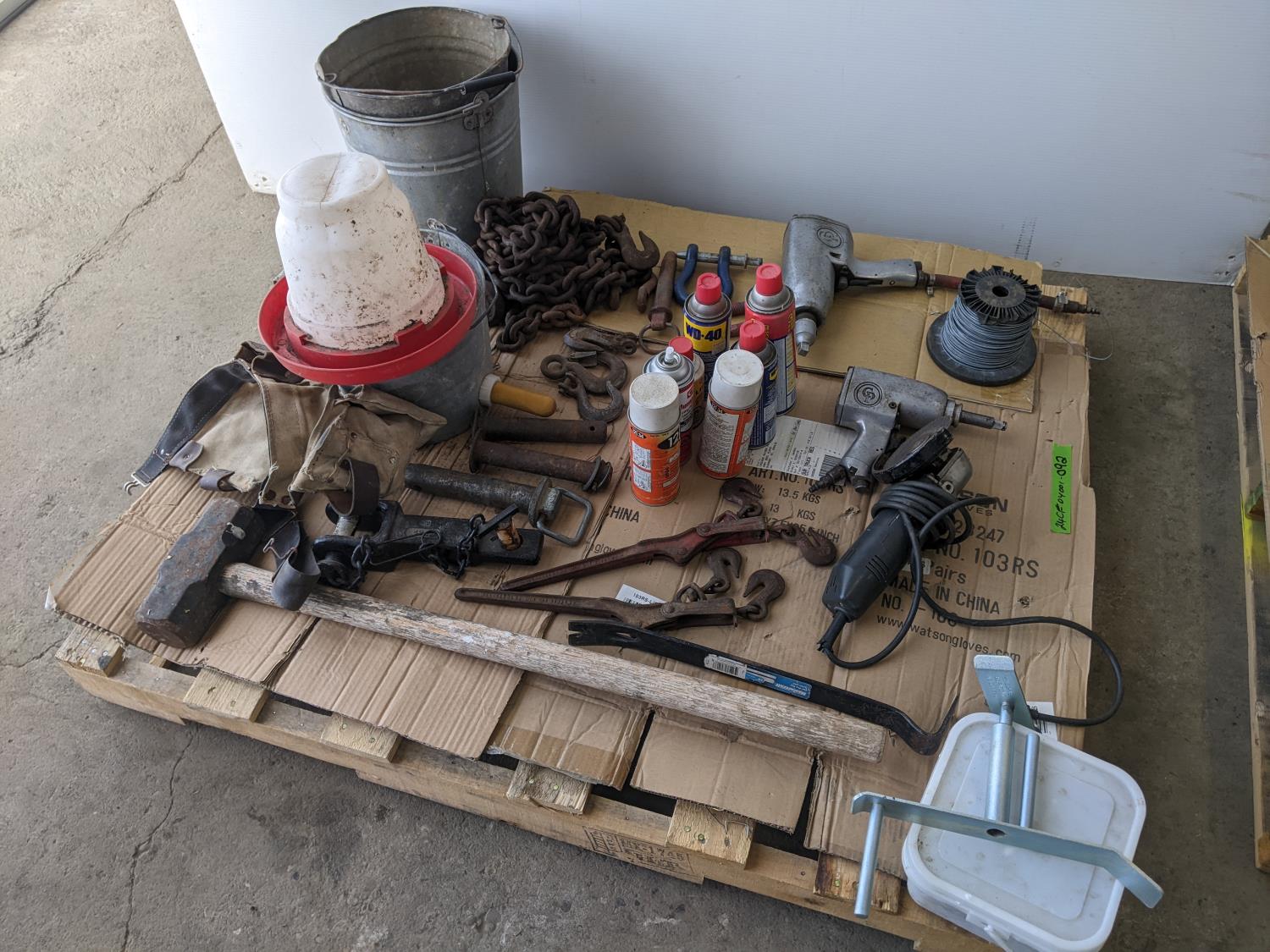 Metal pails, feeders, sledge hammer, strap winder, chain hooks, Chicago Pneumatic 3/4 inch drive air impact, Chicago Pneumatic 1/2 inch drive air impact