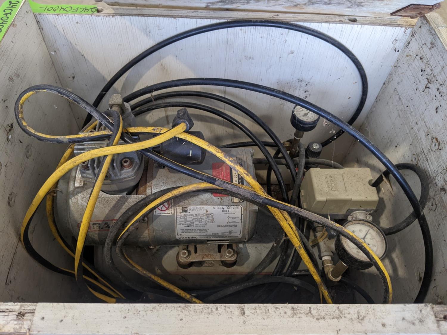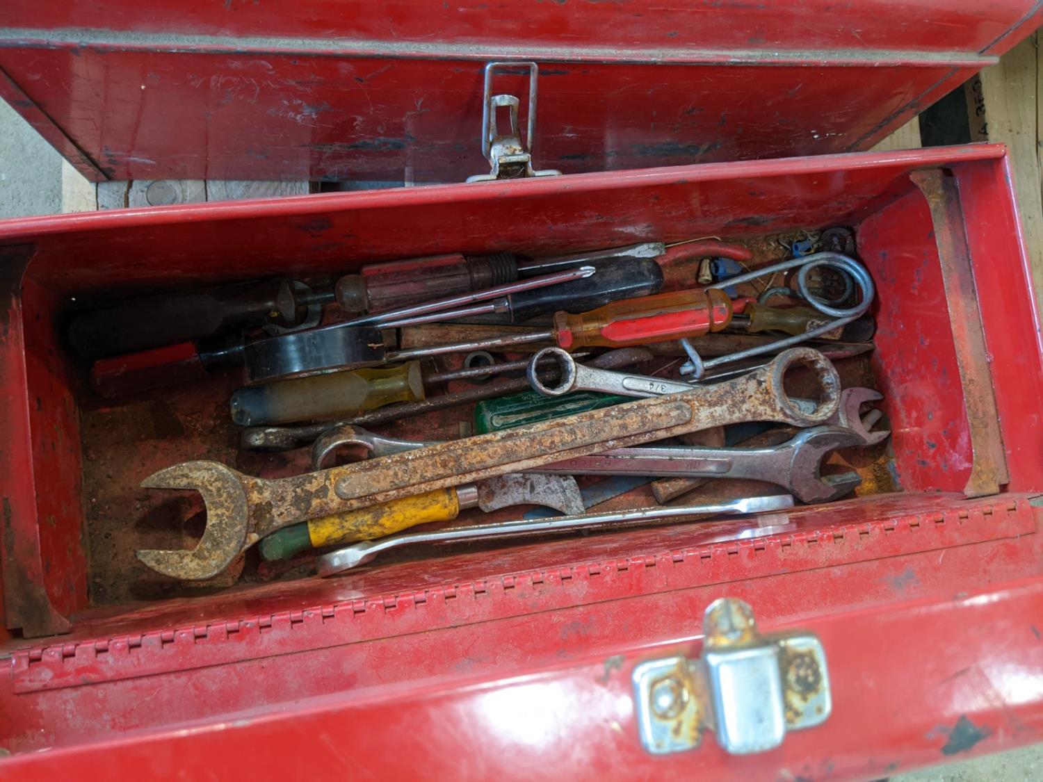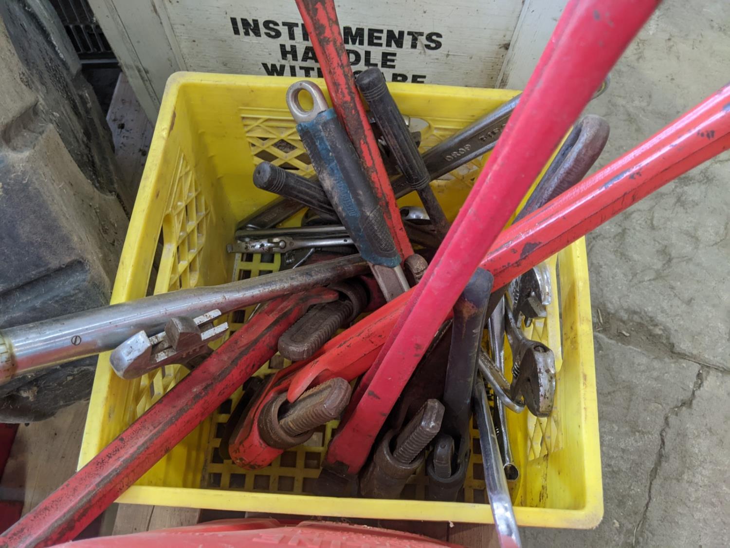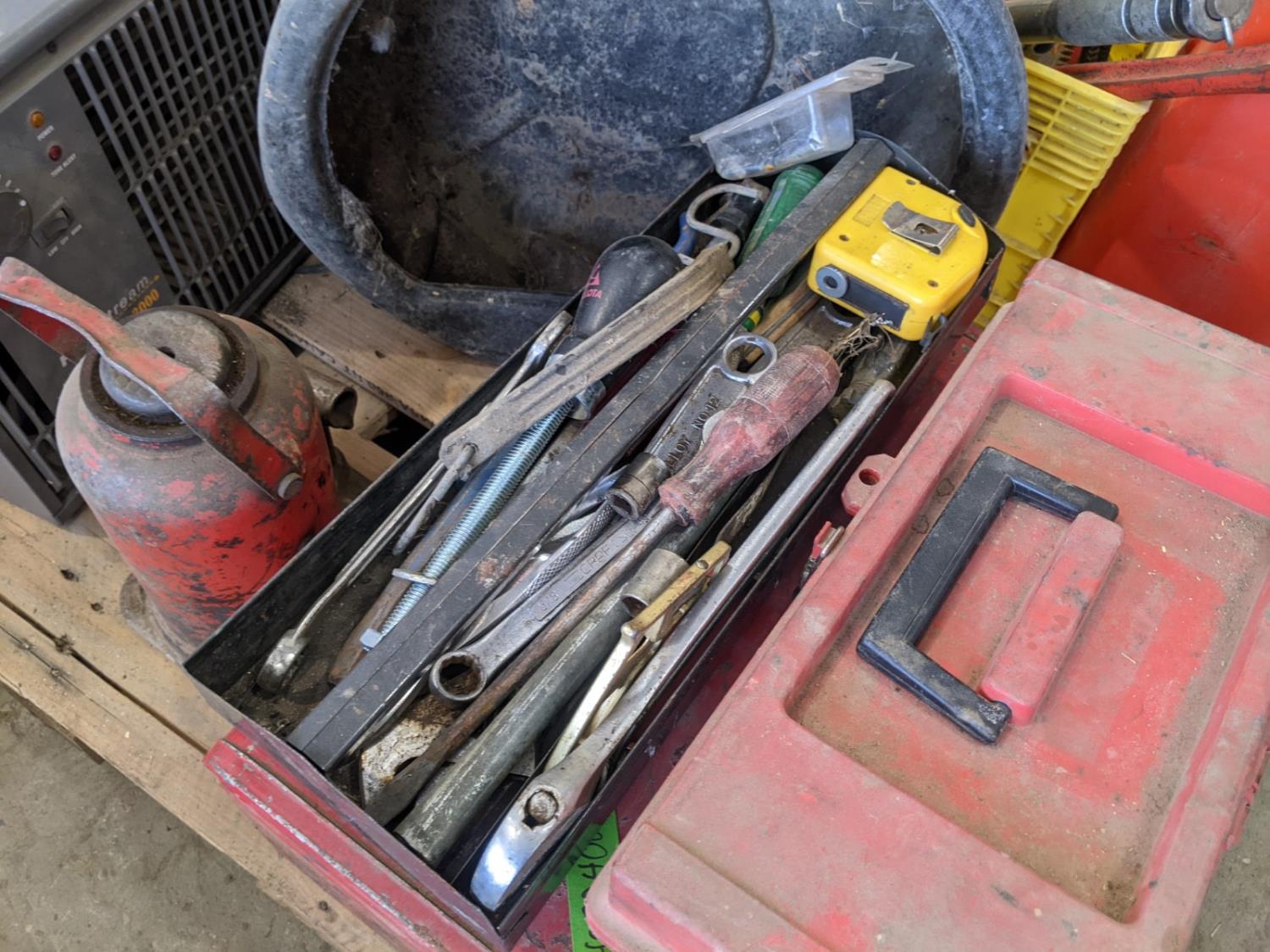 Toolboxes with contents, jerry cans, hand tools, oil pan, bottle jack, heater