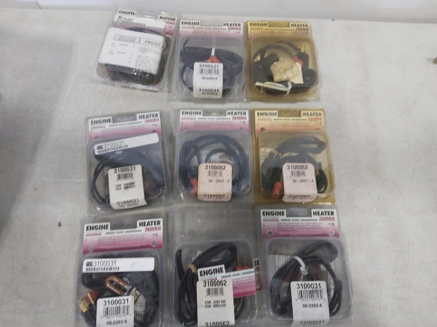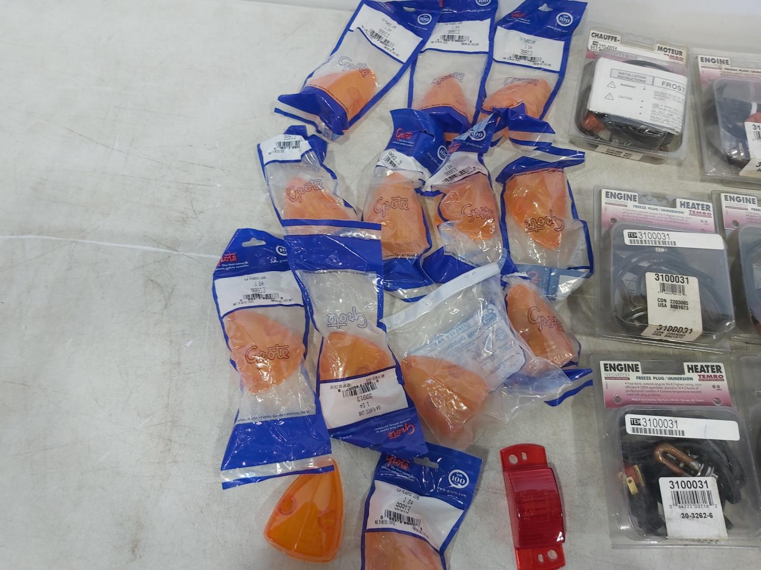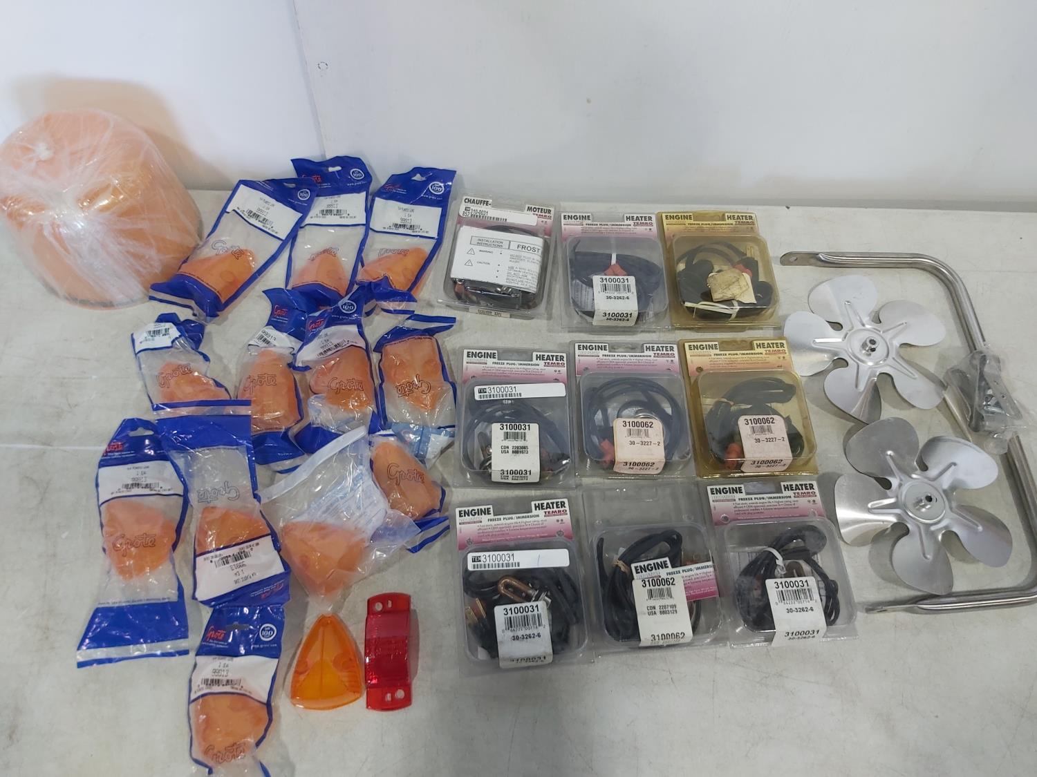 8 inch amber dome lens, (13) amber lens covers, (1) red lens cover, (9) block heater plugs, (2) 8 inch aluminum fan blades, aluminum bracket 17 inch w x 9 inch d