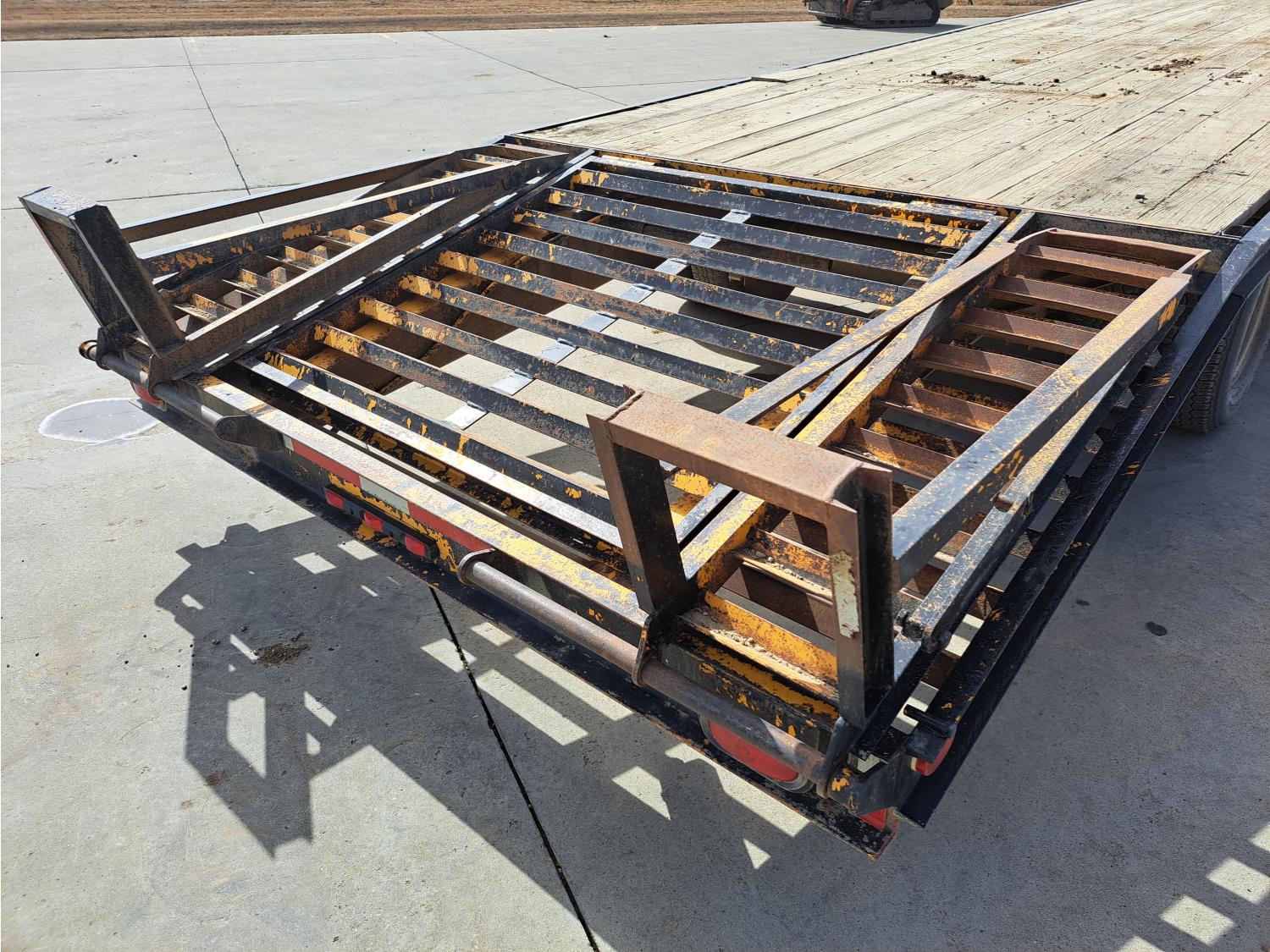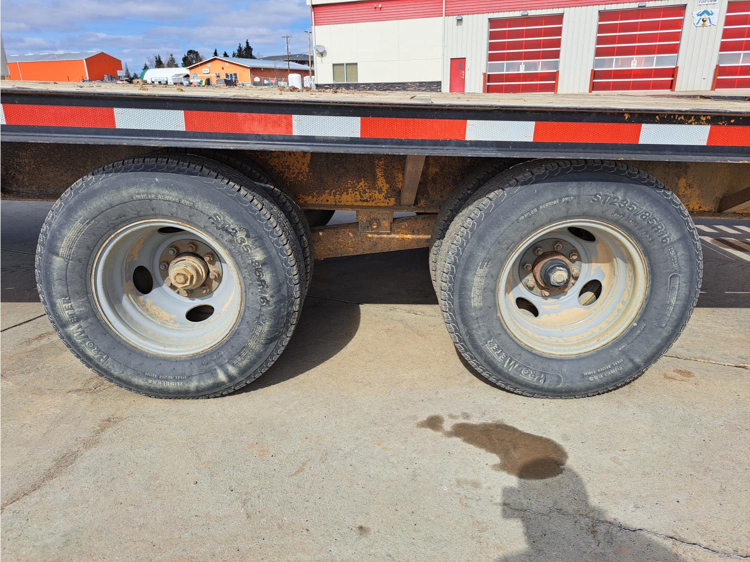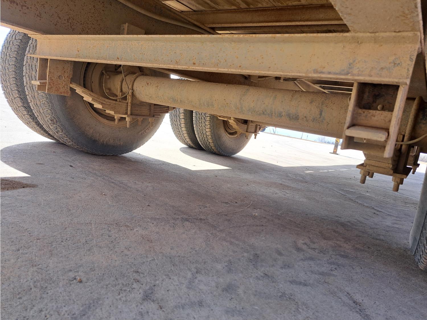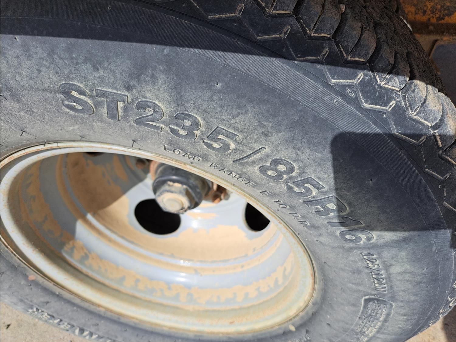100 inch wide deck, wood deck, stake pockets, rub rails, 5 ft beaver tails, spring suspension, 235/85R16 tires