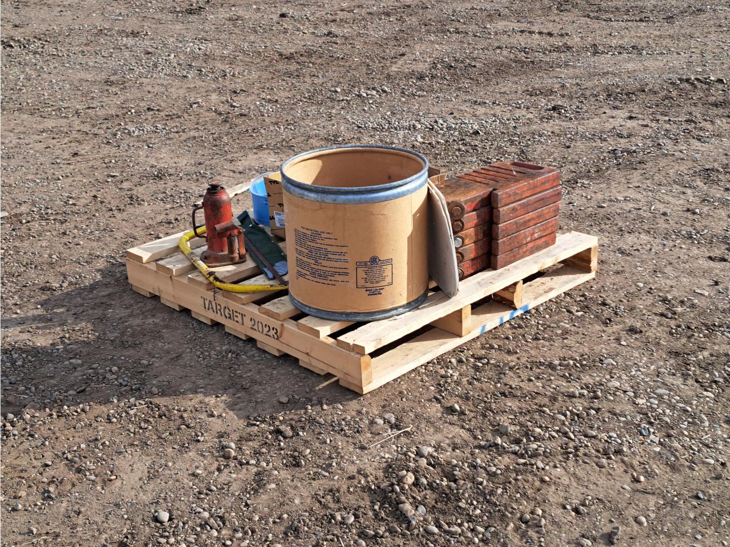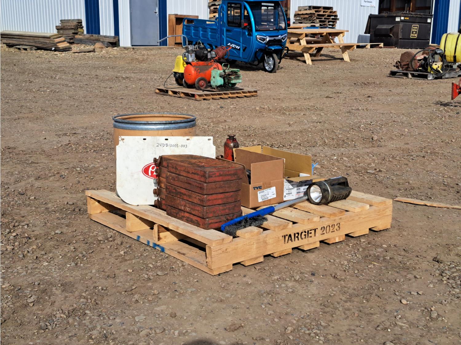 hydraulic jack, 1998 GMC tail lights, saw, tractor weights and miscellaneous