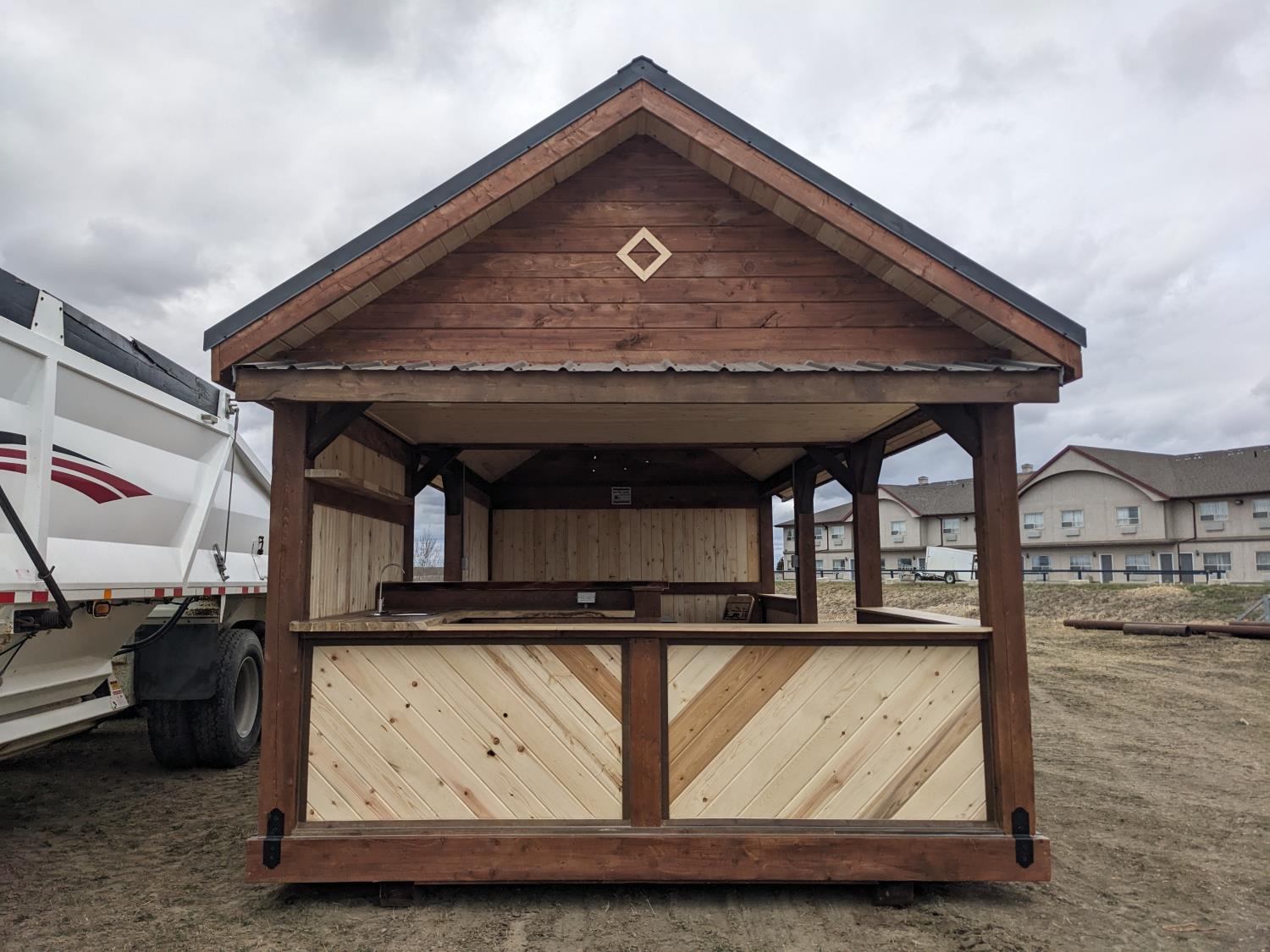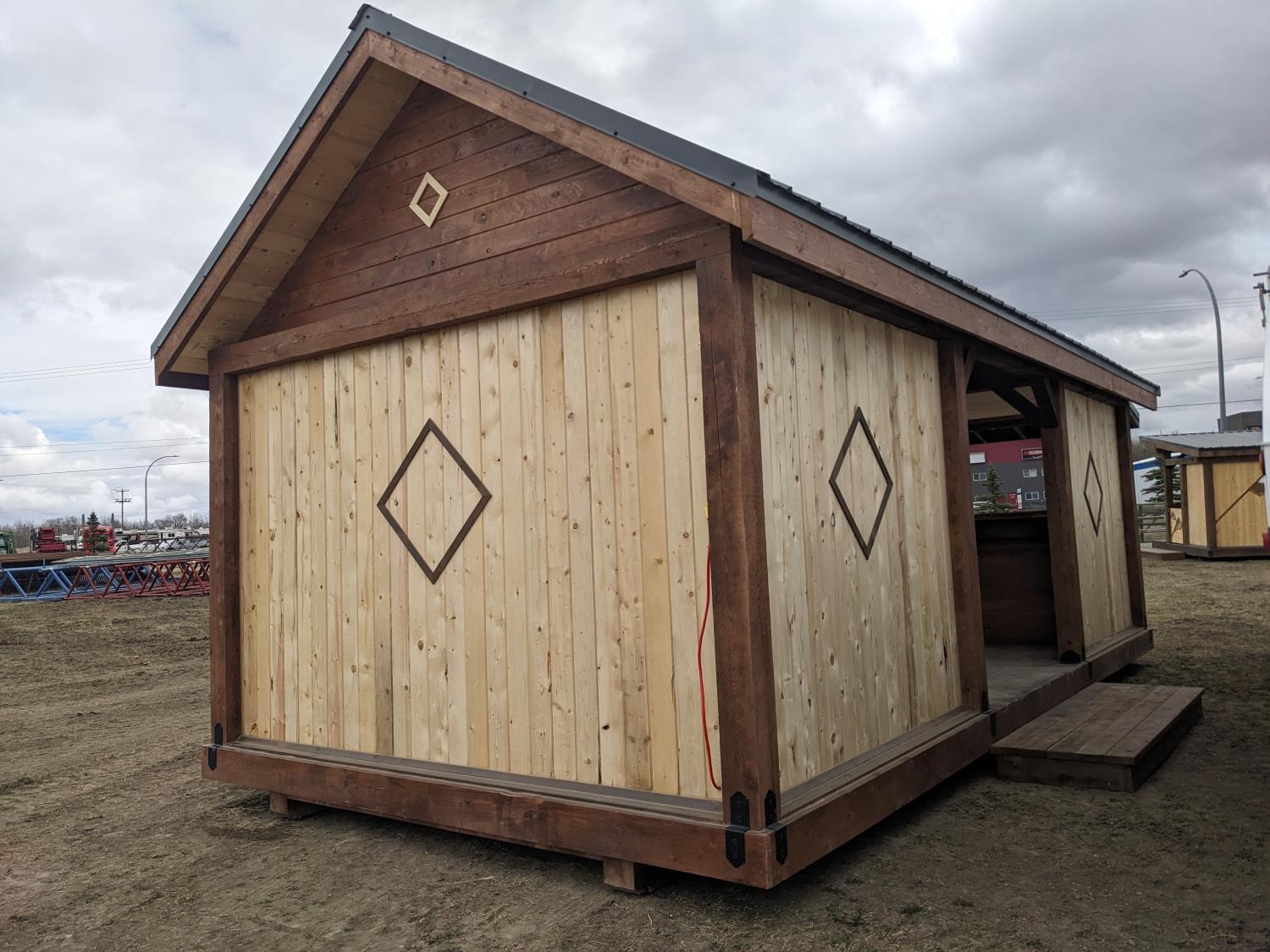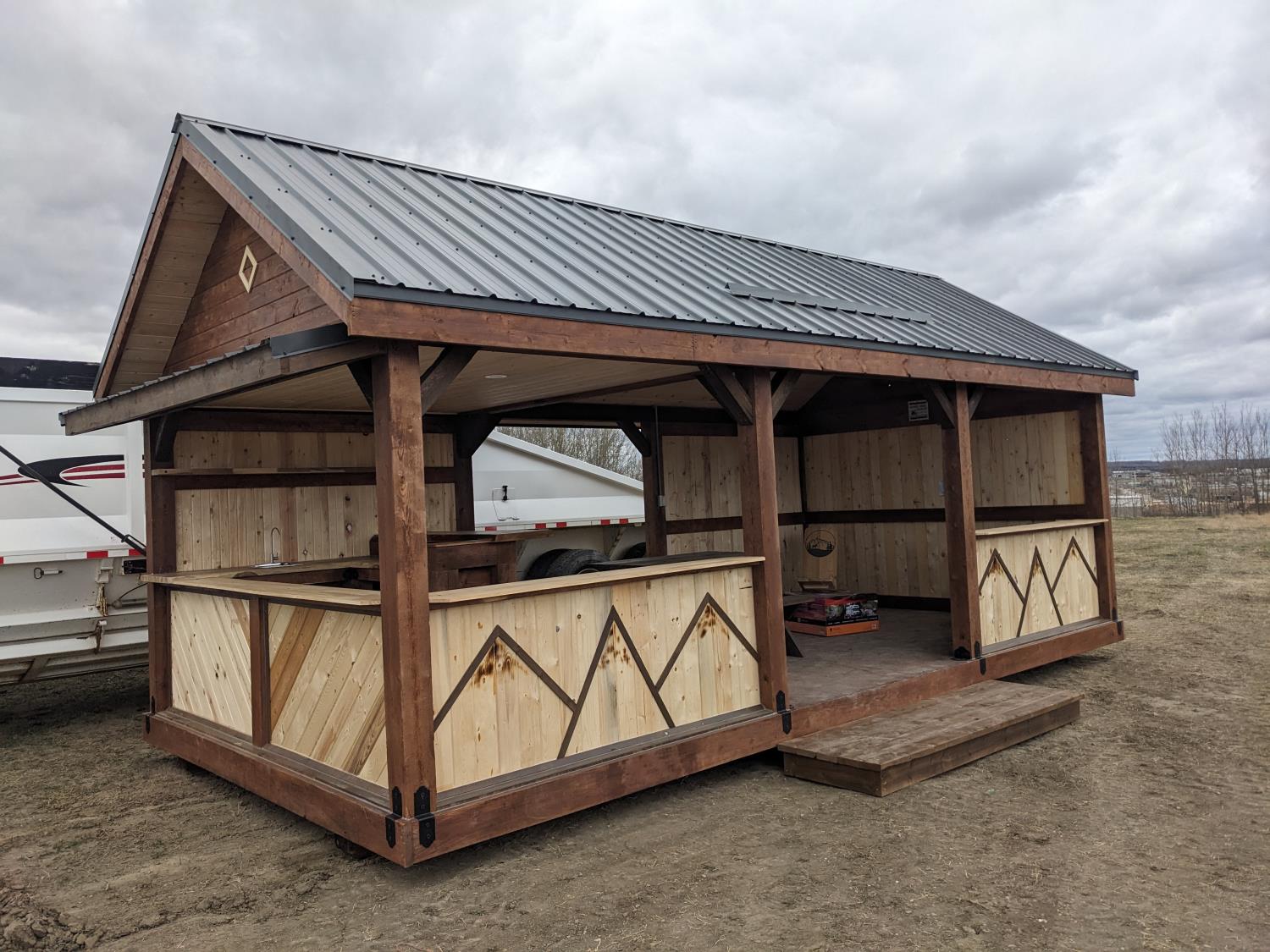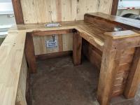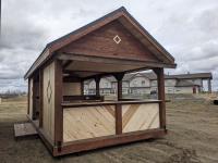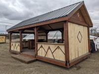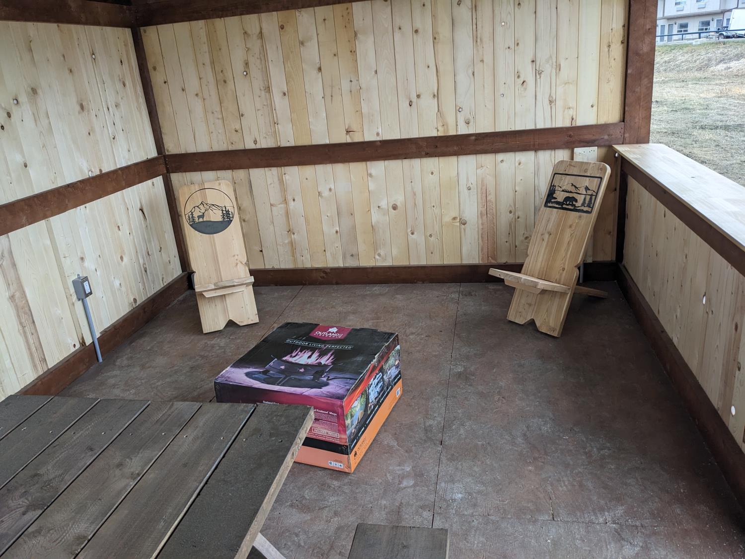 timber structure, metal roof, loft storage, pot lights and outlets wired for generator hookup, kitchen sink, comes with picnic table (2) chairs, and propane firepit