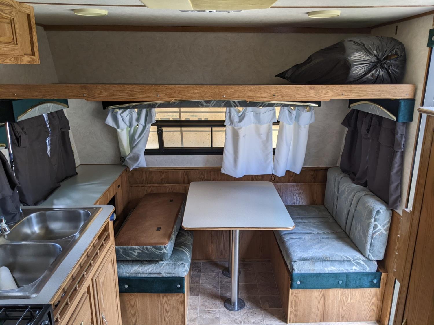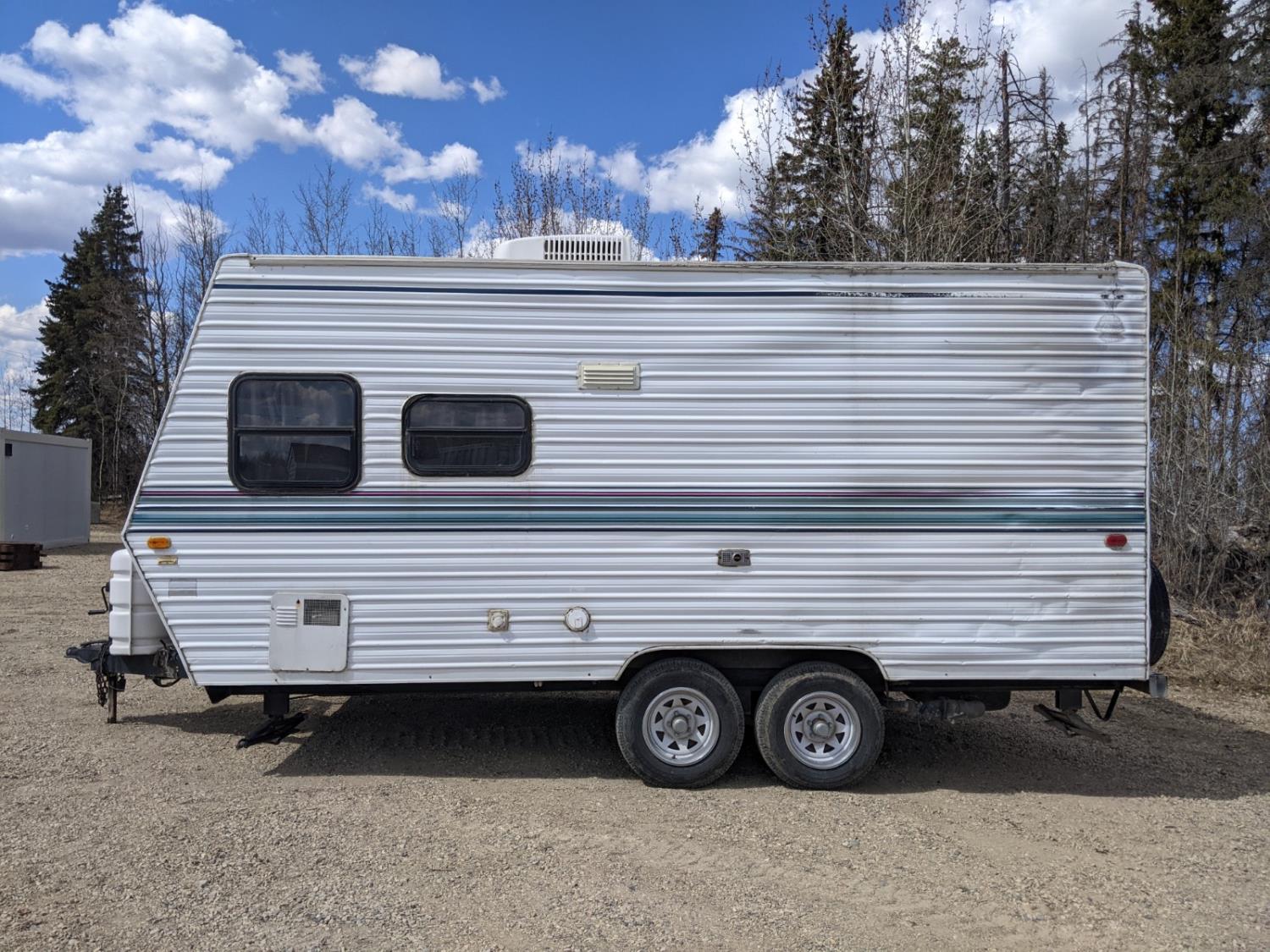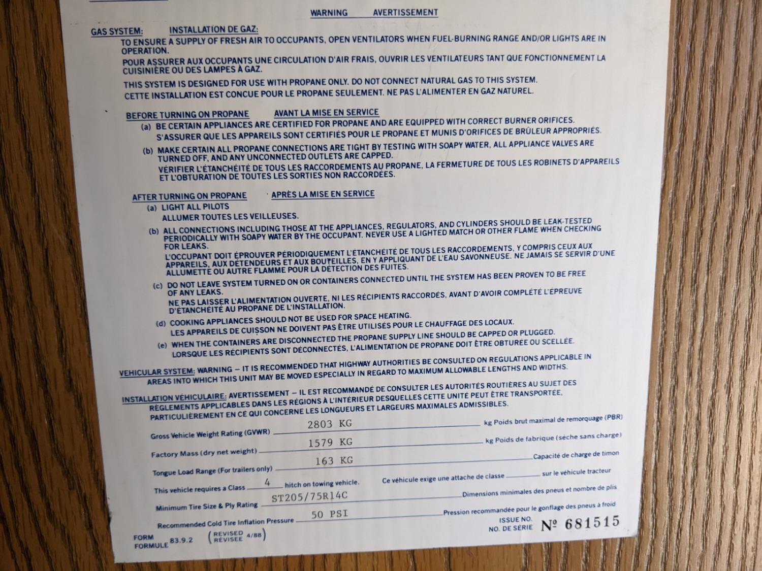 Sleeps 4, stove, fridge, microwave, full bath, master bedroom, manual awning, spring suspension, AC not working, 205/75R14 tires