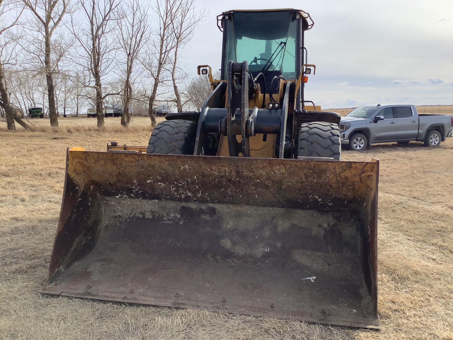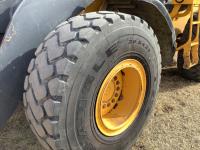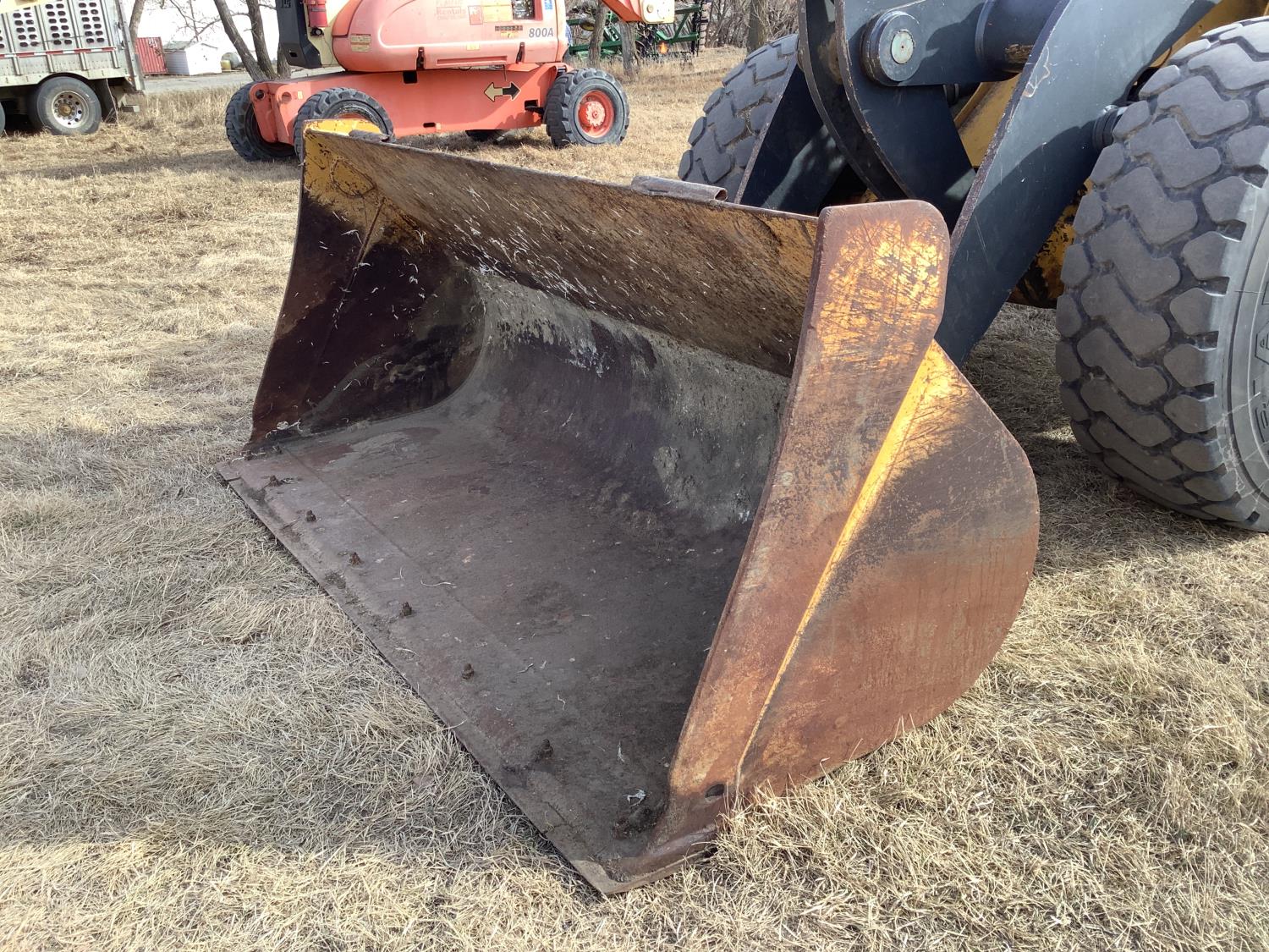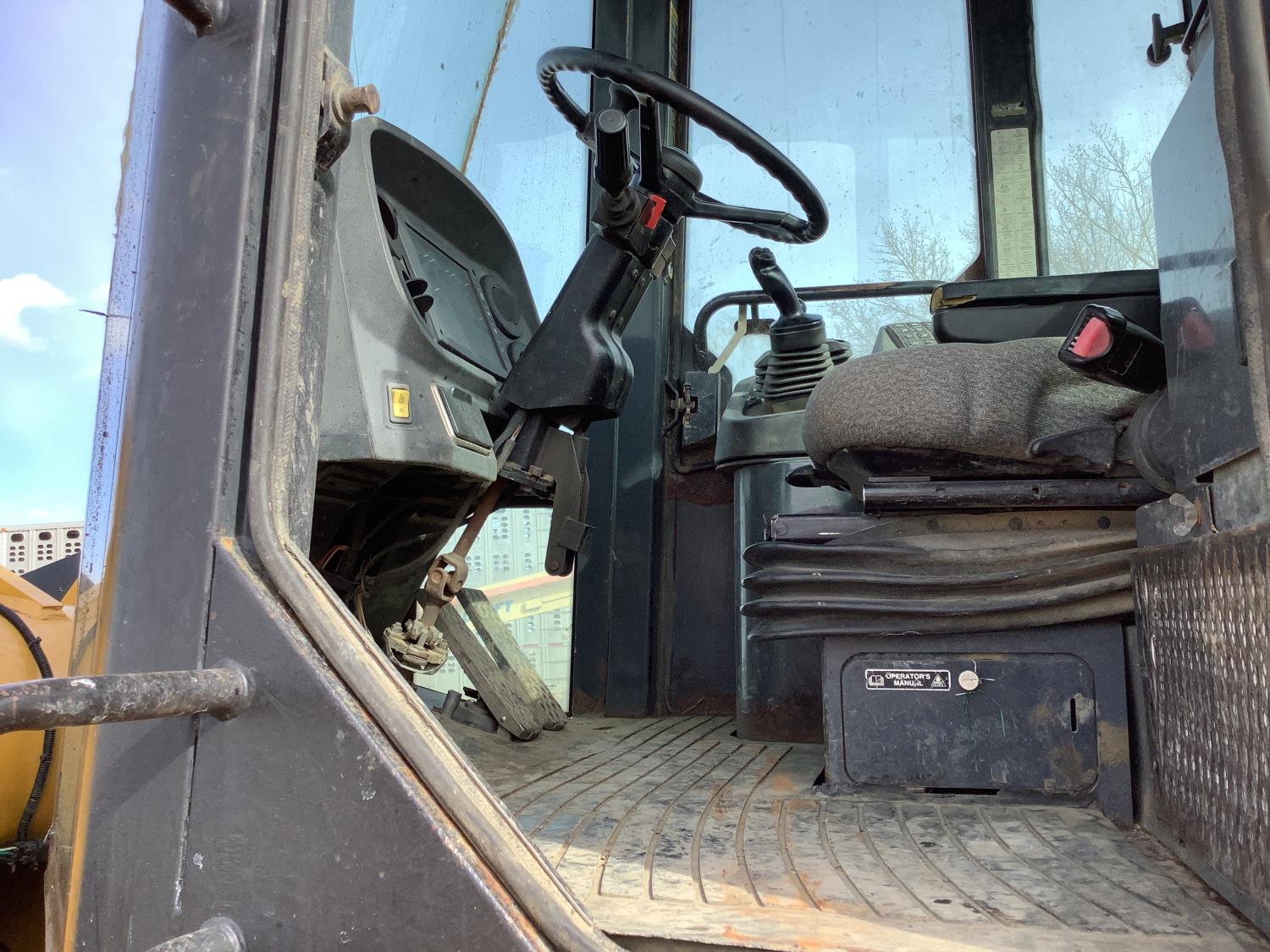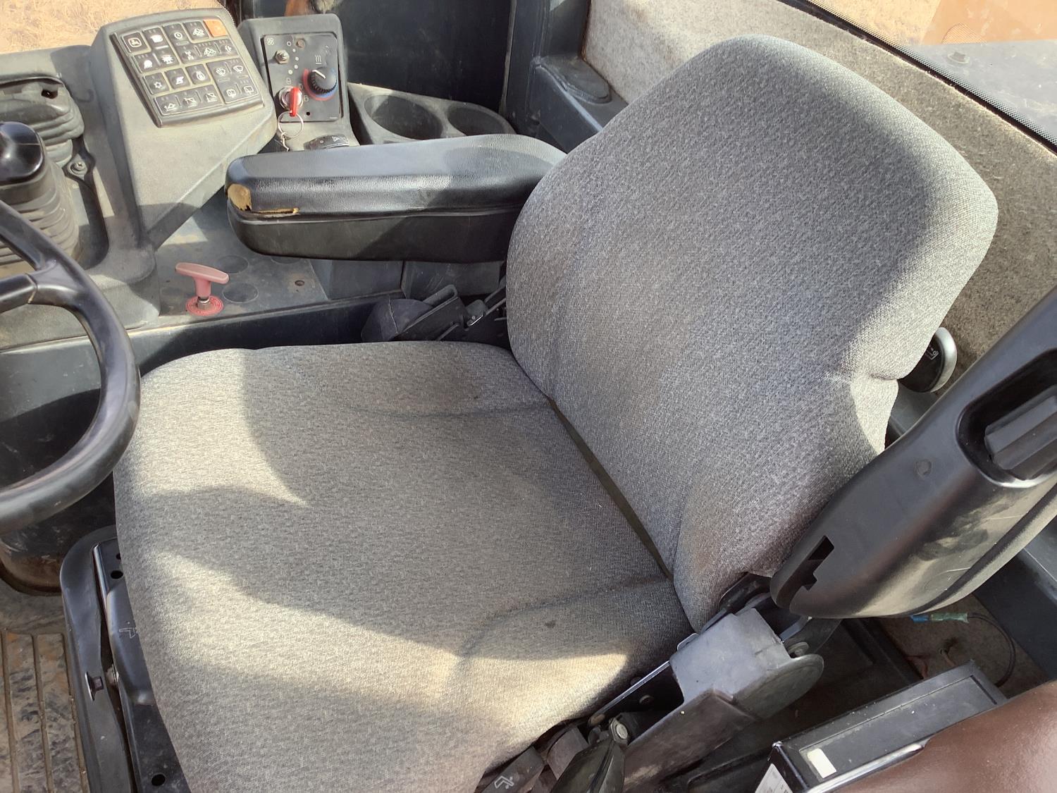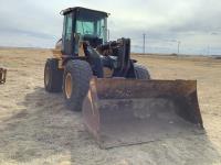 Enclosed cab, A/C, smooth bucket, manual coupler, 1 auxiliary hydraulics, John Deere 3 yard bucket, 20.5-25 tires