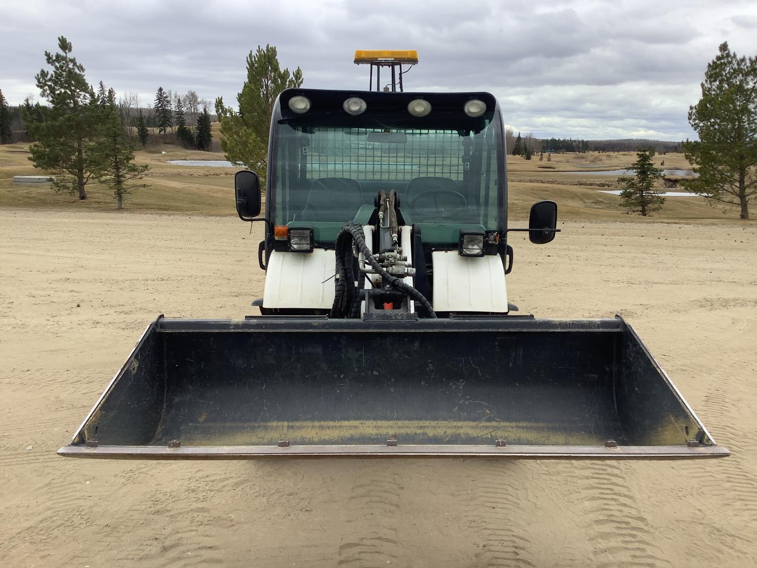 61 HP diesel engine, high/lo transmission, cab, AC, heat, aux hydraulics, dump box, front end loader, Q/A 72 inch bucket, rear receiver hitch