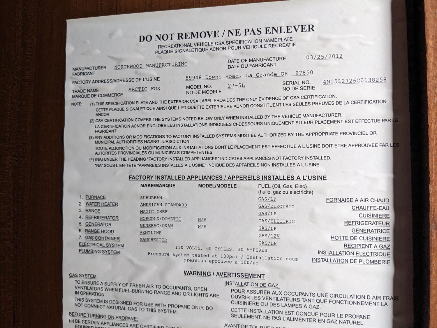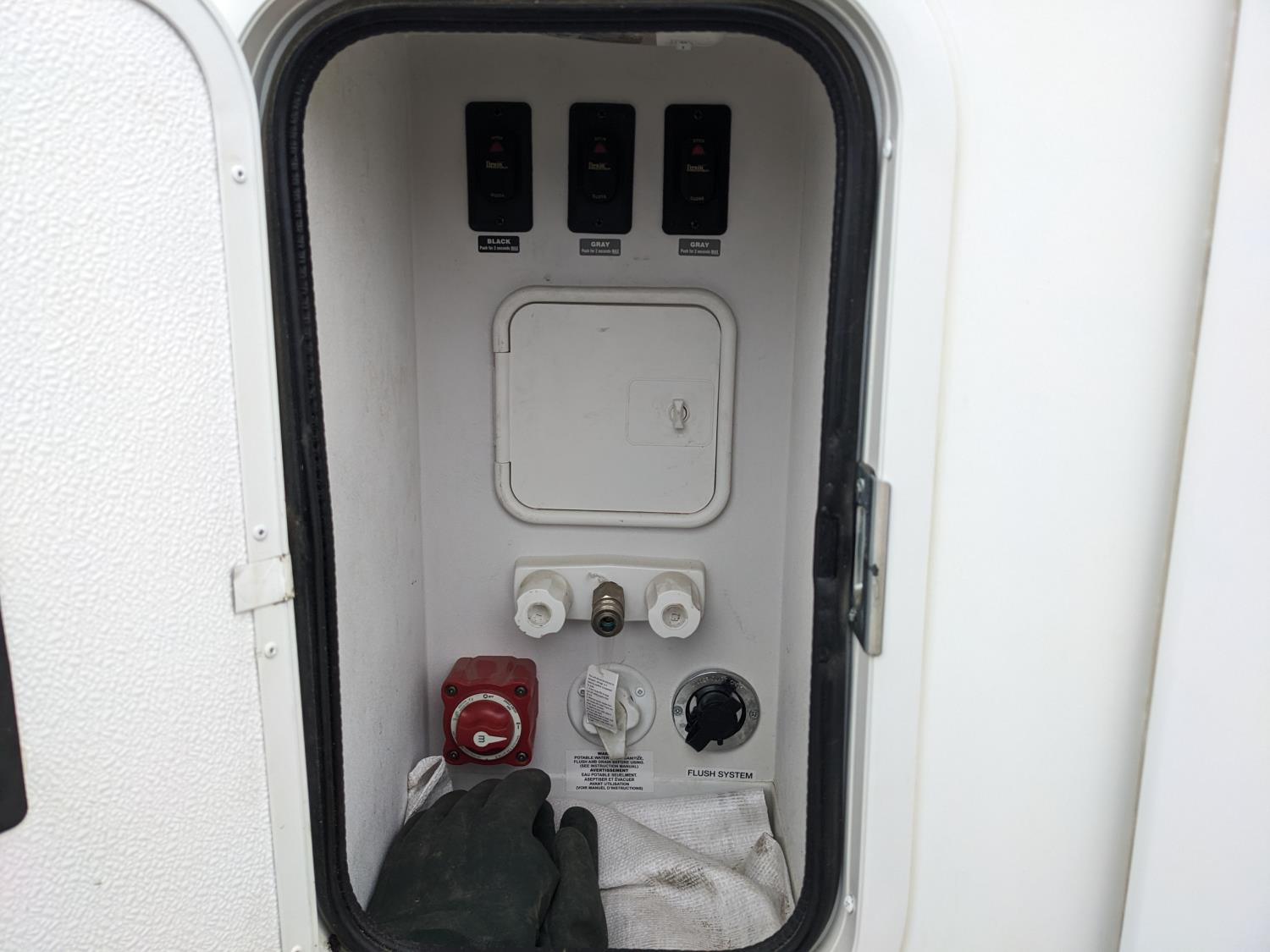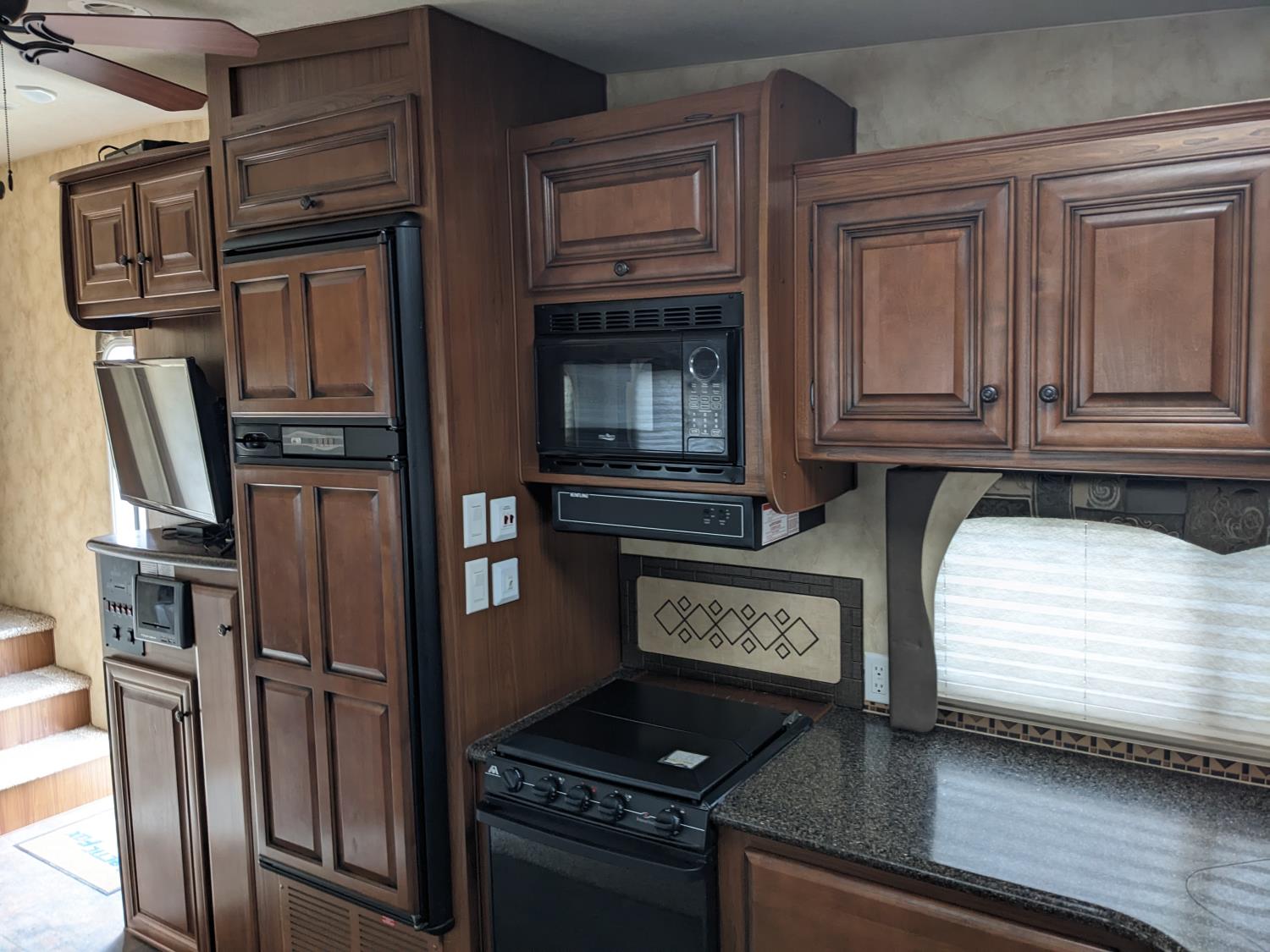 Sleeps 4, stove, fridge, microwave, full bath, master bedroom, A/C, outdoor shower, 2 slides, power awning, power levelling jacks, spring suspension, electric brakes, roof mounted satellite dish, solar panels, 235/80R16 tires