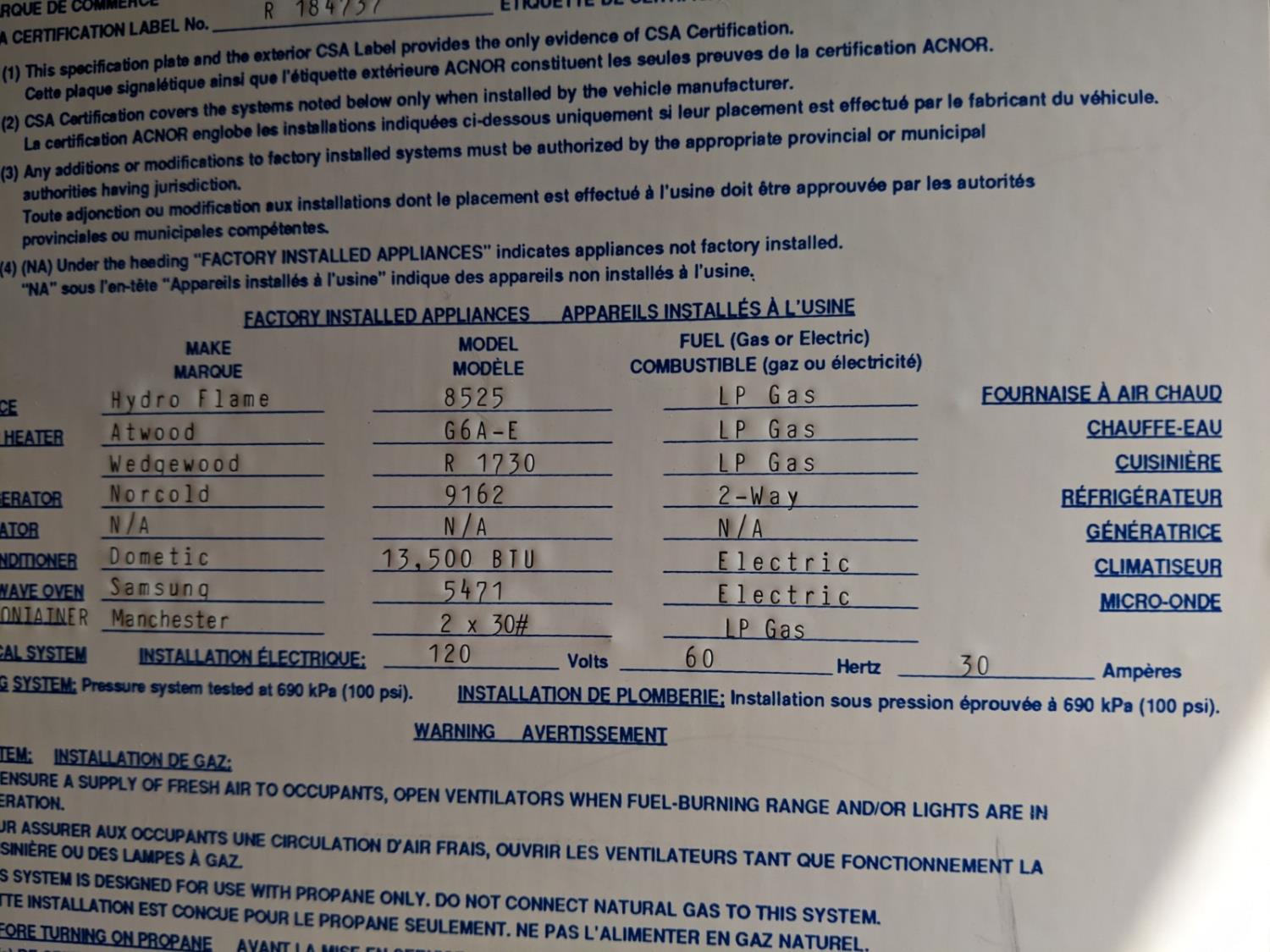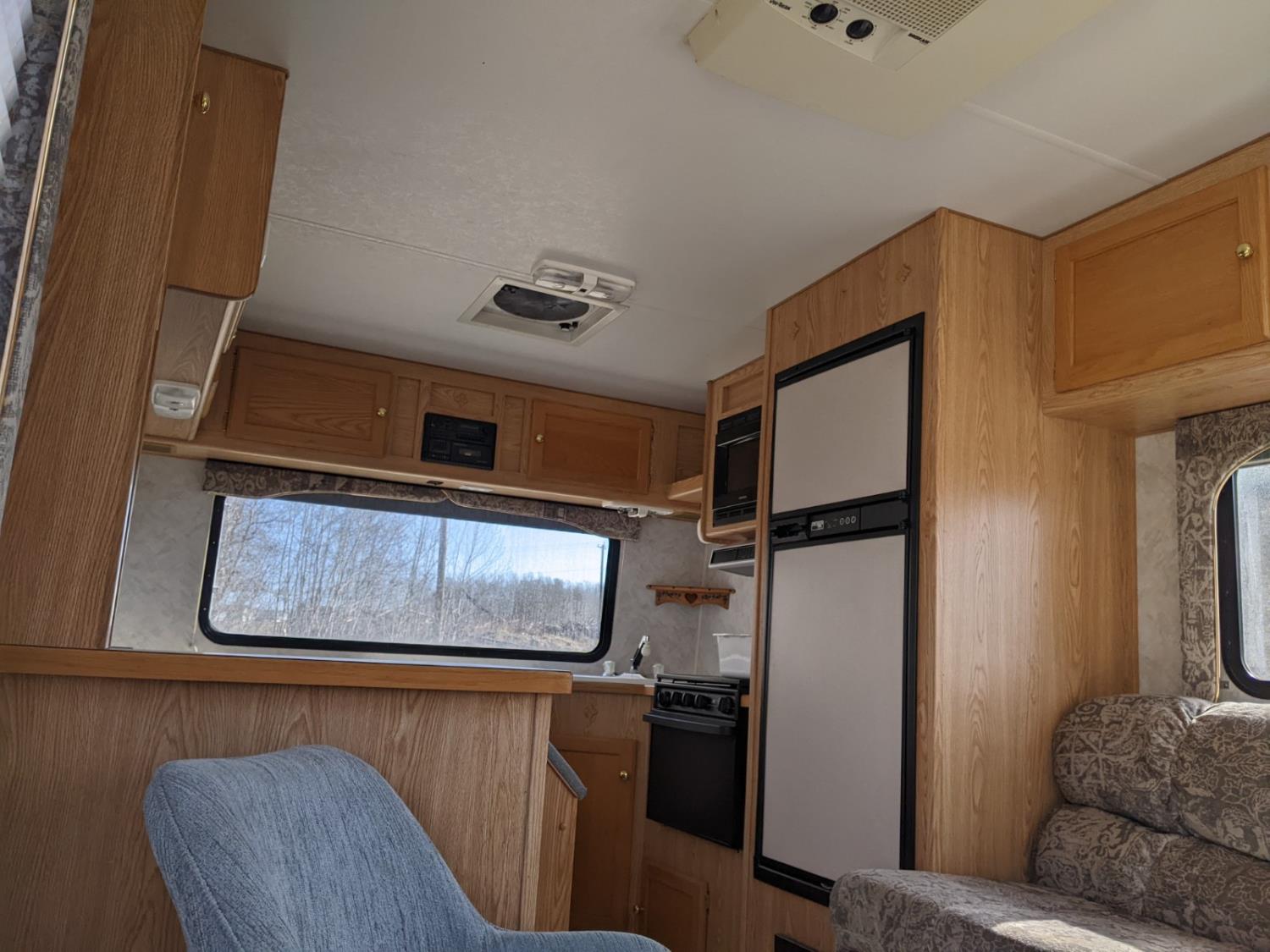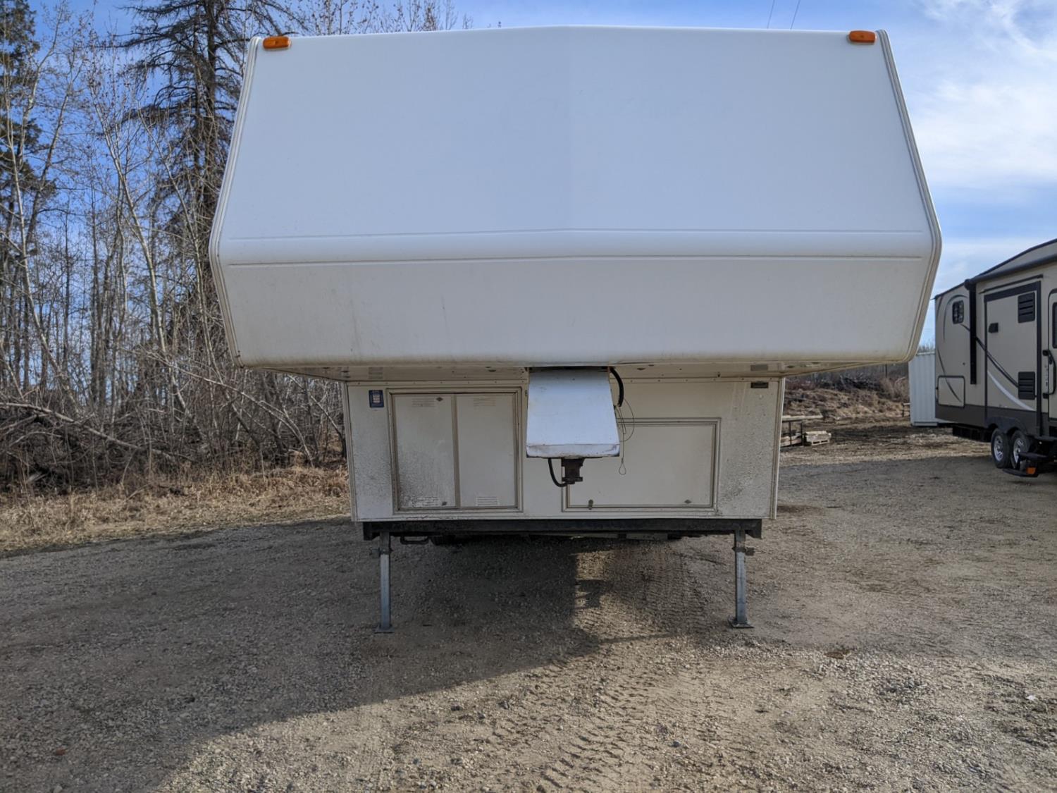 Sleeps 4, stove, fridge, microwave, full bath, master bedroom, A/C, manual awning, power levelling jacks, spring suspension, electric brakes, 225/75R15 tires